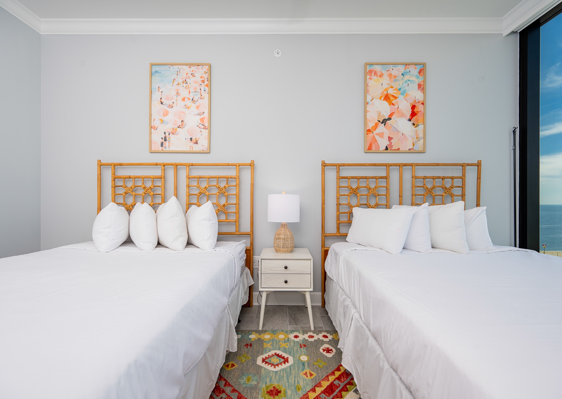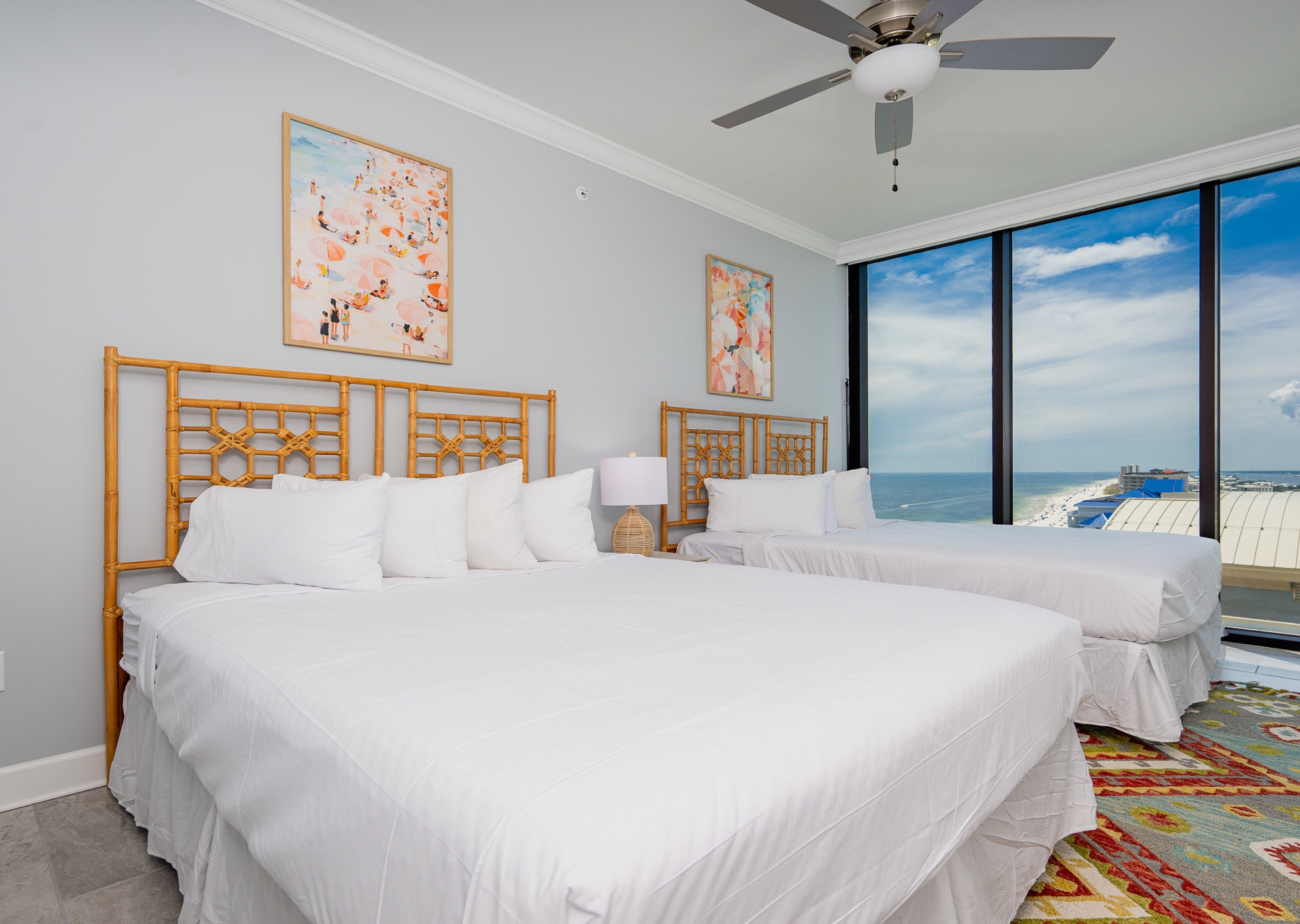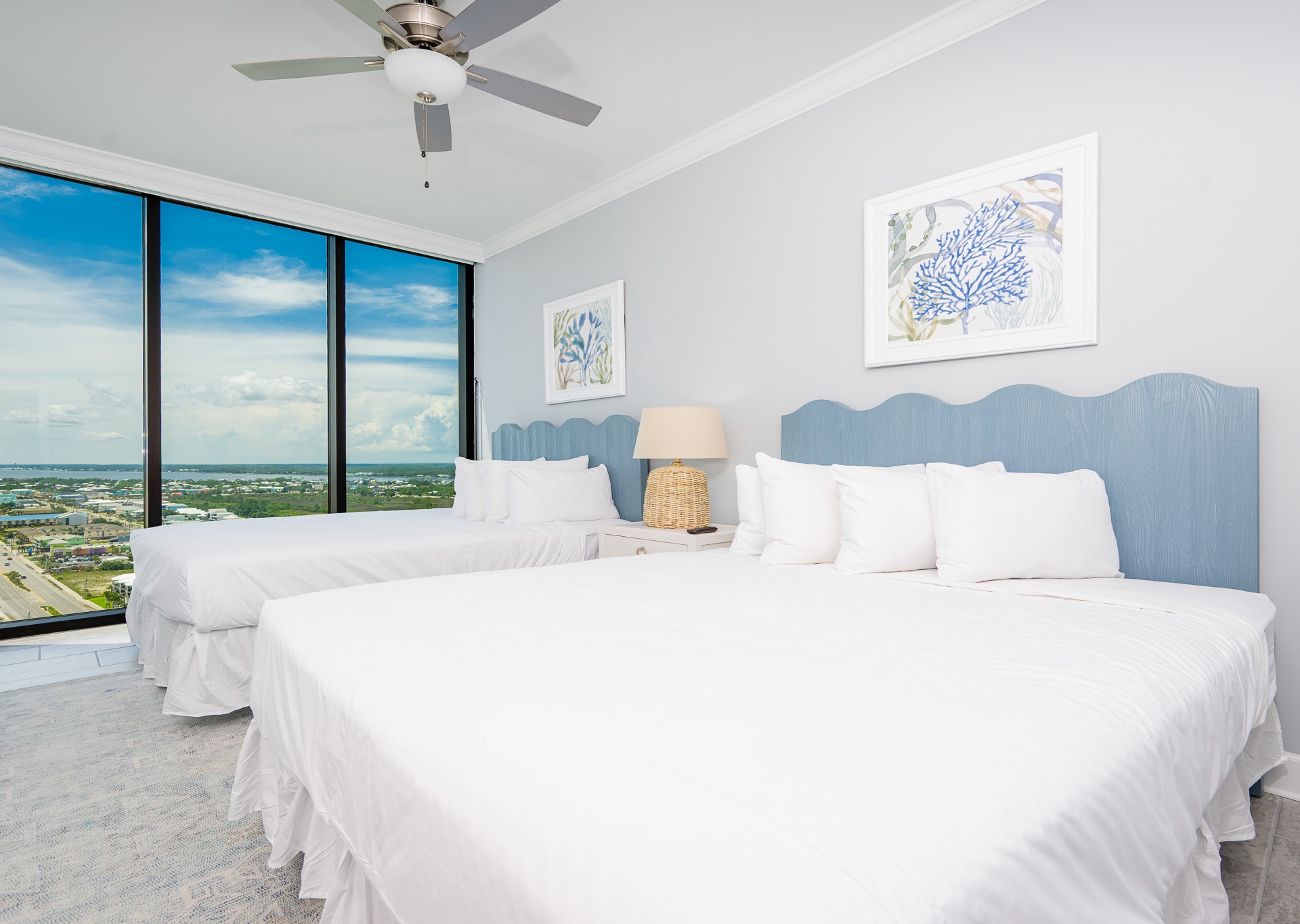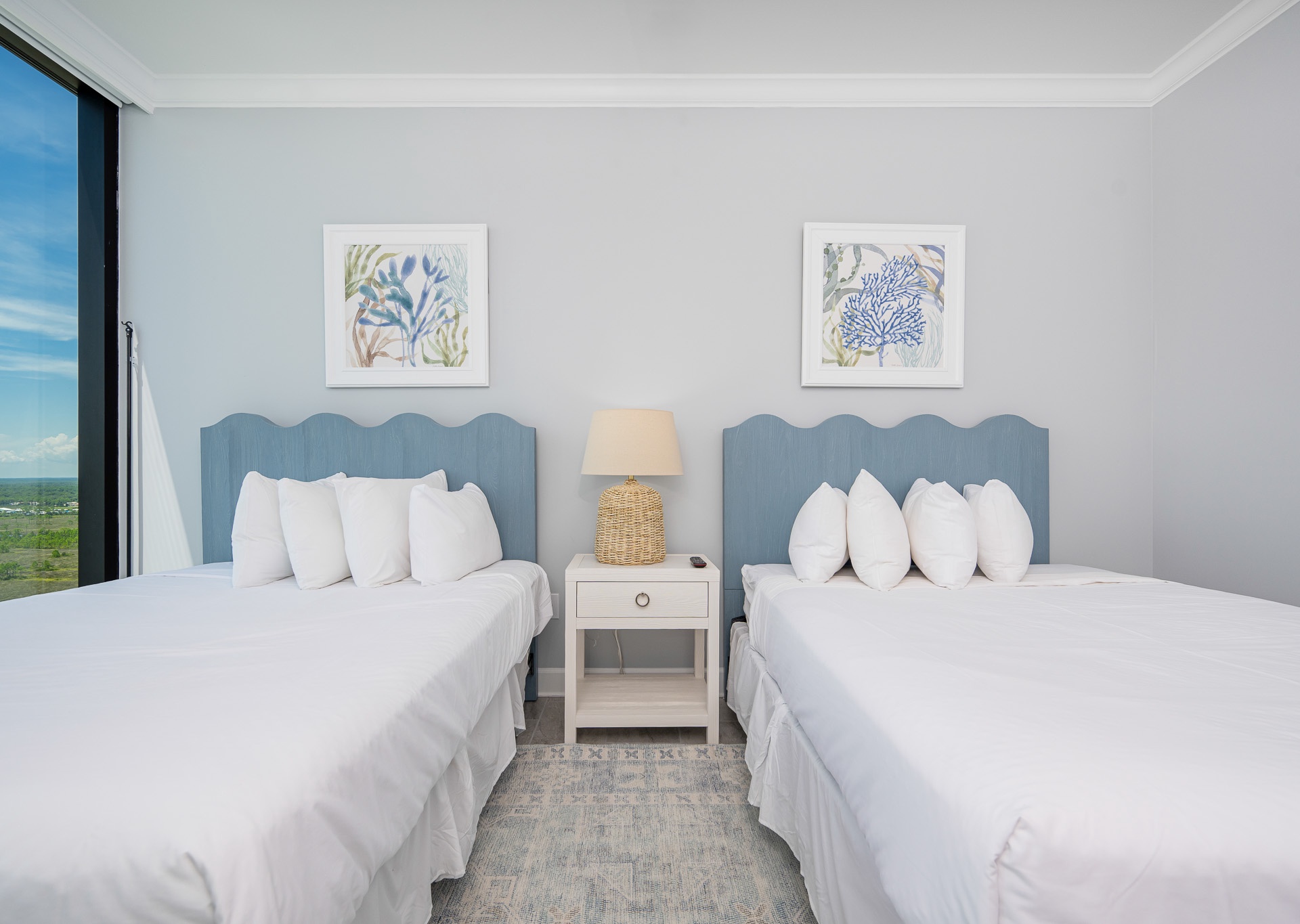 • Second & Third Bedrooms – Each with two queen beds, floor-to-ceiling windows, Gulf views, flat-screen TVs, and private baths with single vanities and walk-in showers.