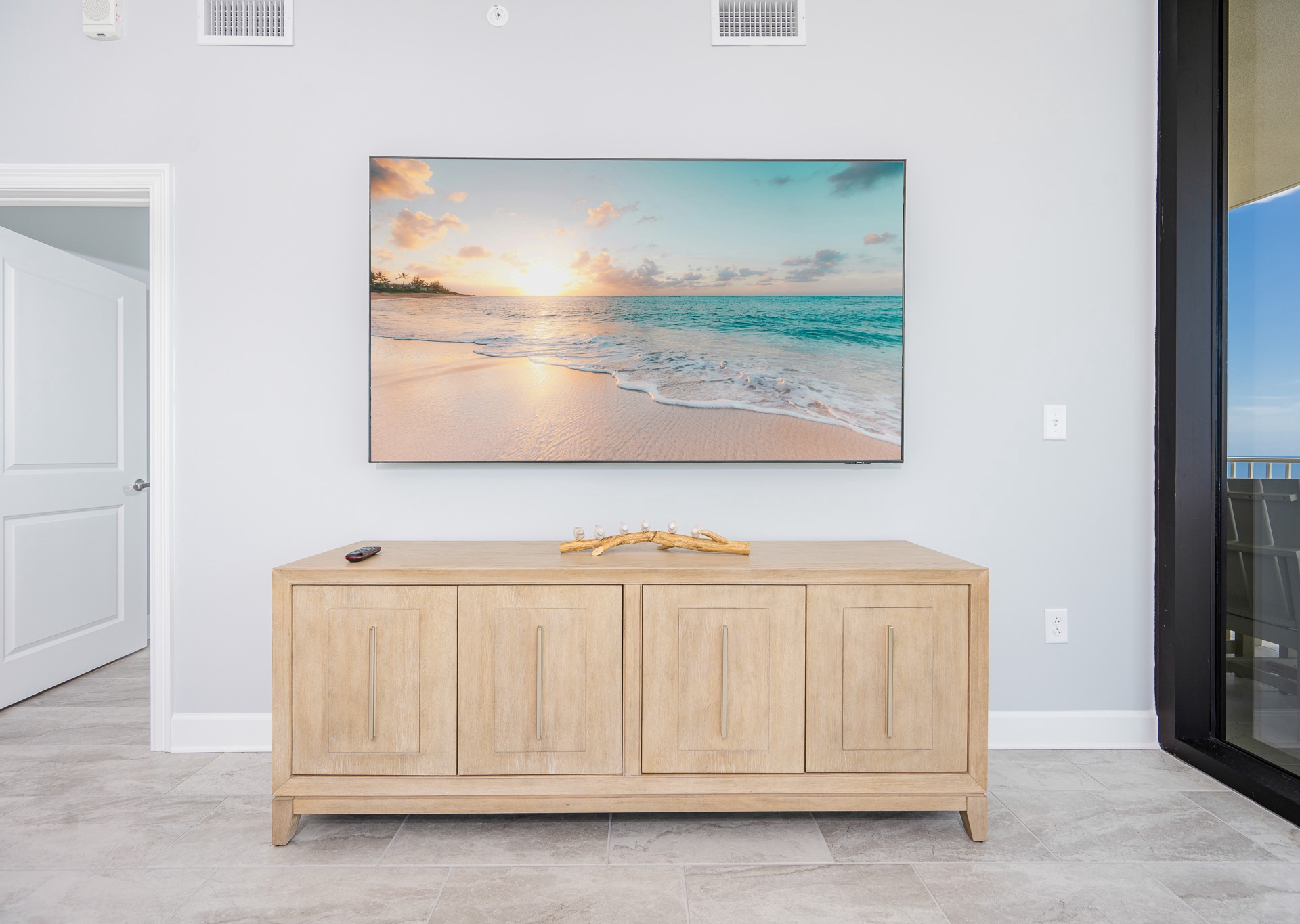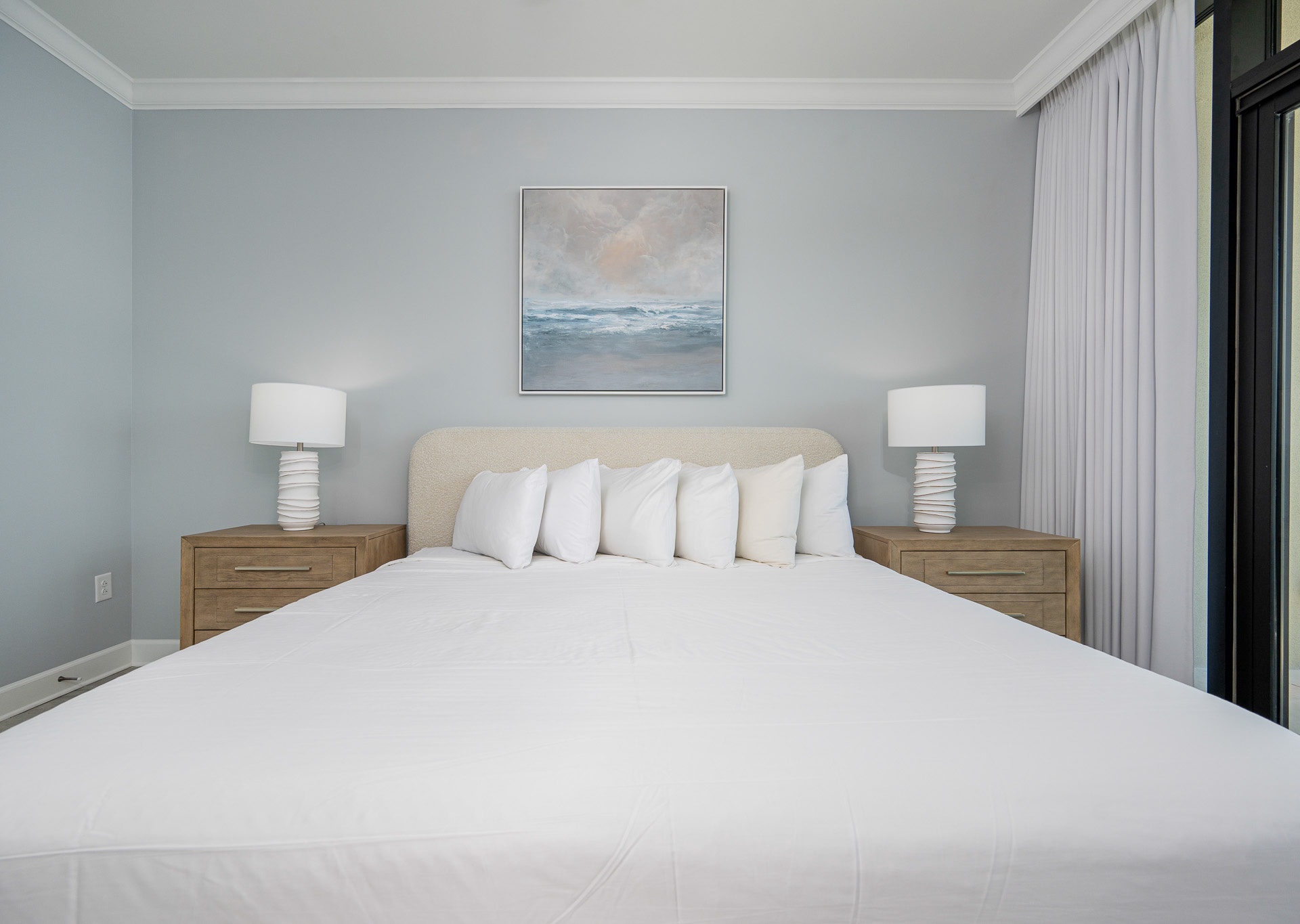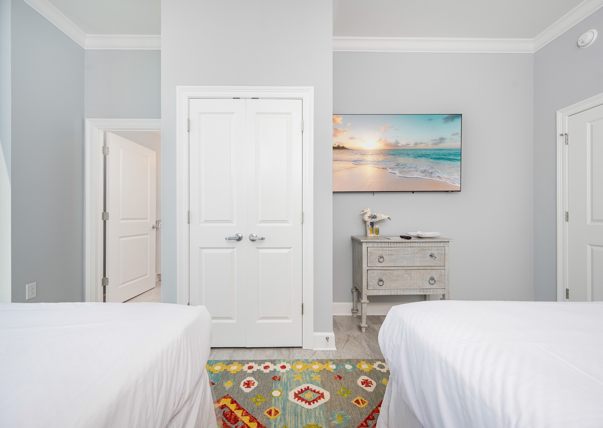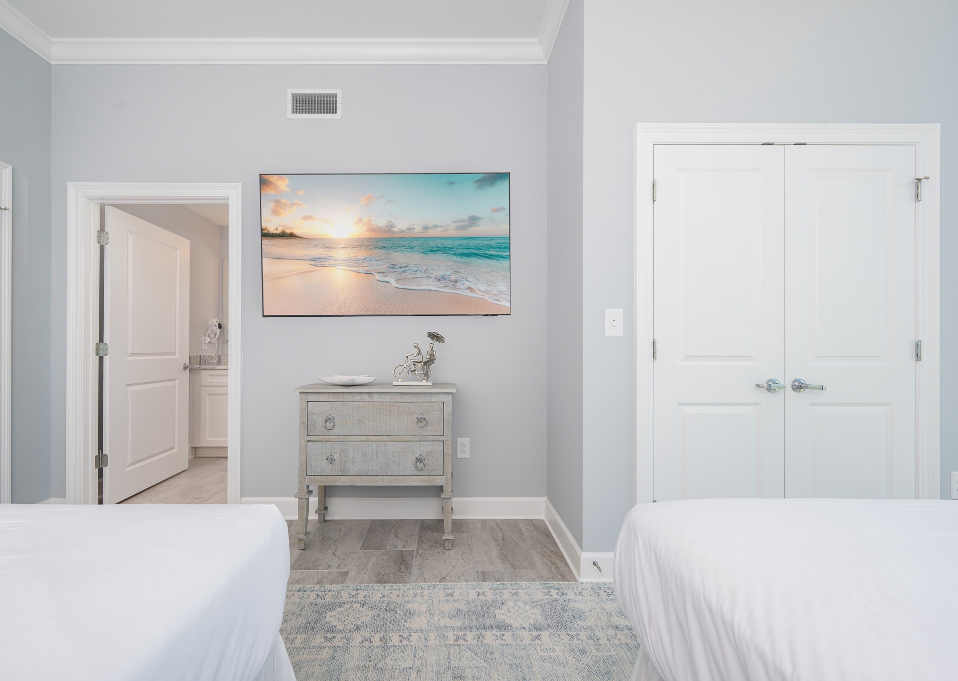 • Second & Third Bedrooms – Each with two queen beds, floor-to-ceiling windows, Gulf views, flat-screen TVs, and private baths with single vanities and walk-in showers.