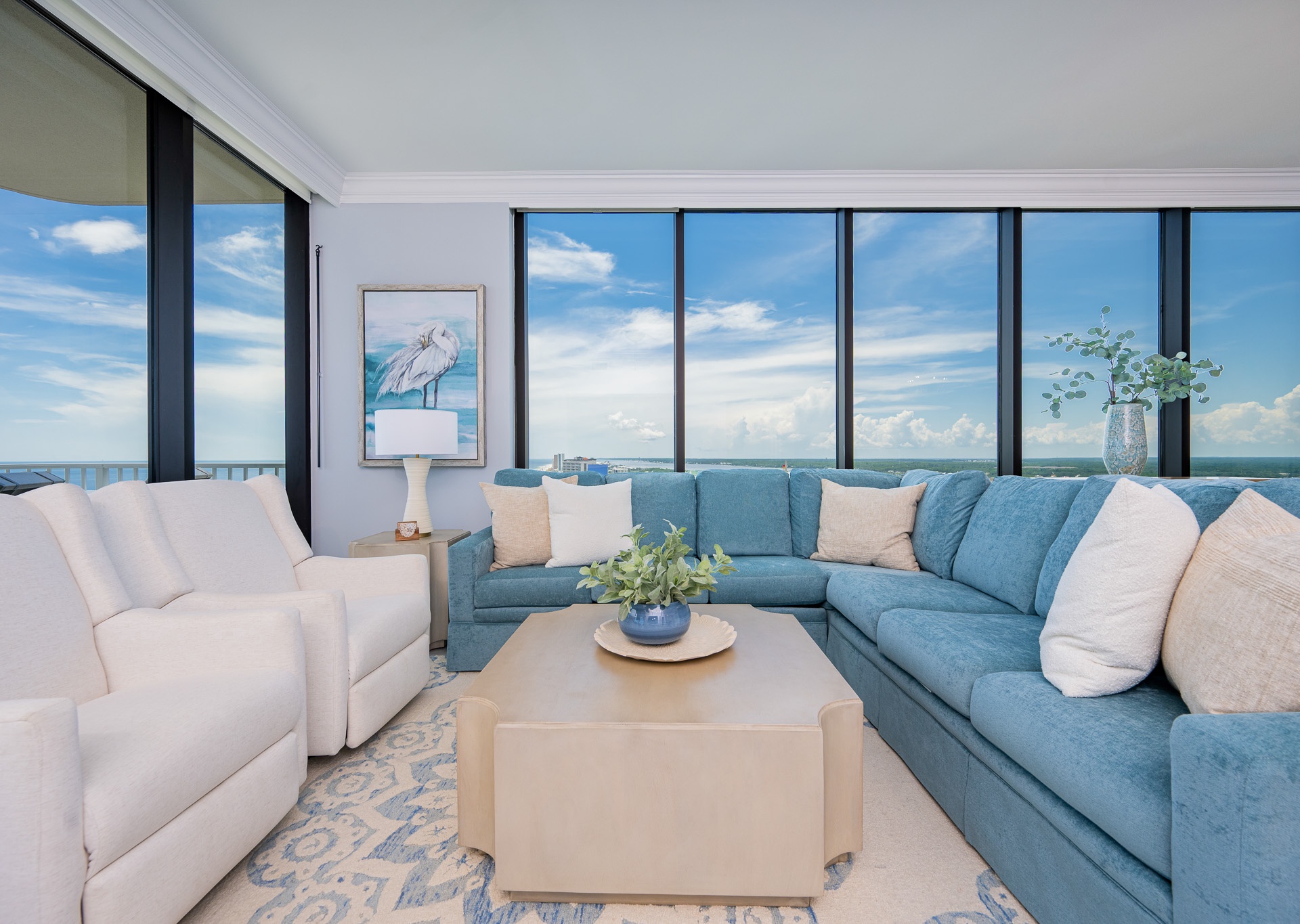 • Living Room – Large sectional sofa, queen sleeper sofa, two swivel chairs, flat-screen TV, and incredible Gulf views.