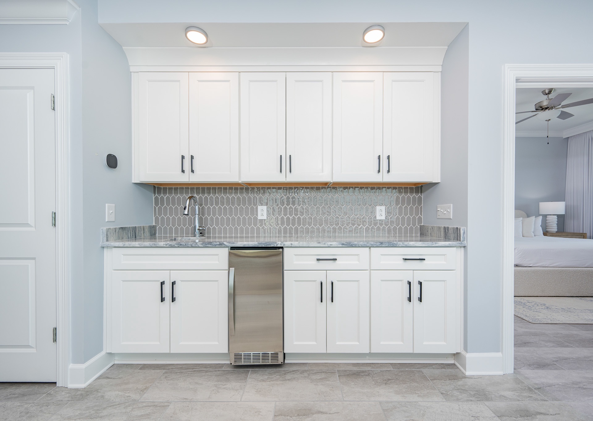- Kitchens with stainless steel appliances, granite countertops, custom cabinets, a wet bar with an ice maker, and a tile backsplash.