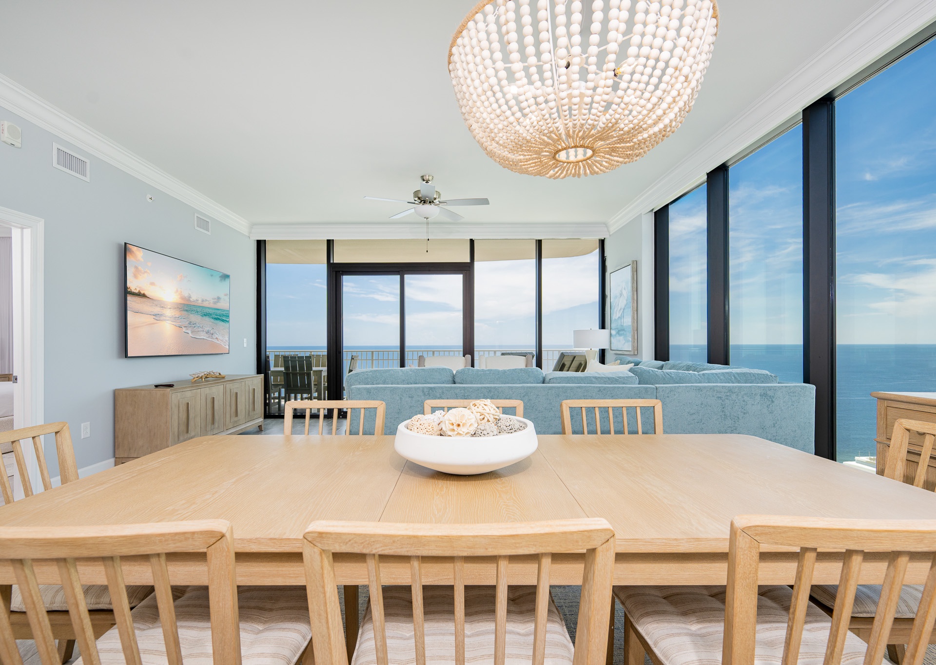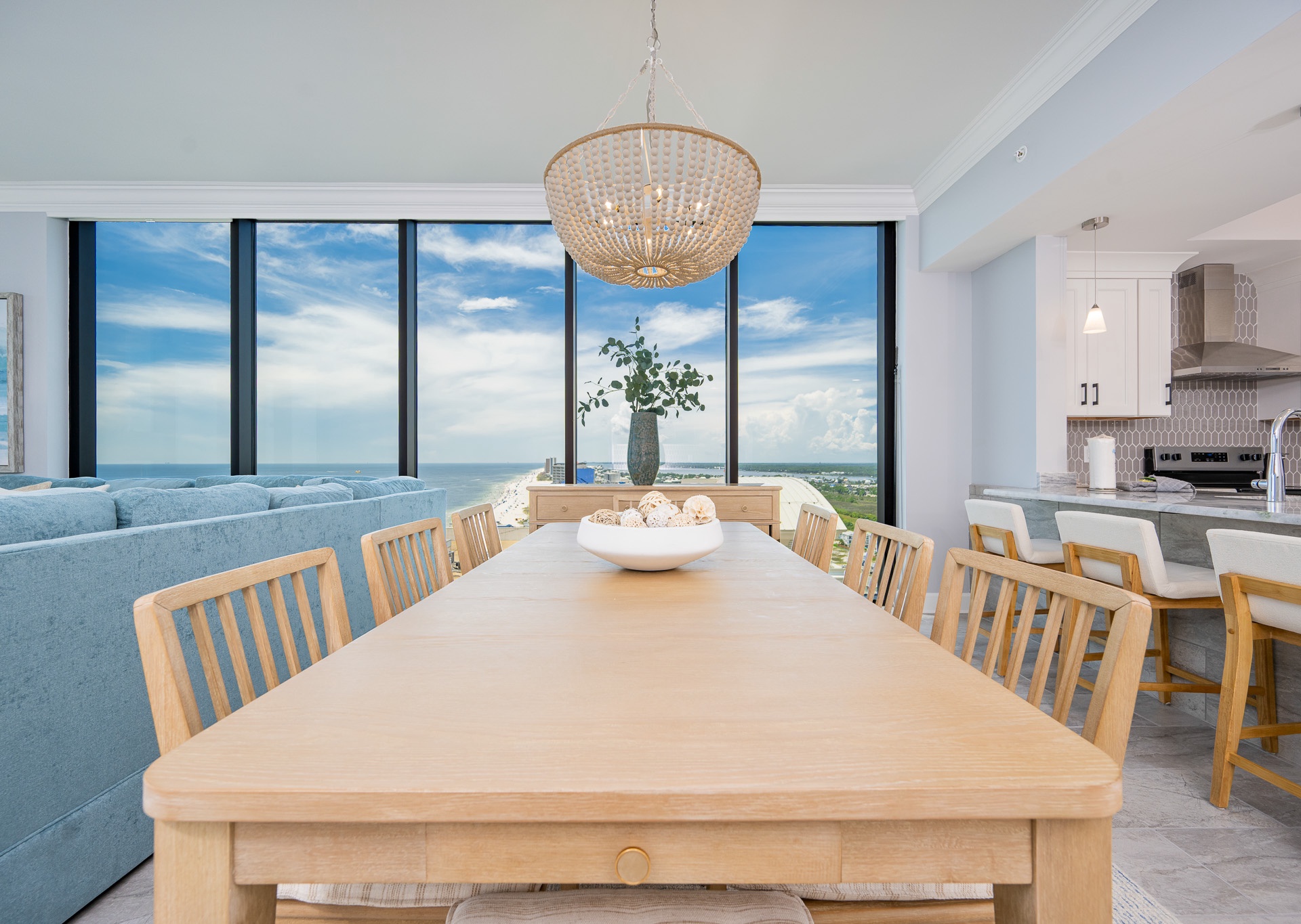 • Dining Area – Elegant sand-inspired chandelier with seating for eight.