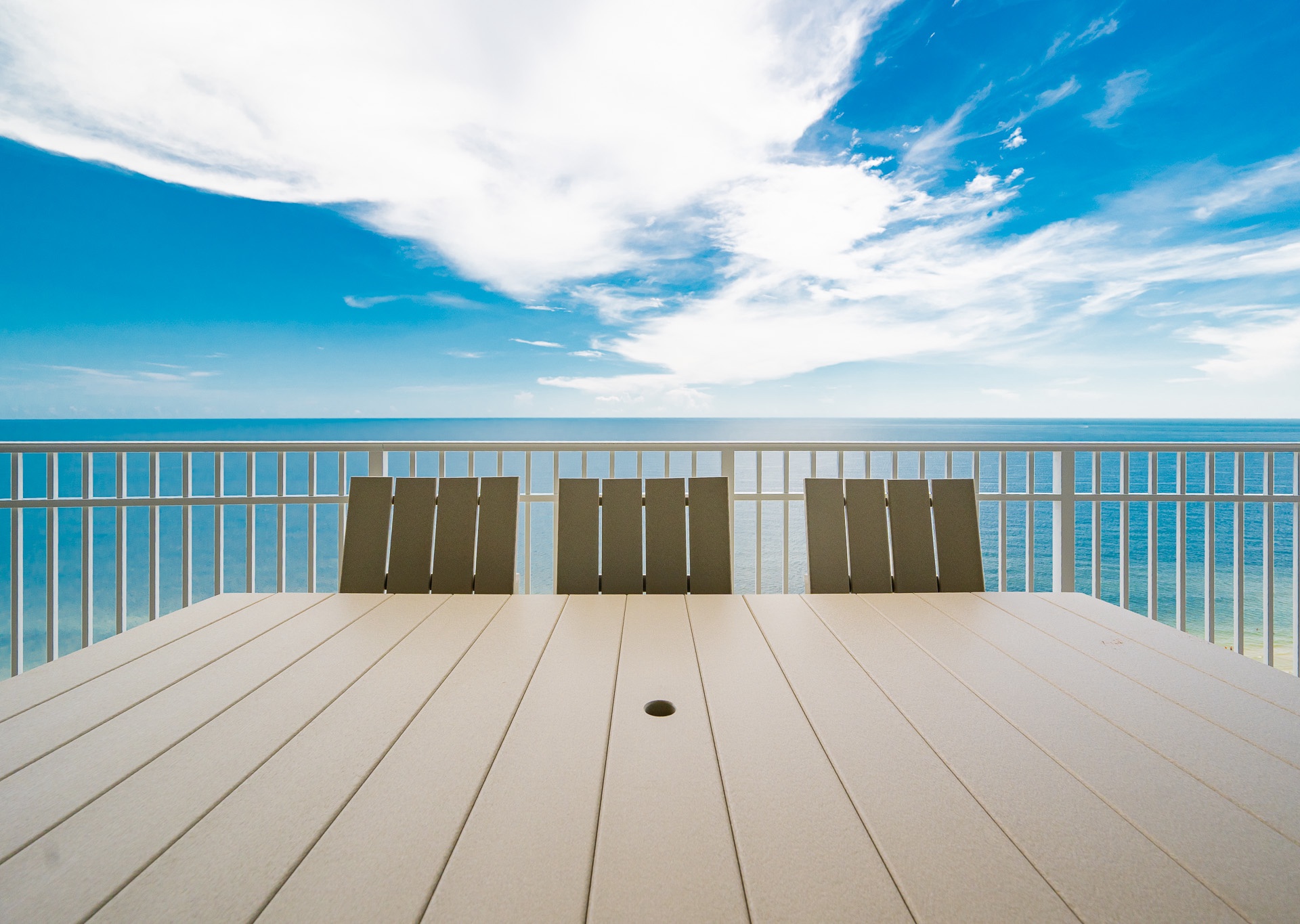 Step outside to the expansive Gulf-front balcony, complete with cushioned chaise lounges, a large dining table, and plenty of seating—perfect for enjoying sunsets, dining al fresco, or simply soaking in the unobstructed views for miles.