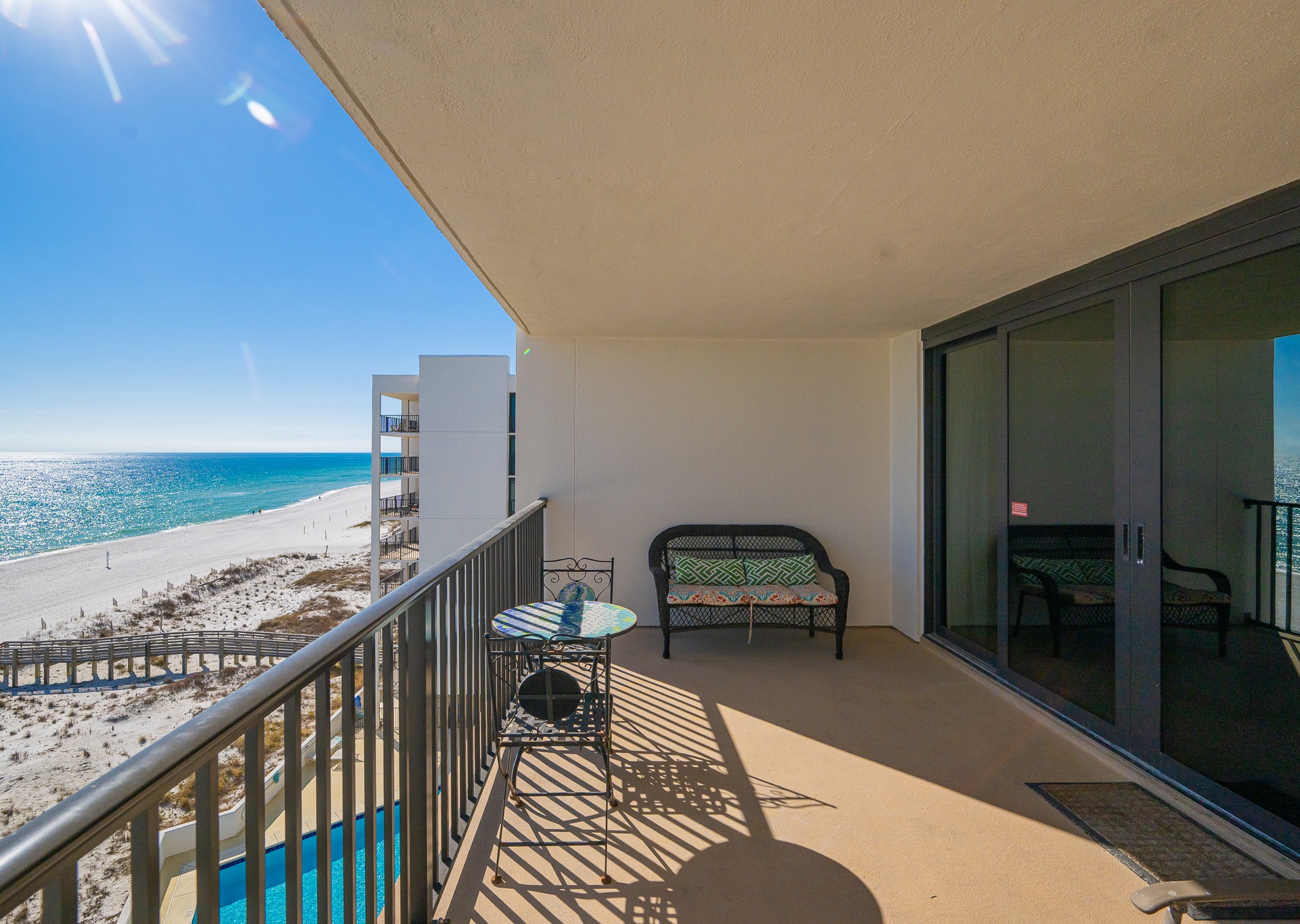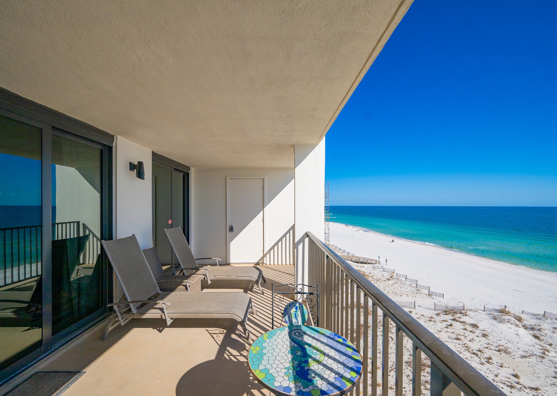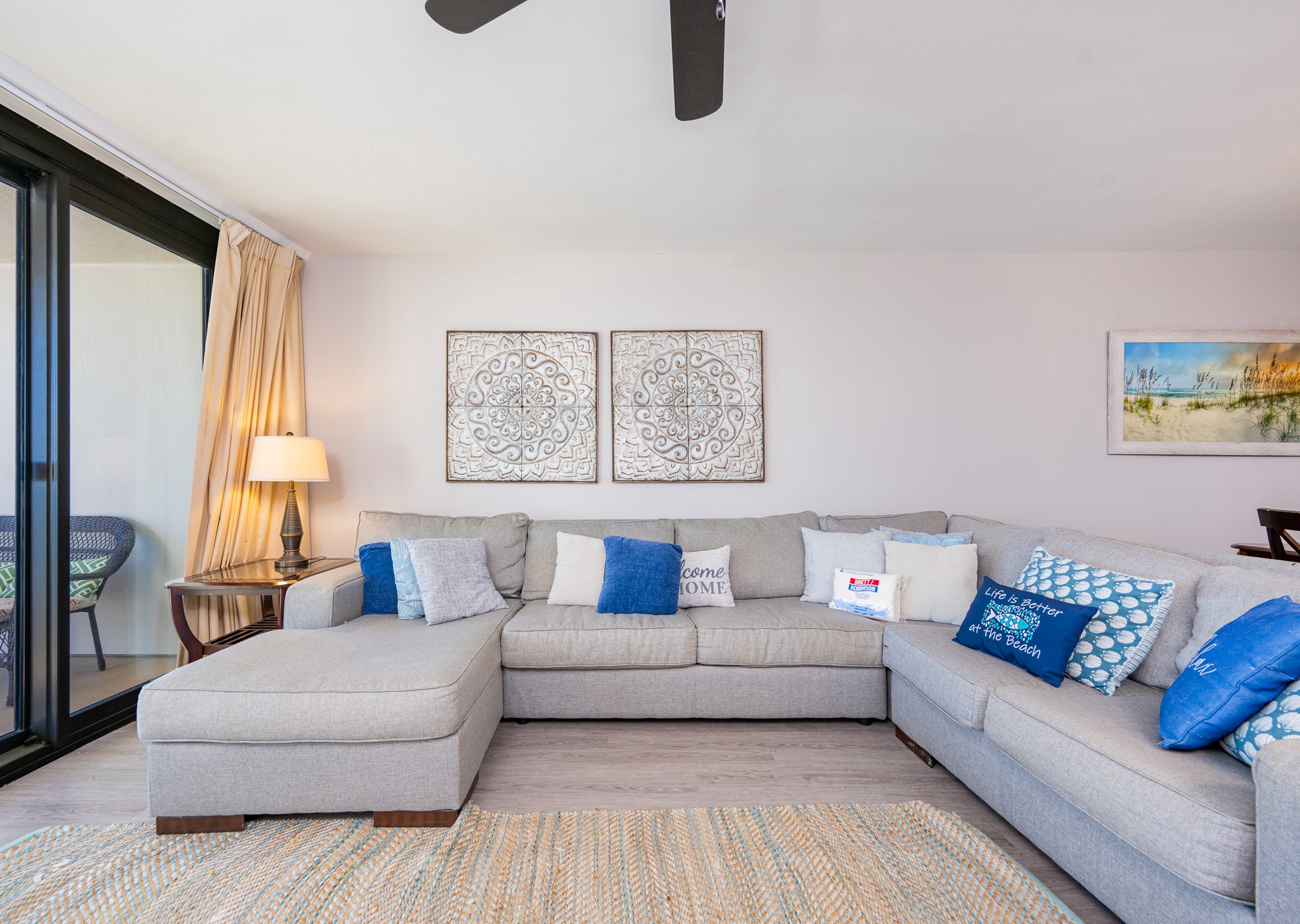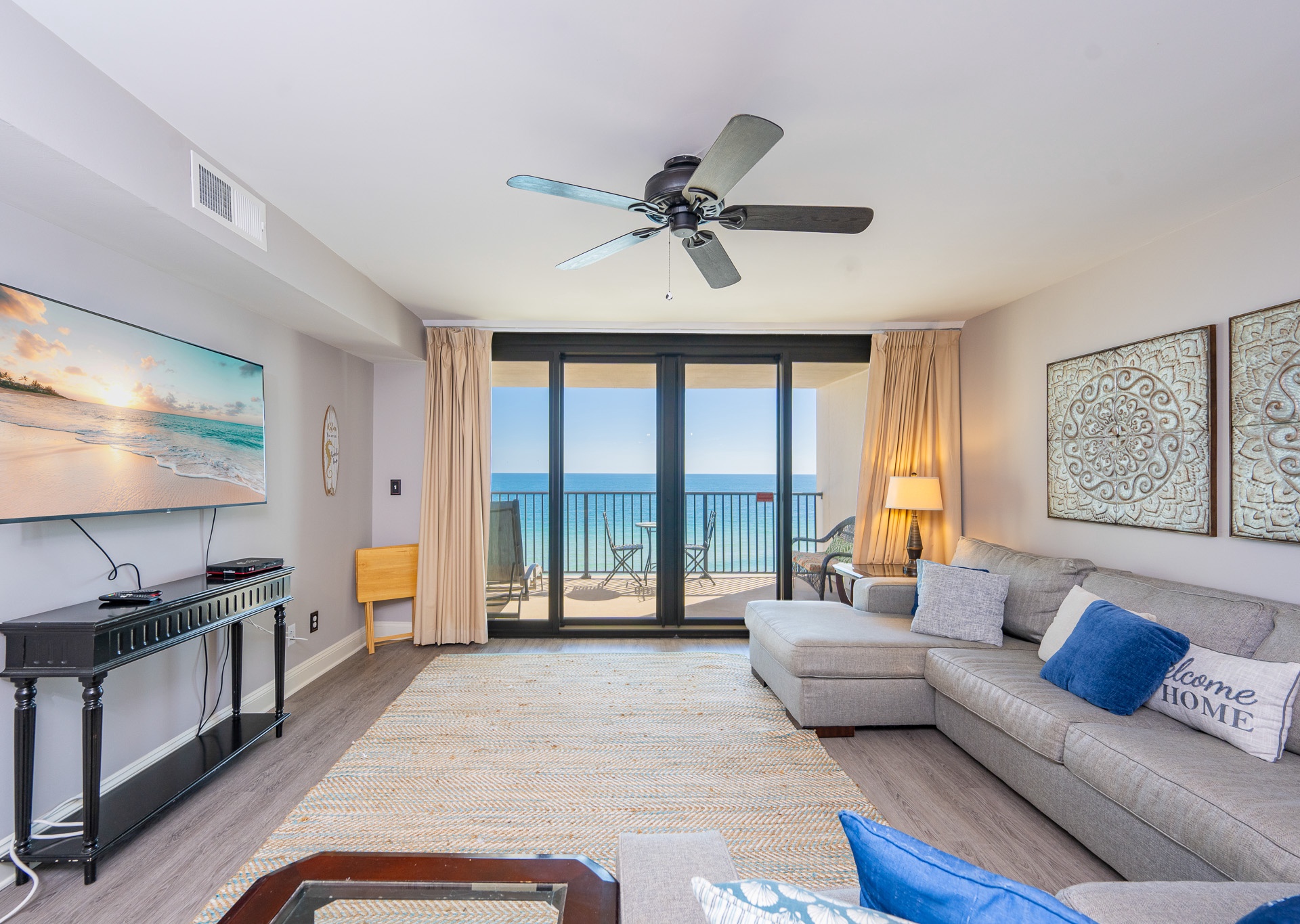 The living room is flooded with natural light thanks to stunning floor-to-ceiling windows that open directly onto an expansive private balcony. Step outside and relax on the chase lounges and ample seating, ideal for morning coffee, sunset cocktails, or simply soaking in the coastal breeze. Inside, a large sectional sofa provides plenty of space for everyone to gather, unwind, and enjoy the flat-screen TV after a day at the beach.