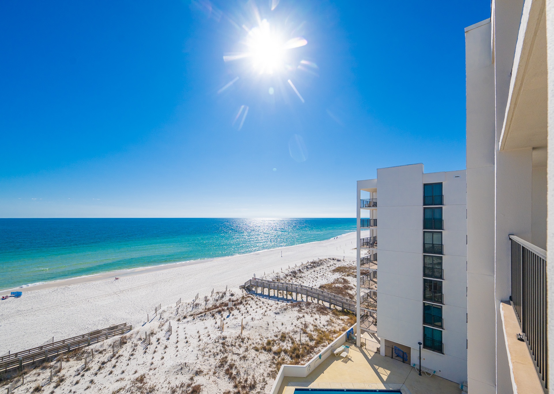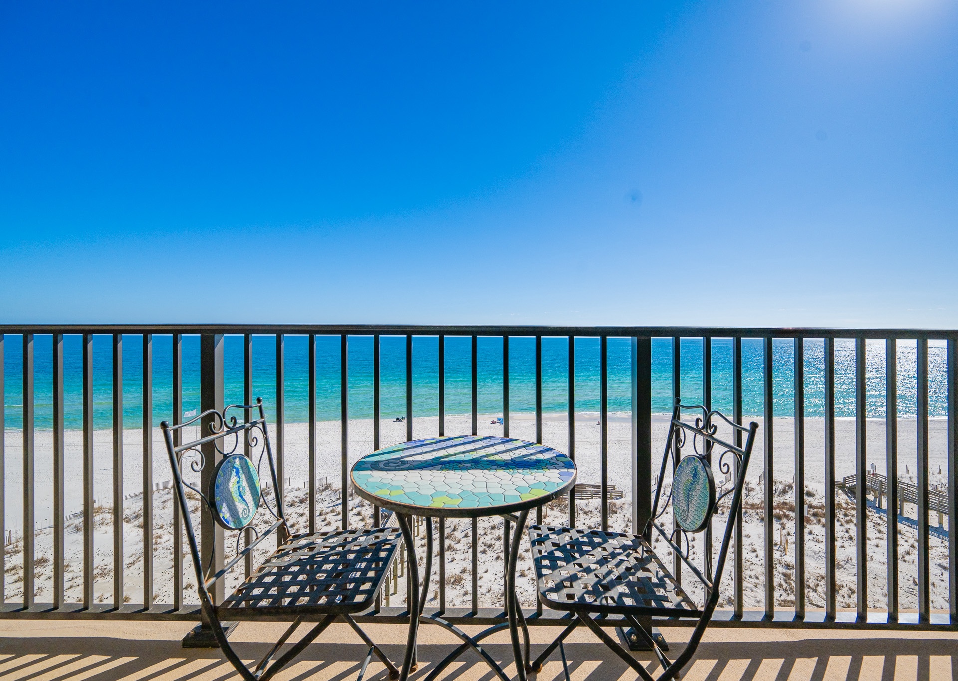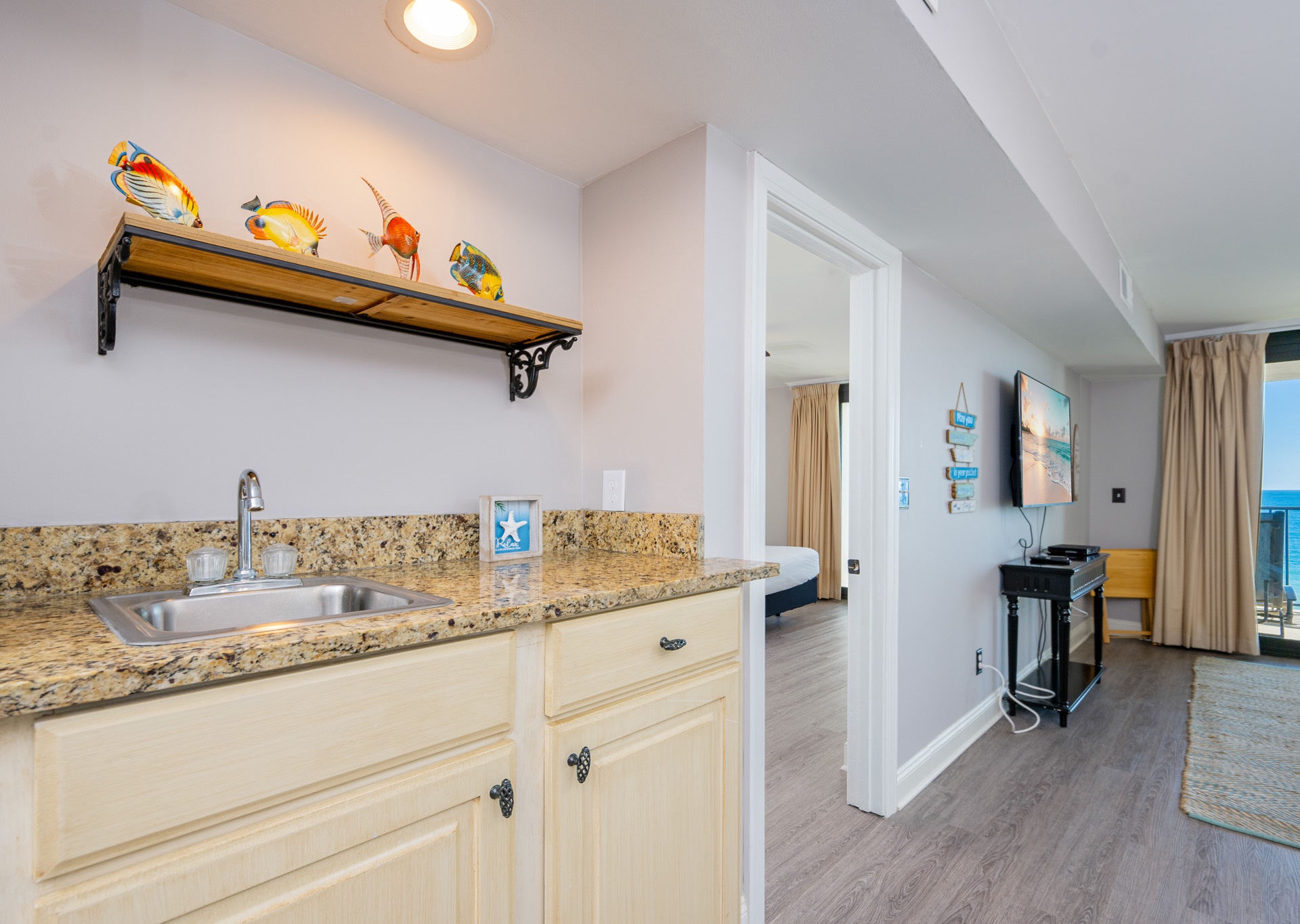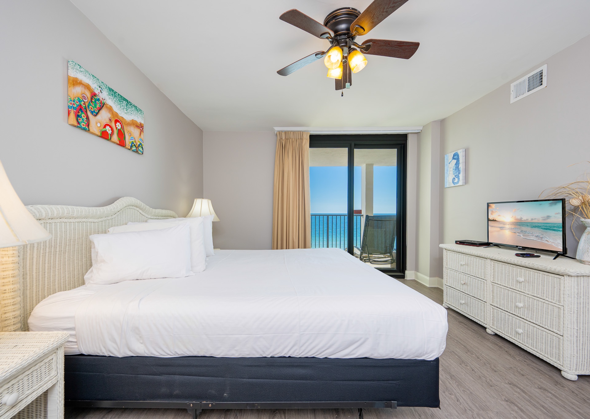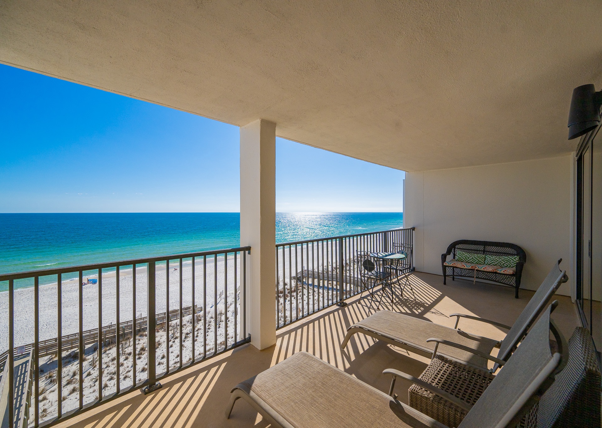 The living room is flooded with natural light thanks to stunning floor-to-ceiling windows that open directly onto an expansive private balcony. Step outside and relax on the chase lounges and ample seating, ideal for morning coffee, sunset cocktails, or simply soaking in the coastal breeze. Inside, a large sectional sofa provides plenty of space for everyone to gather, unwind, and enjoy the flat-screen TV after a day at the beach.
