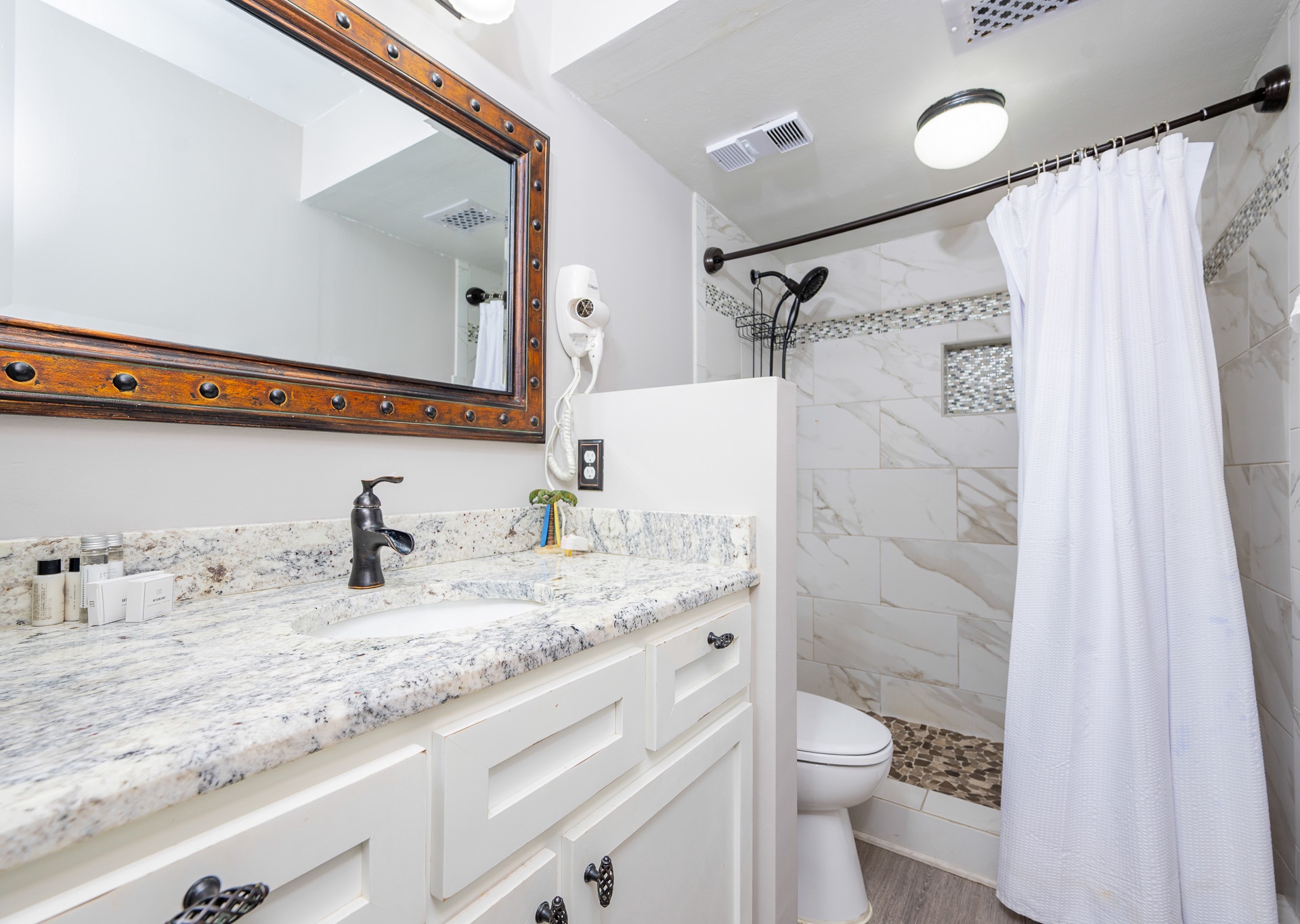 The primary bedroom offers a serene escape with a king-size bed, flat-screen TV, ceiling fan, and private balcony access. The en suite bathroom is completely remodeled, showcasing a gorgeous tiled walk-in shower with a handheld showerhead for a spa-like experience.