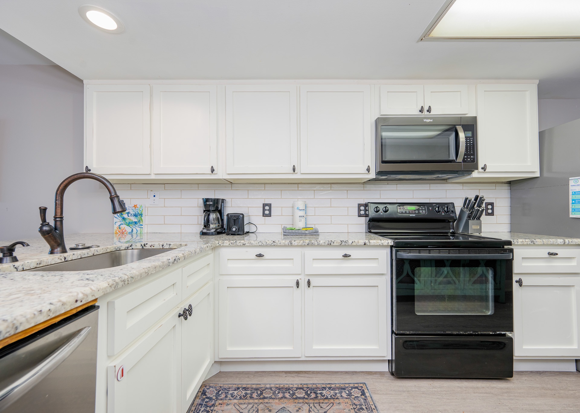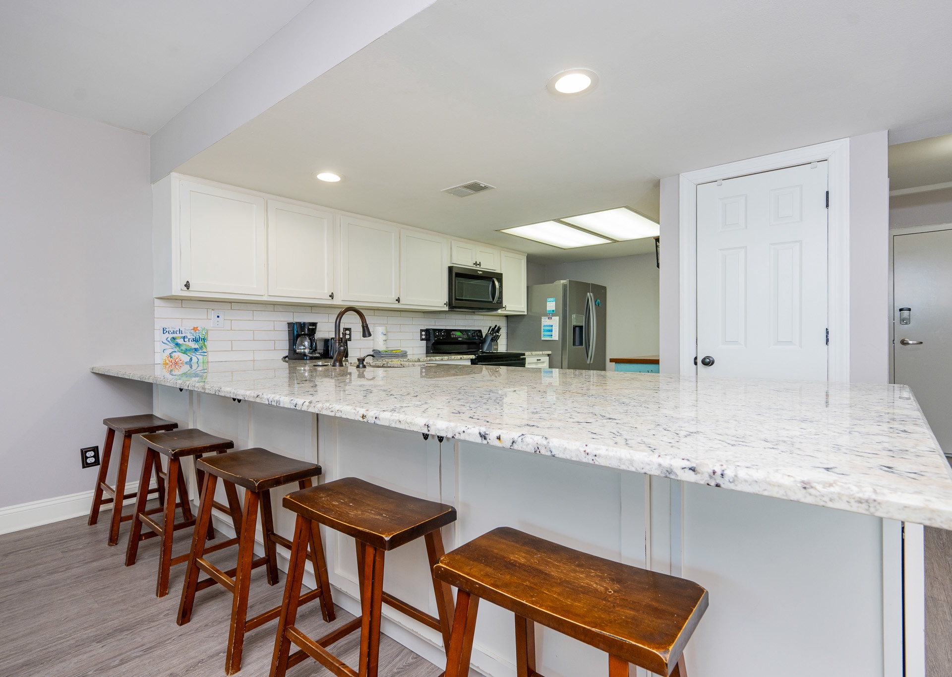 The fully remodeled kitchen is a dream for any home chef, featuring stainless steel appliances, granite countertops, crisp white cabinetry, and everything you need to prepare meals with ease. Just off the kitchen, you’ll find a separate entertaining bar with its own sink, perfect for hosting or mixing up your favorite drinks. The dining table seats four, complemented by five barstools at the breakfast bar, ensuring plenty of room for meals and conversation.