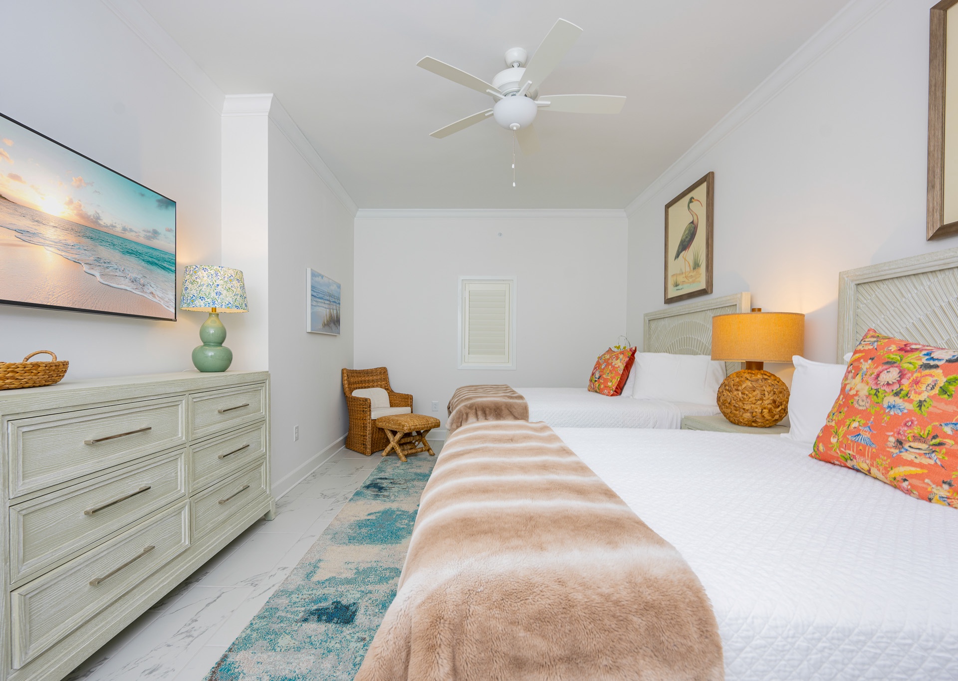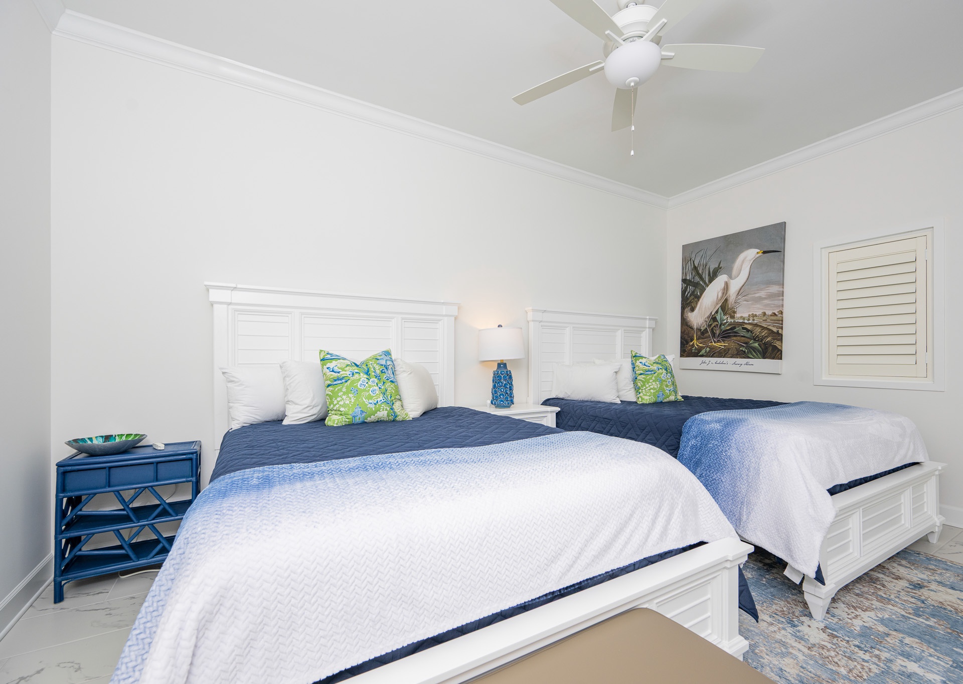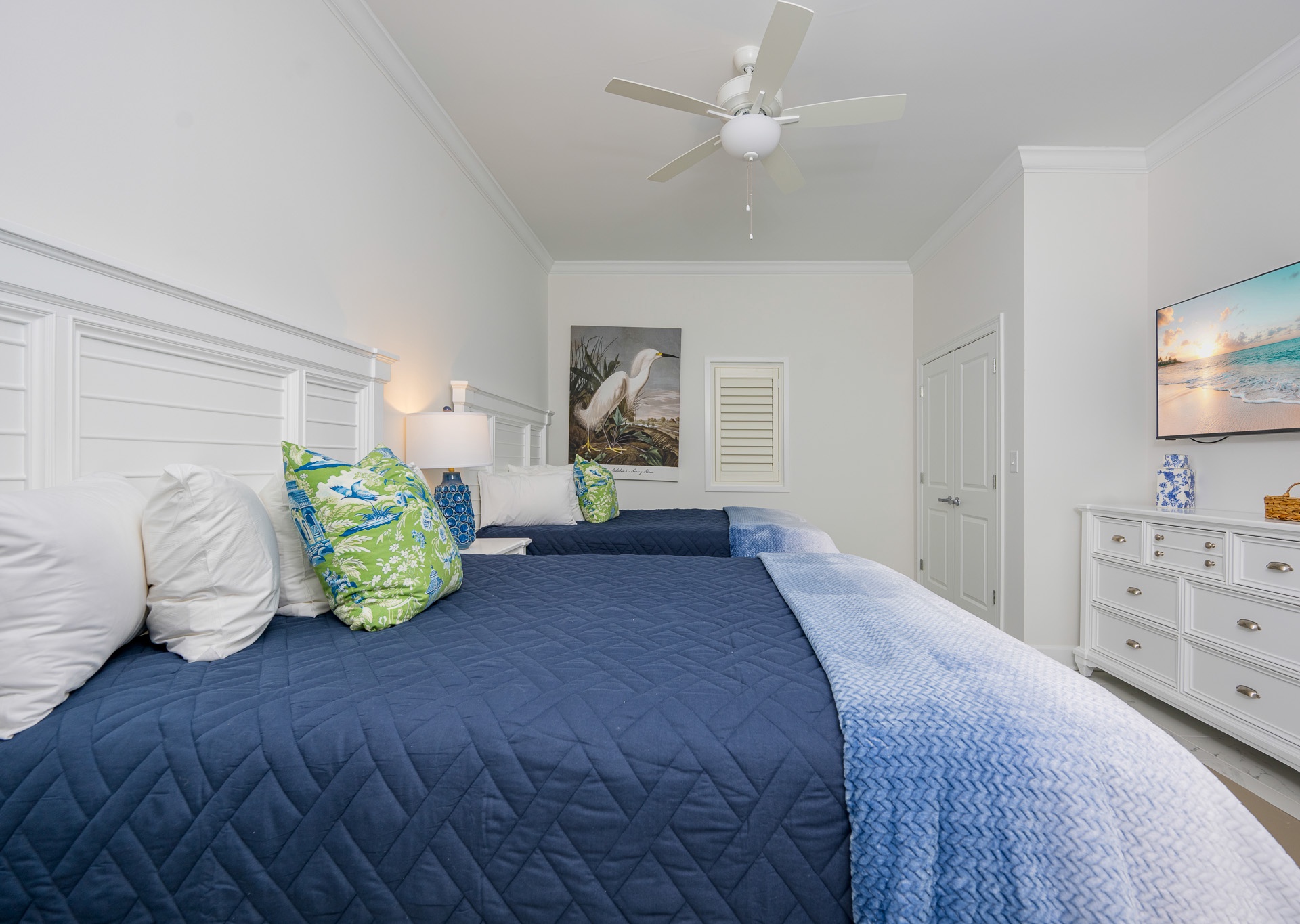 The second and third guest bedrooms each feature two queen beds and private bathrooms. One bathroom includes a tub/shower combination, while the other offers a spacious walk-in shower—providing comfort and convenience for every guest.