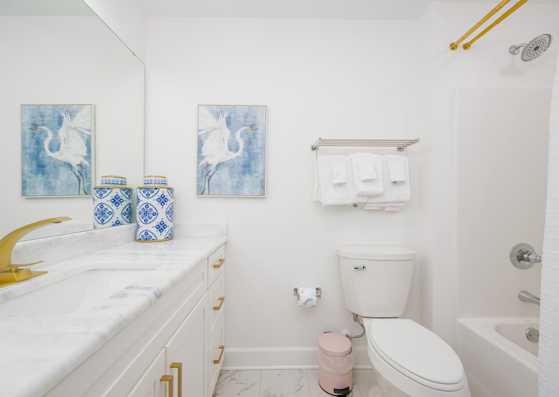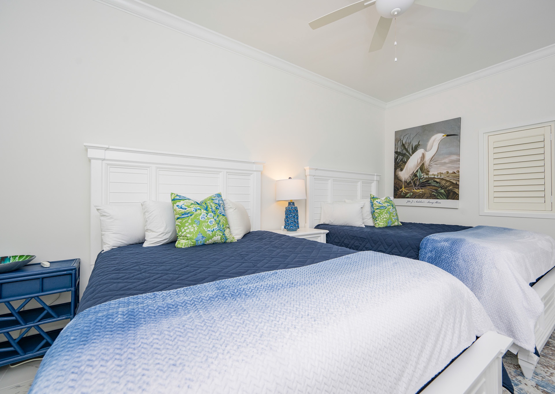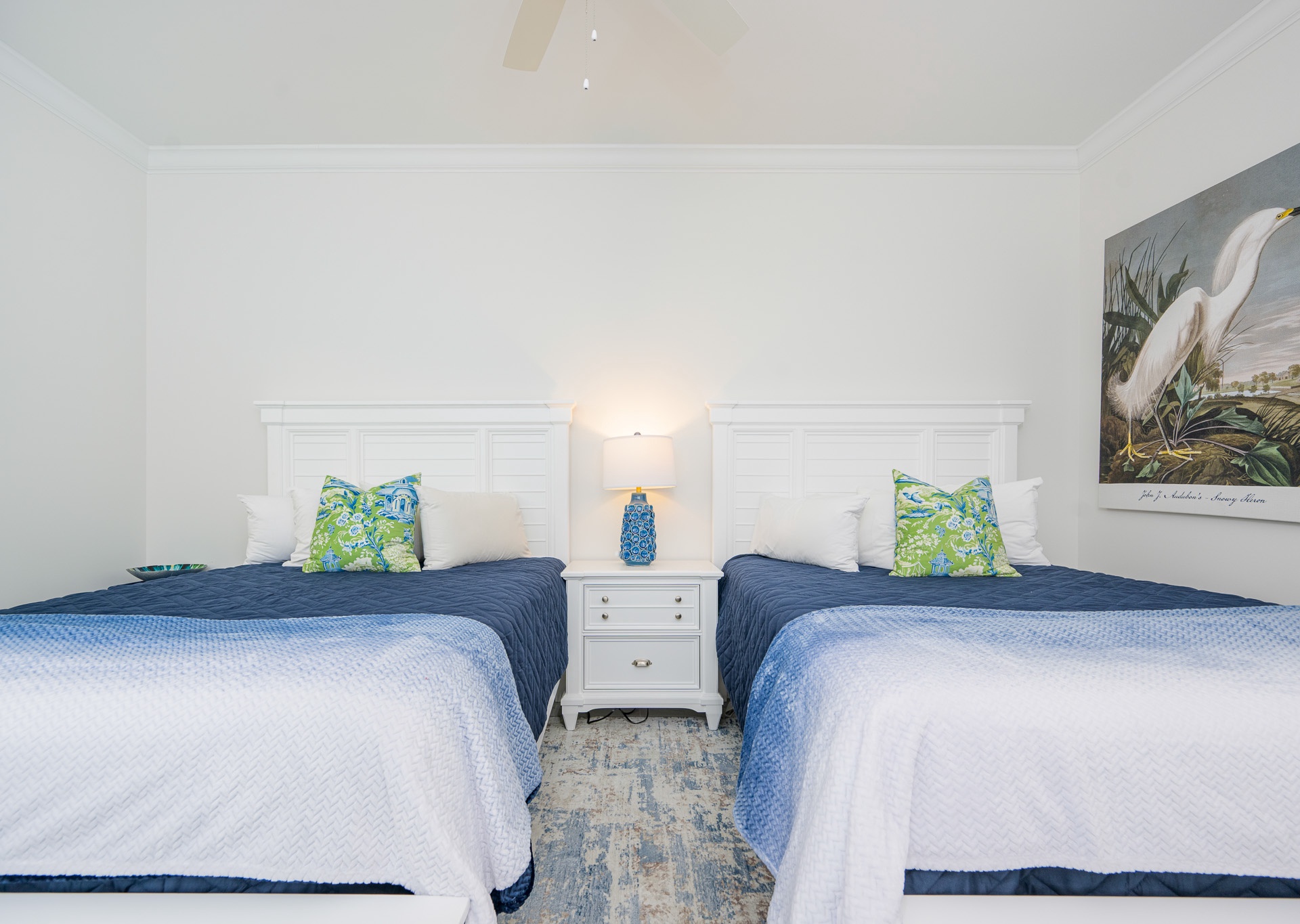 The second and third guest bedrooms each feature two queen beds and private bathrooms. One bathroom includes a tub/shower combination, while the other offers a spacious walk-in shower—providing comfort and convenience for every guest.