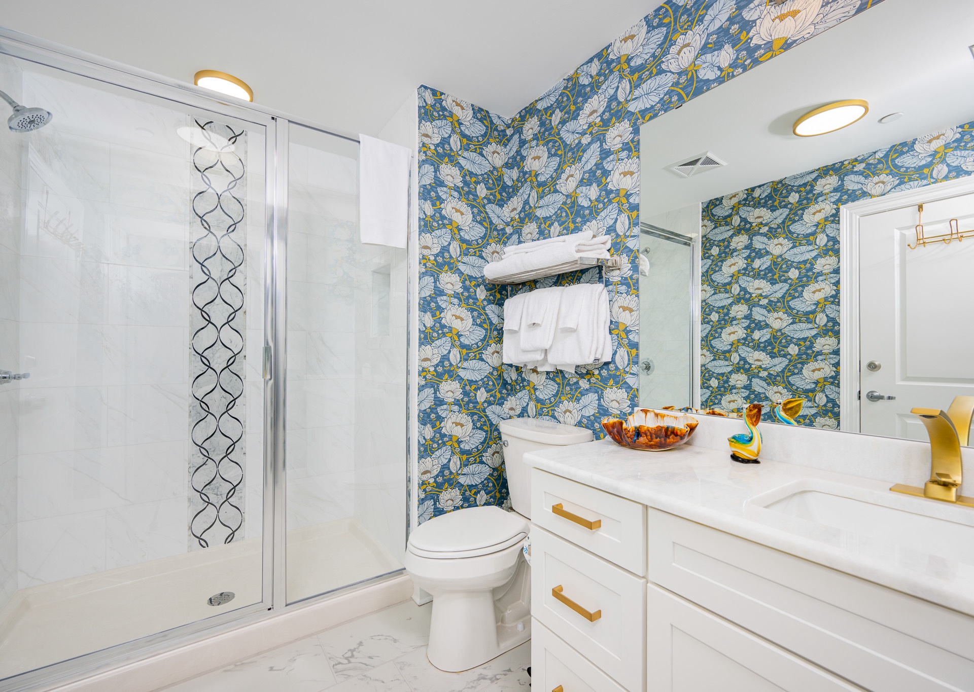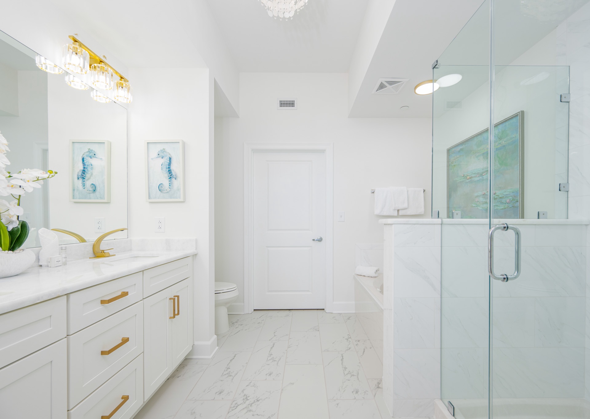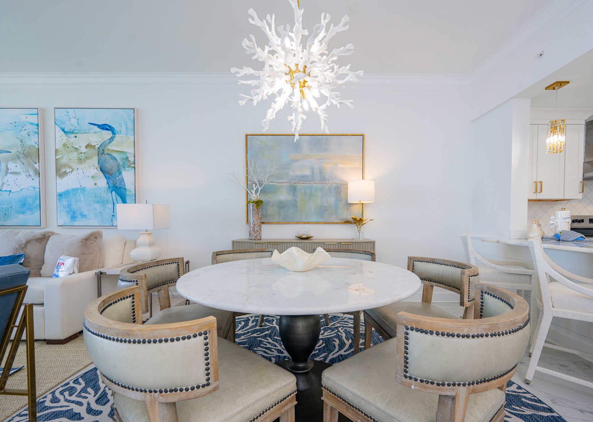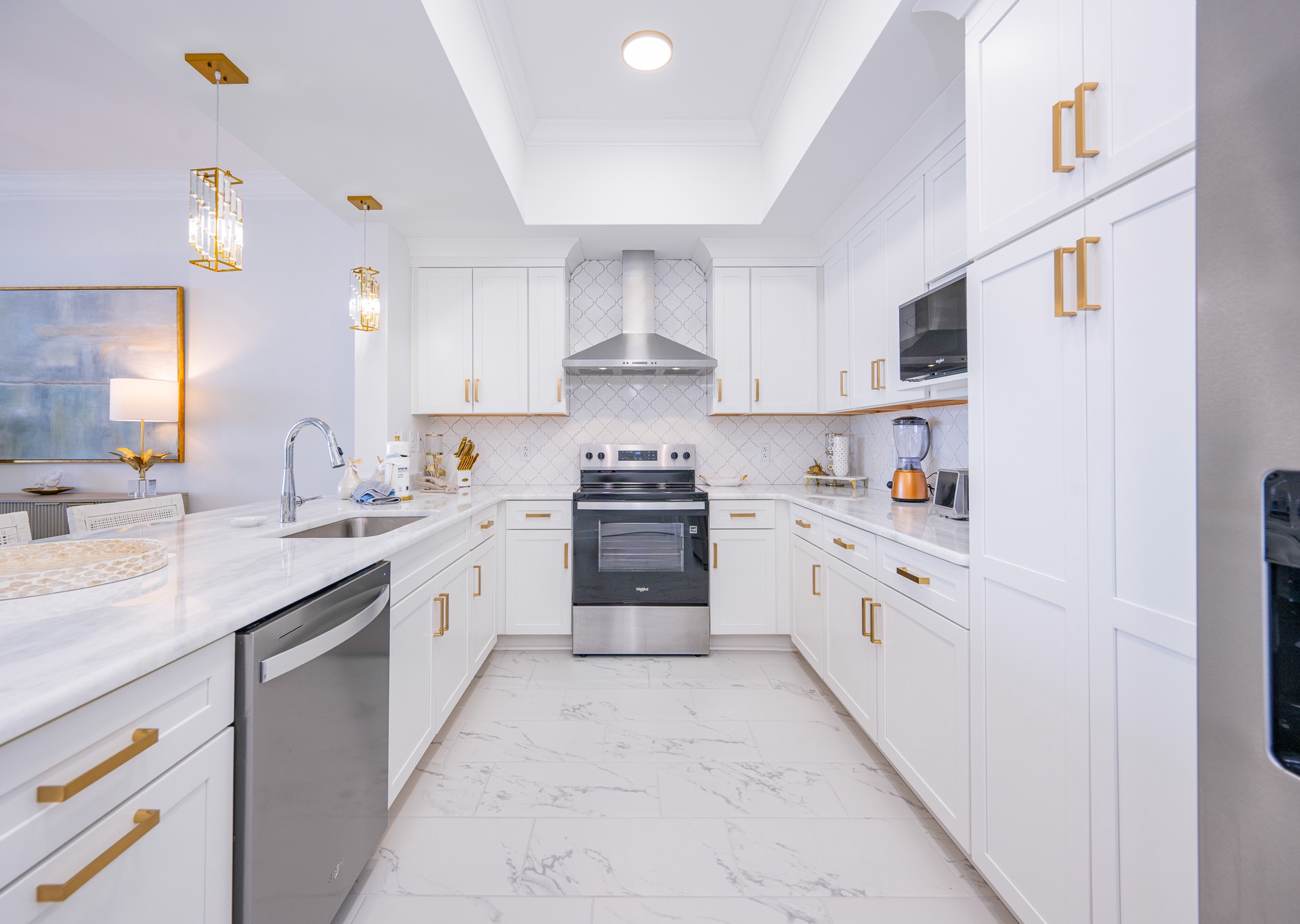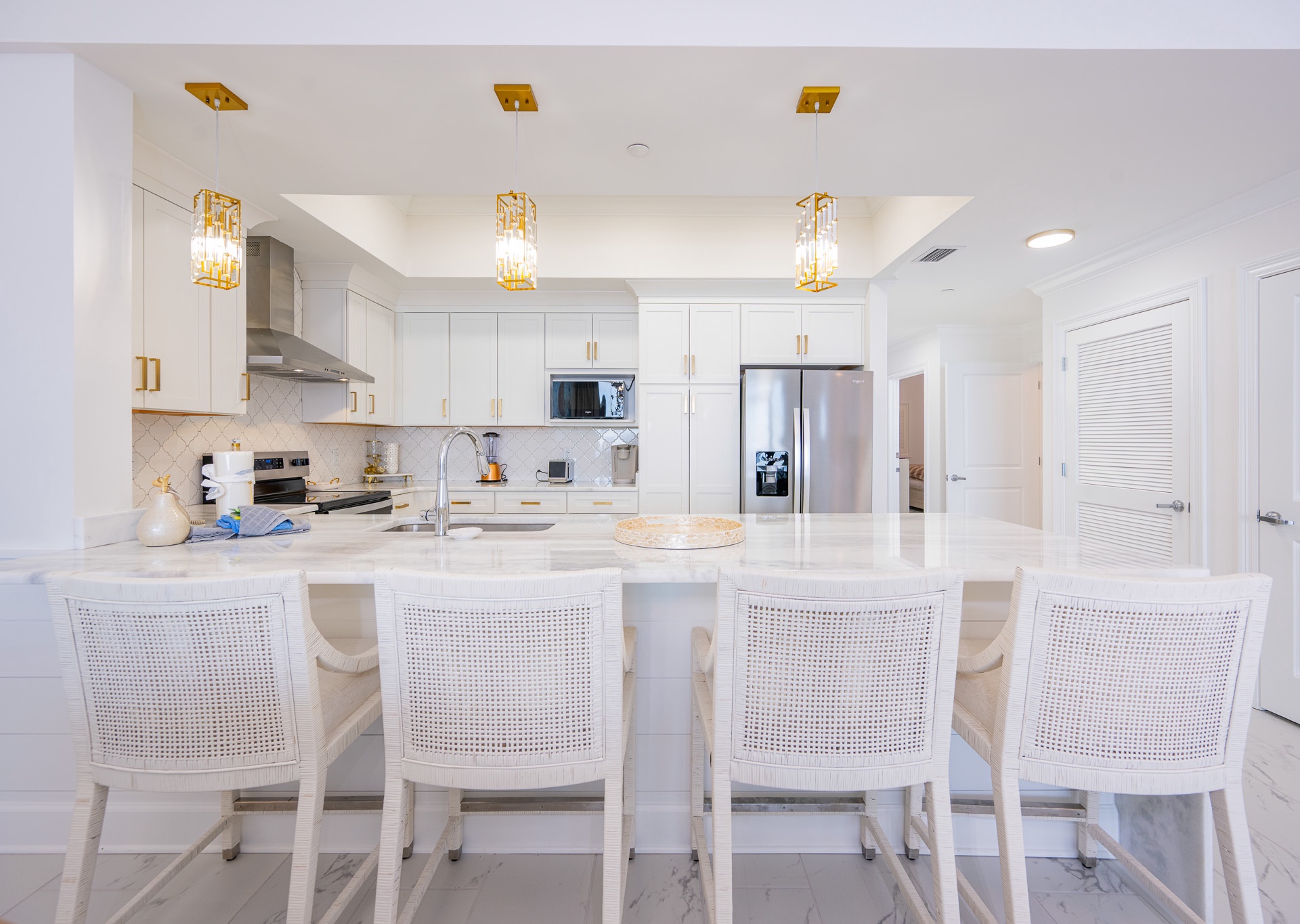 The dining area showcases a unique round table that seats up to six guests, positioned beneath a gorgeous chandelier that makes every meal feel special. The kitchen is a showstopper, featuring stainless steel appliances, a sleek stainless hood, a beautiful coordinating backsplash, and four barstools at the breakfast bar—perfect for gathering. Elegant gold accents throughout the kitchen, wet bar, and bathrooms elevate the space with a refined, modern touch.