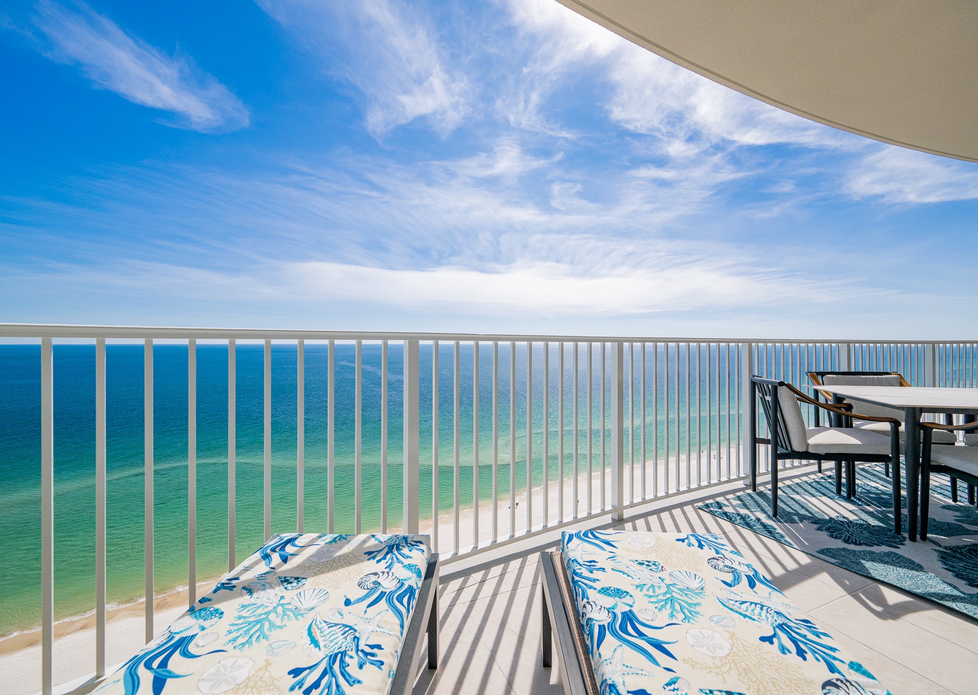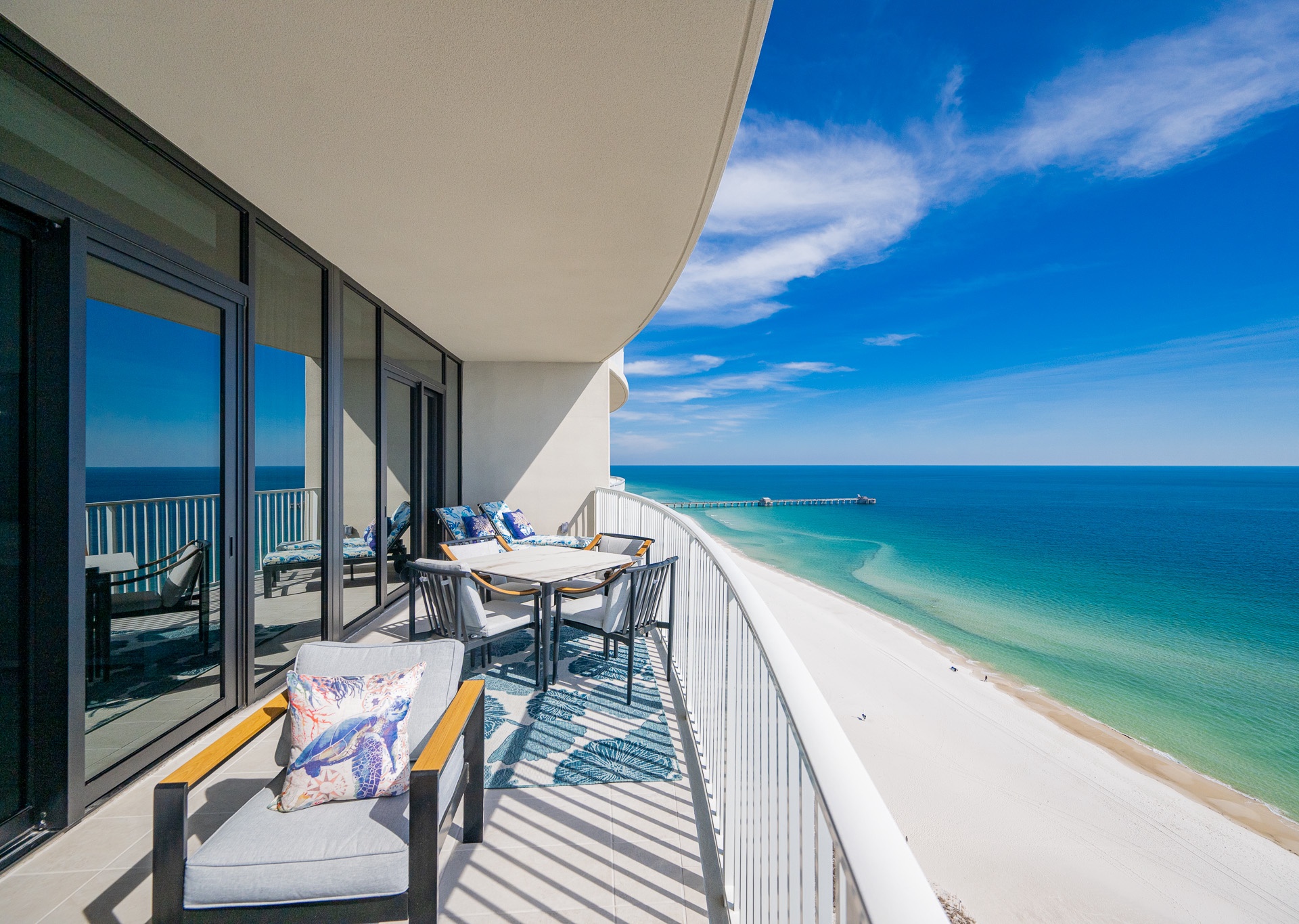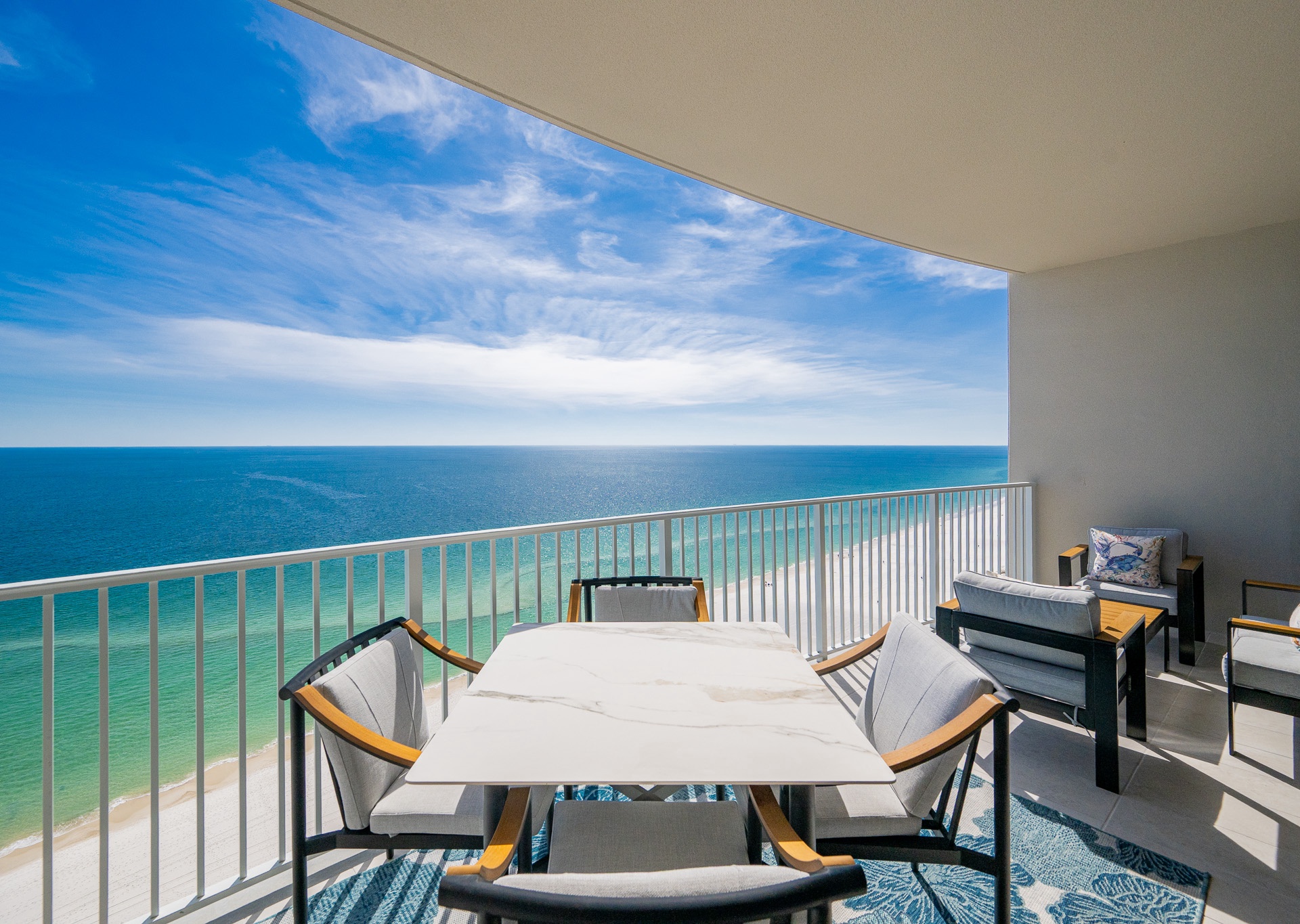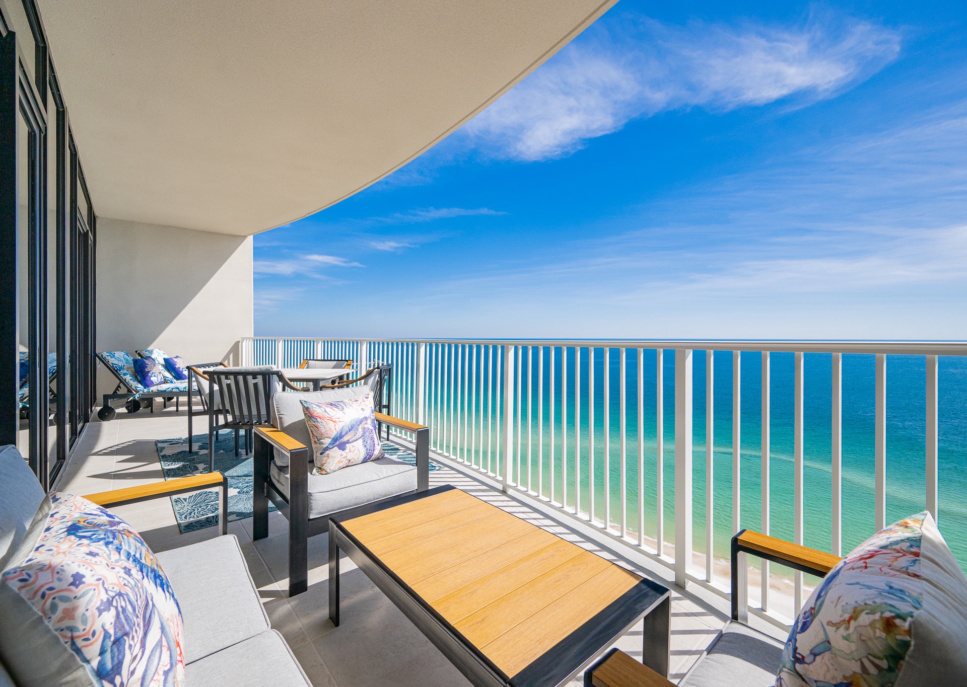 The entryway is beautifully accented, setting the tone the moment you walk in. Step outside to the expansive balcony, where you’ll find multiple seating areas designed for everyone to enjoy their own moment—tables for games, separate lounge spaces for relaxing, outdoor rugs for added comfort, and cushioned chaise lounges perfect for soaking in the views. Whether sipping a glass of wine or unwinding after a beach day, the balcony is a favorite gathering spot overlooking the Gulf.