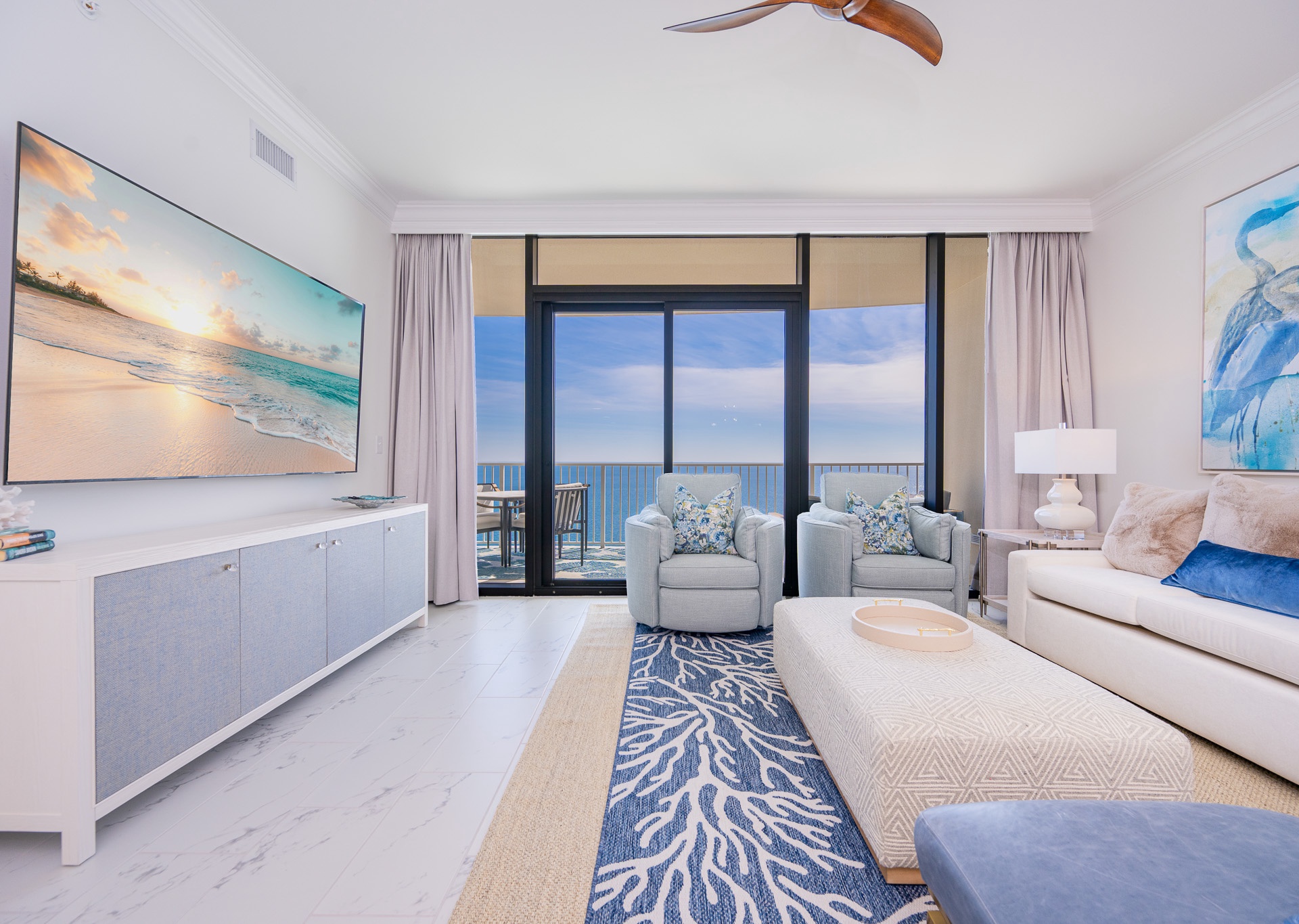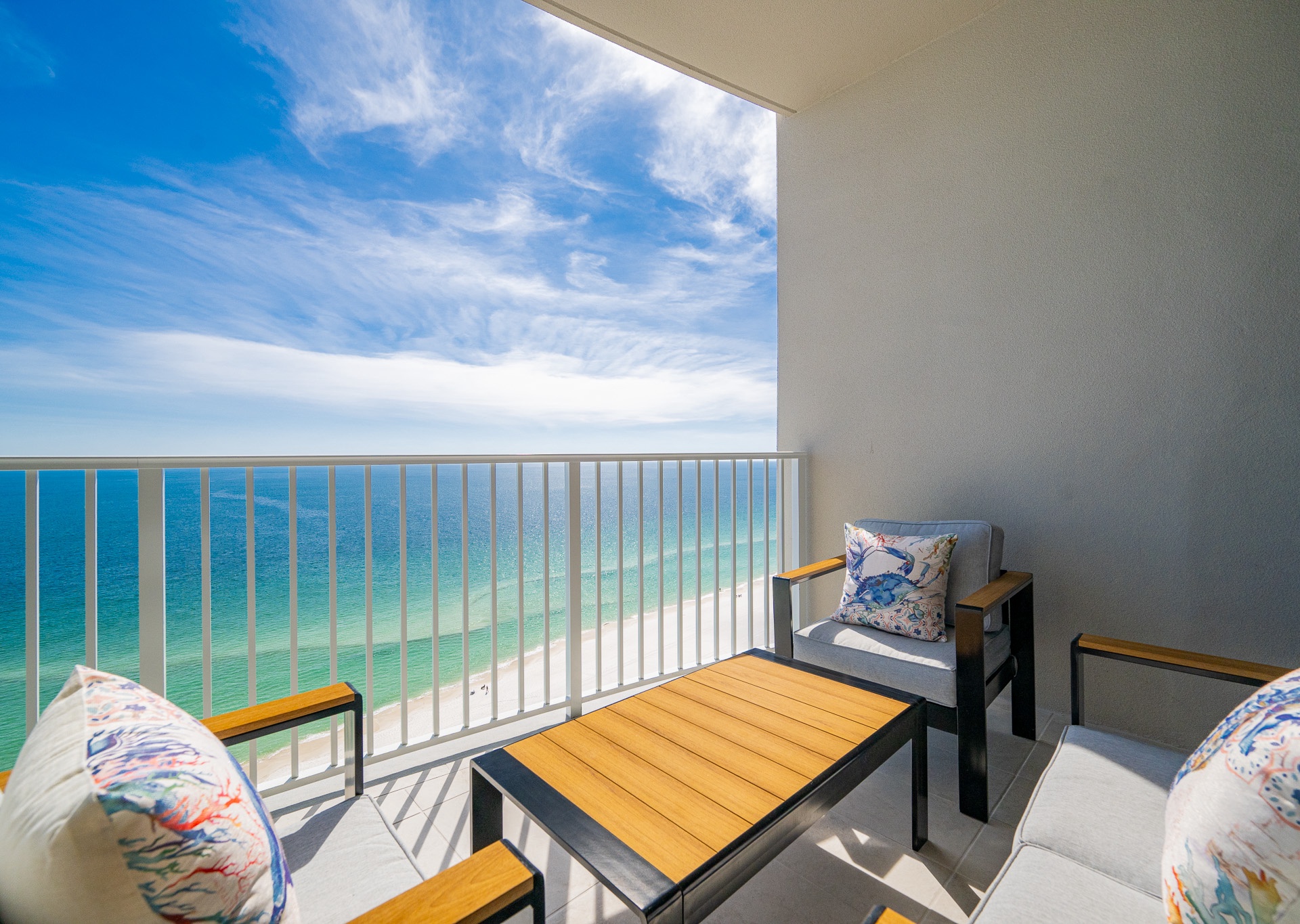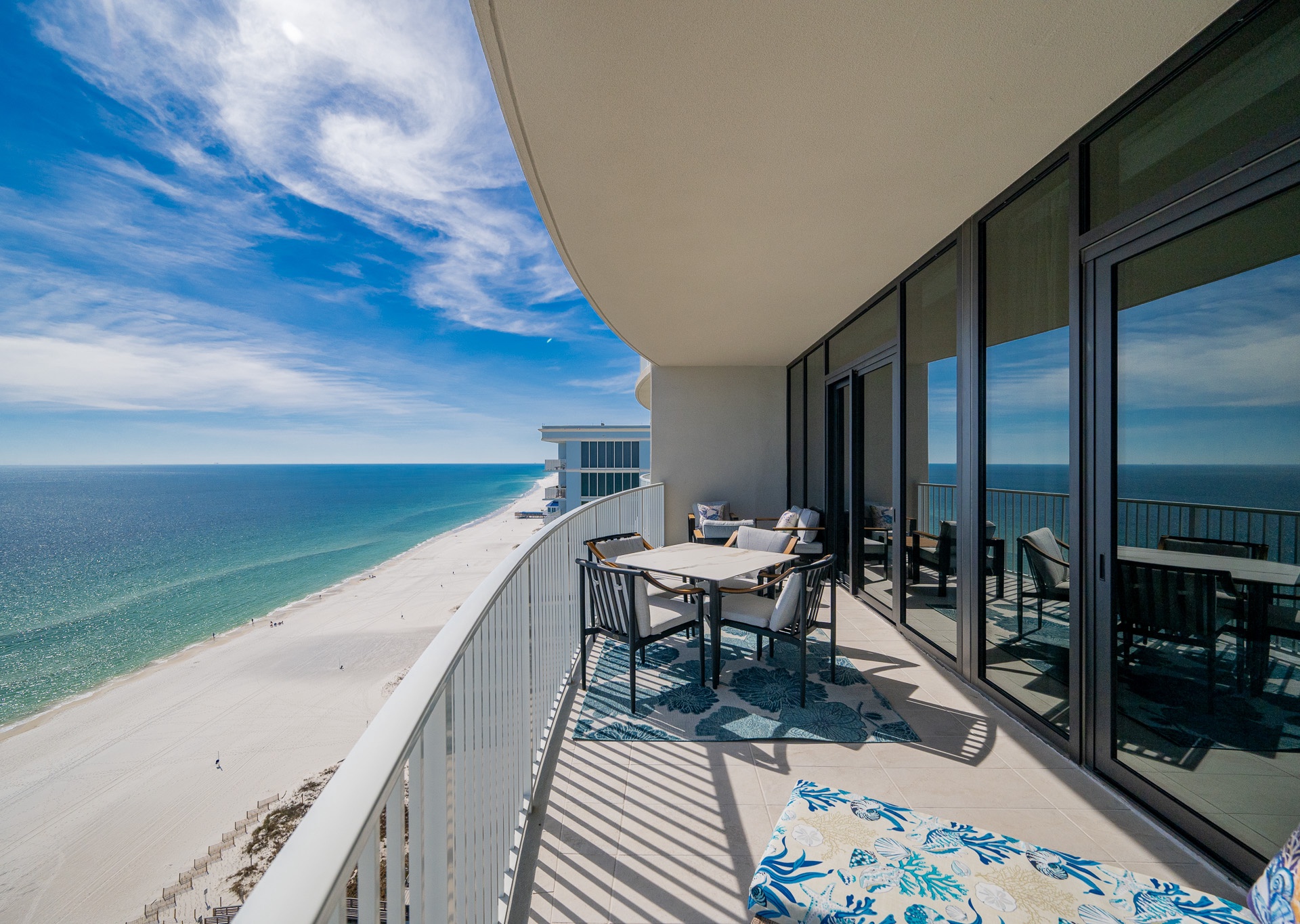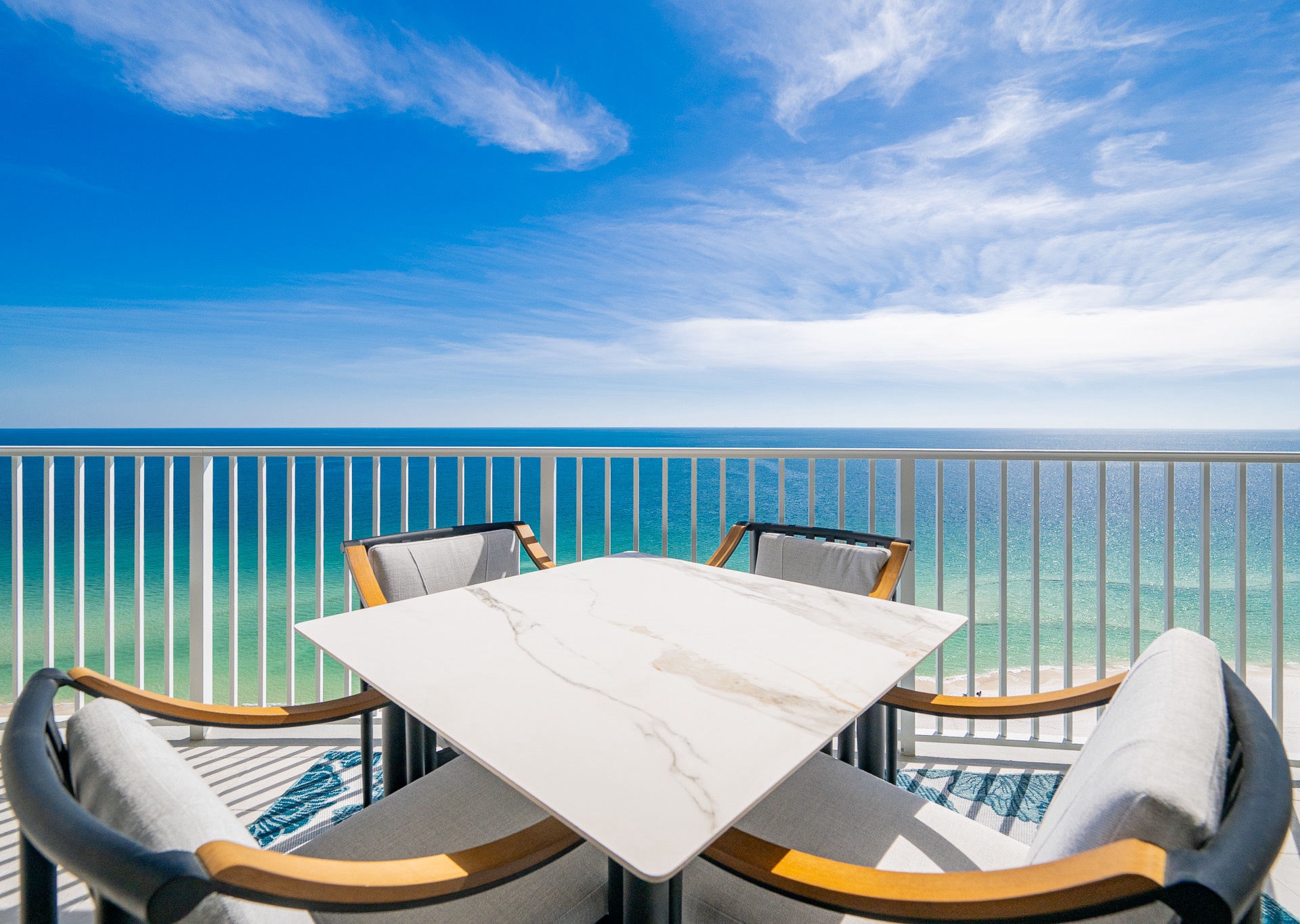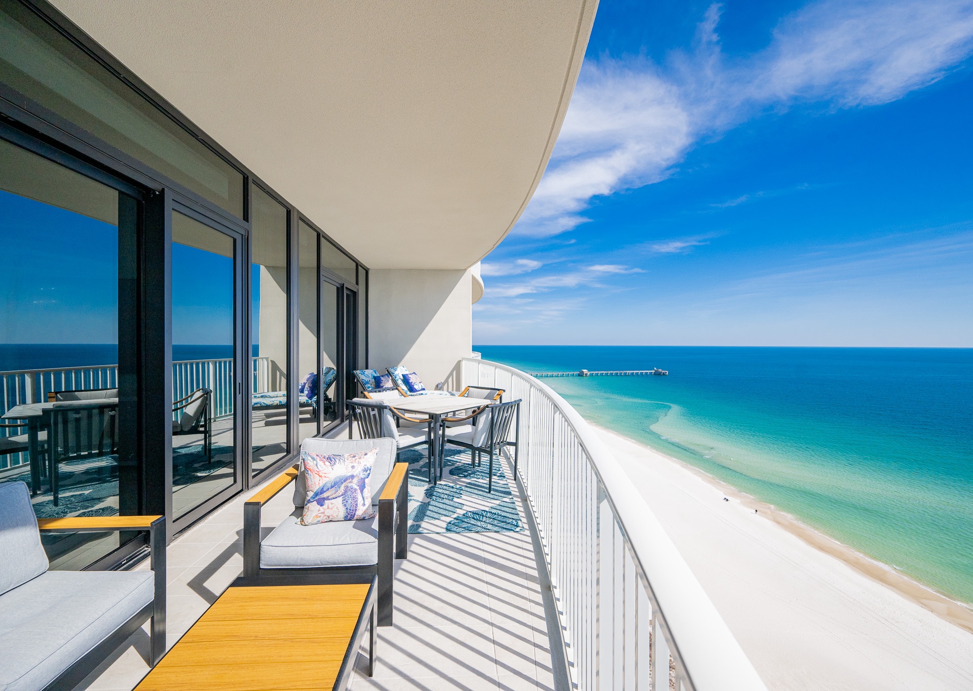 The entryway is beautifully accented, setting the tone the moment you walk in. Step outside to the expansive balcony, where you’ll find multiple seating areas designed for everyone to enjoy their own moment—tables for games, separate lounge spaces for relaxing, outdoor rugs for added comfort, and cushioned chaise lounges perfect for soaking in the views. Whether sipping a glass of wine or unwinding after a beach day, the balcony is a favorite gathering spot overlooking the Gulf.