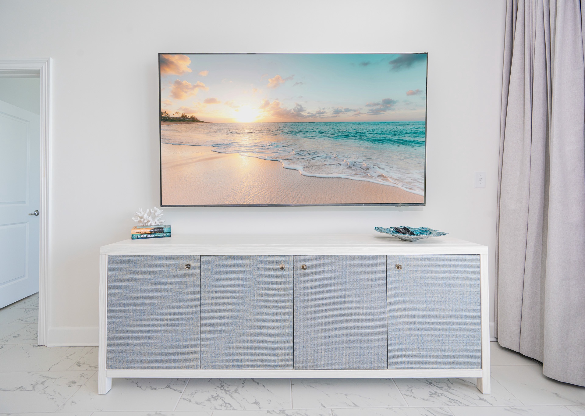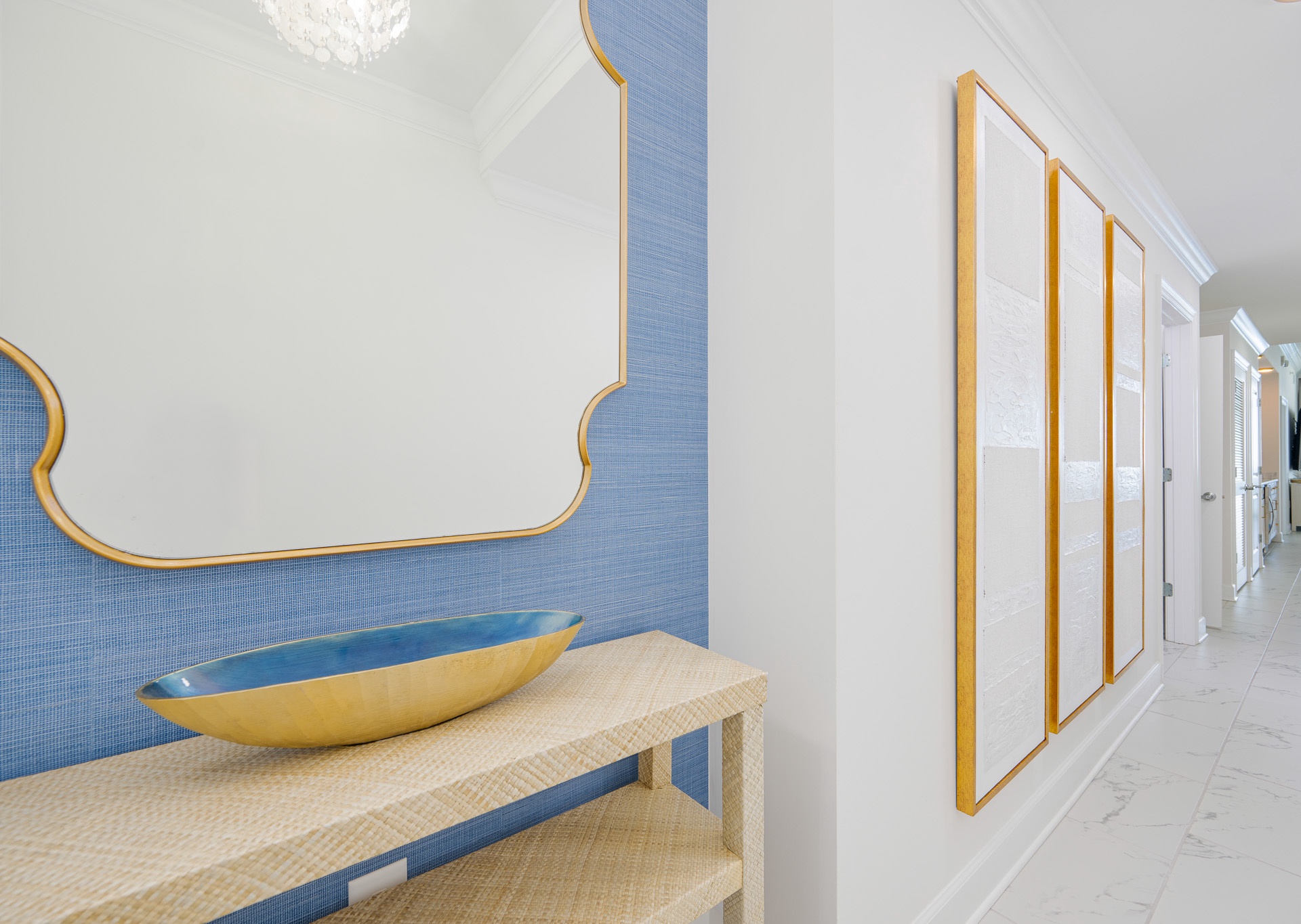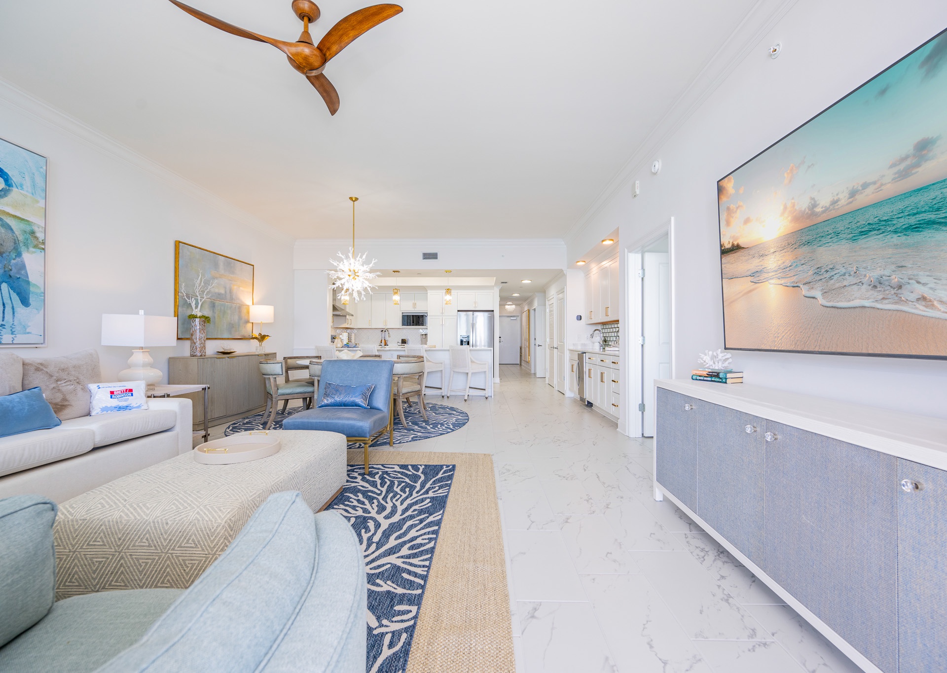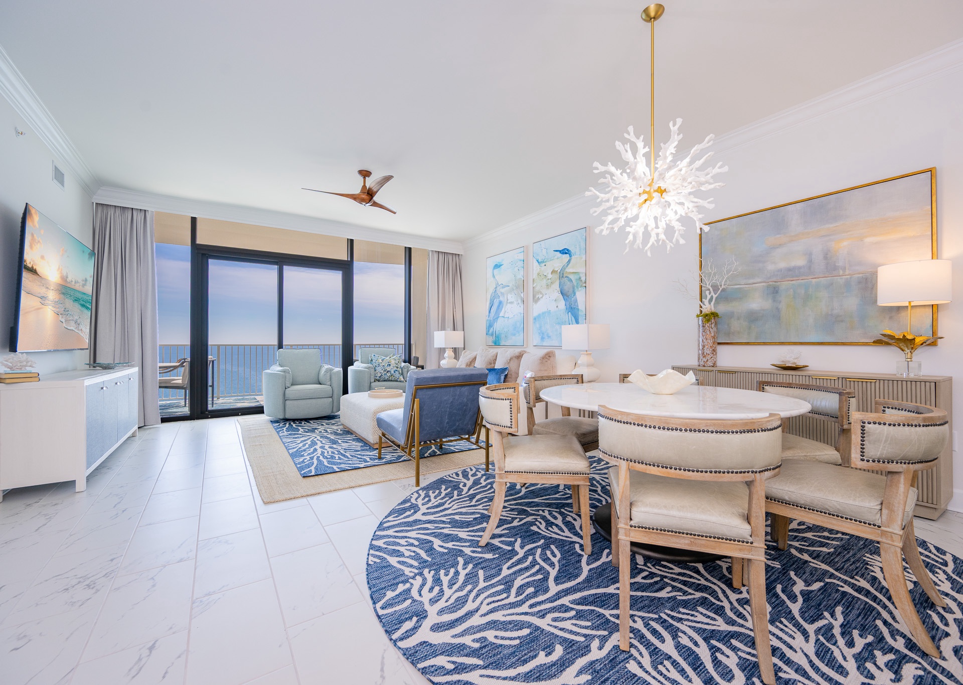 The entryway is beautifully accented, setting the tone the moment you walk in. Step outside to the expansive balcony, where you’ll find multiple seating areas designed for everyone to enjoy their own moment—tables for games, separate lounge spaces for relaxing, outdoor rugs for added comfort, and cushioned chaise lounges perfect for soaking in the views. Whether sipping a glass of wine or unwinding after a beach day, the balcony is a favorite gathering spot overlooking the Gulf.