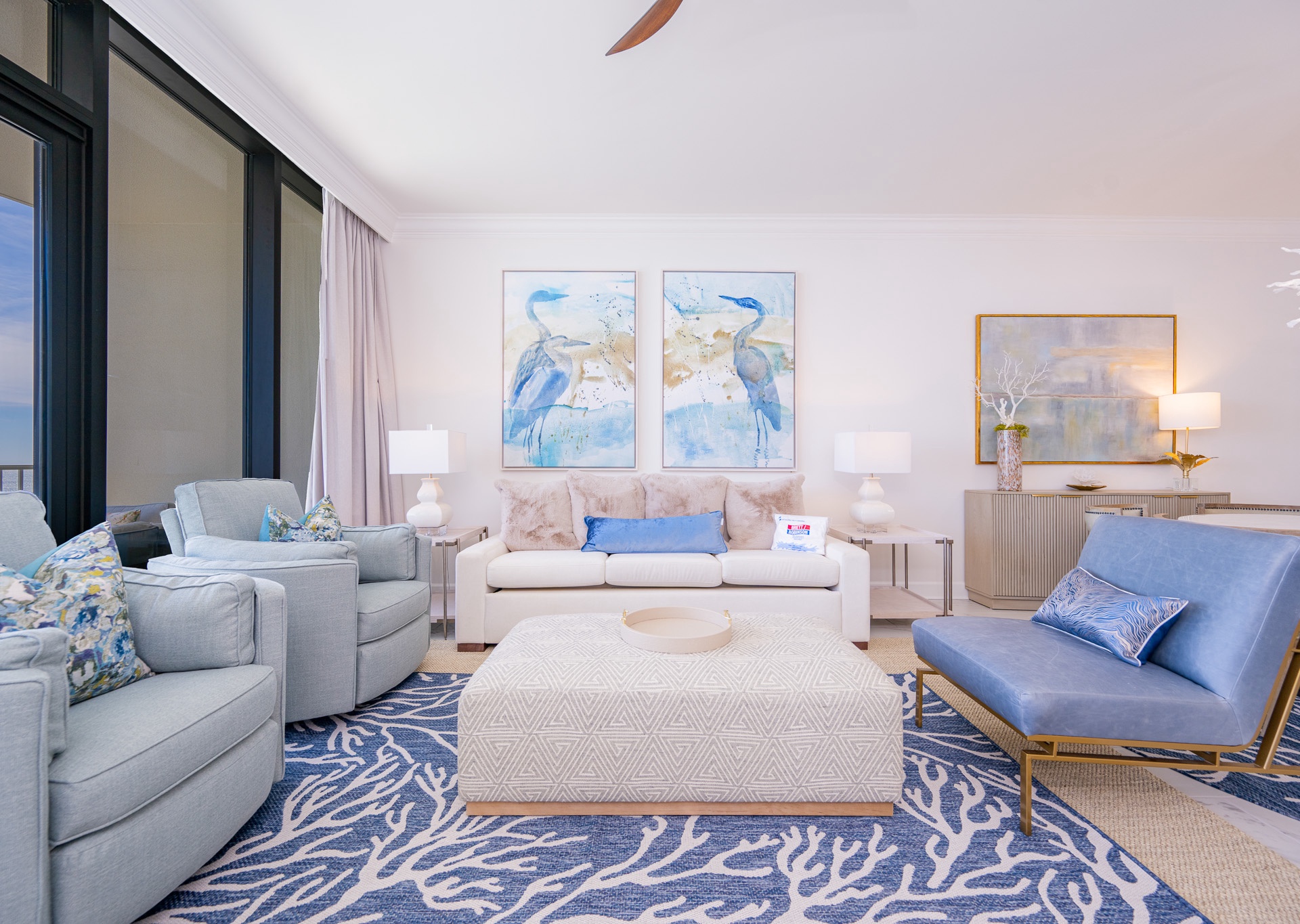 - Living areas with floor-to-ceiling windows, 10-foot smooth ceilings, large tile flooring, and crown molding.