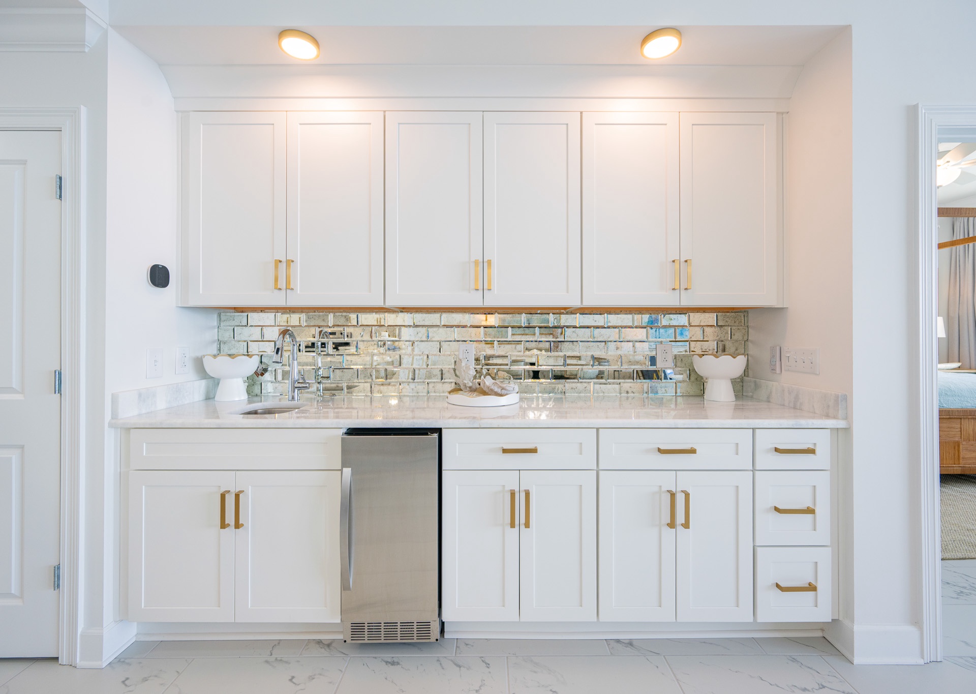 Just off the kitchen, the wet bar is ideal for entertaining, complete with an ice maker, separate sink, and plenty of glassware and stemware for hosting with ease.