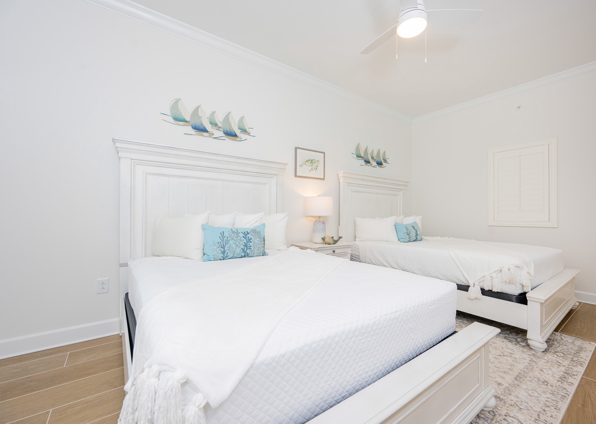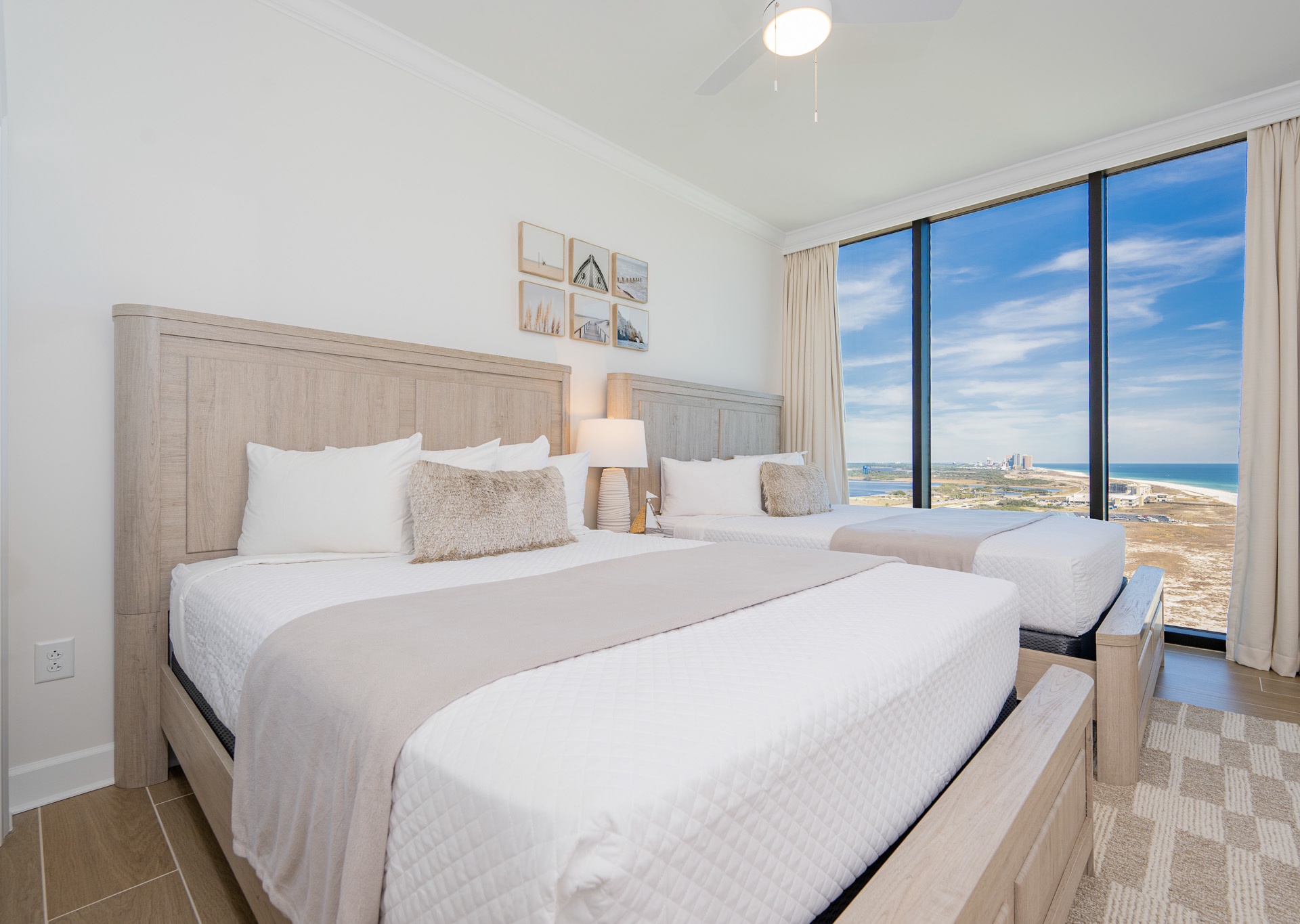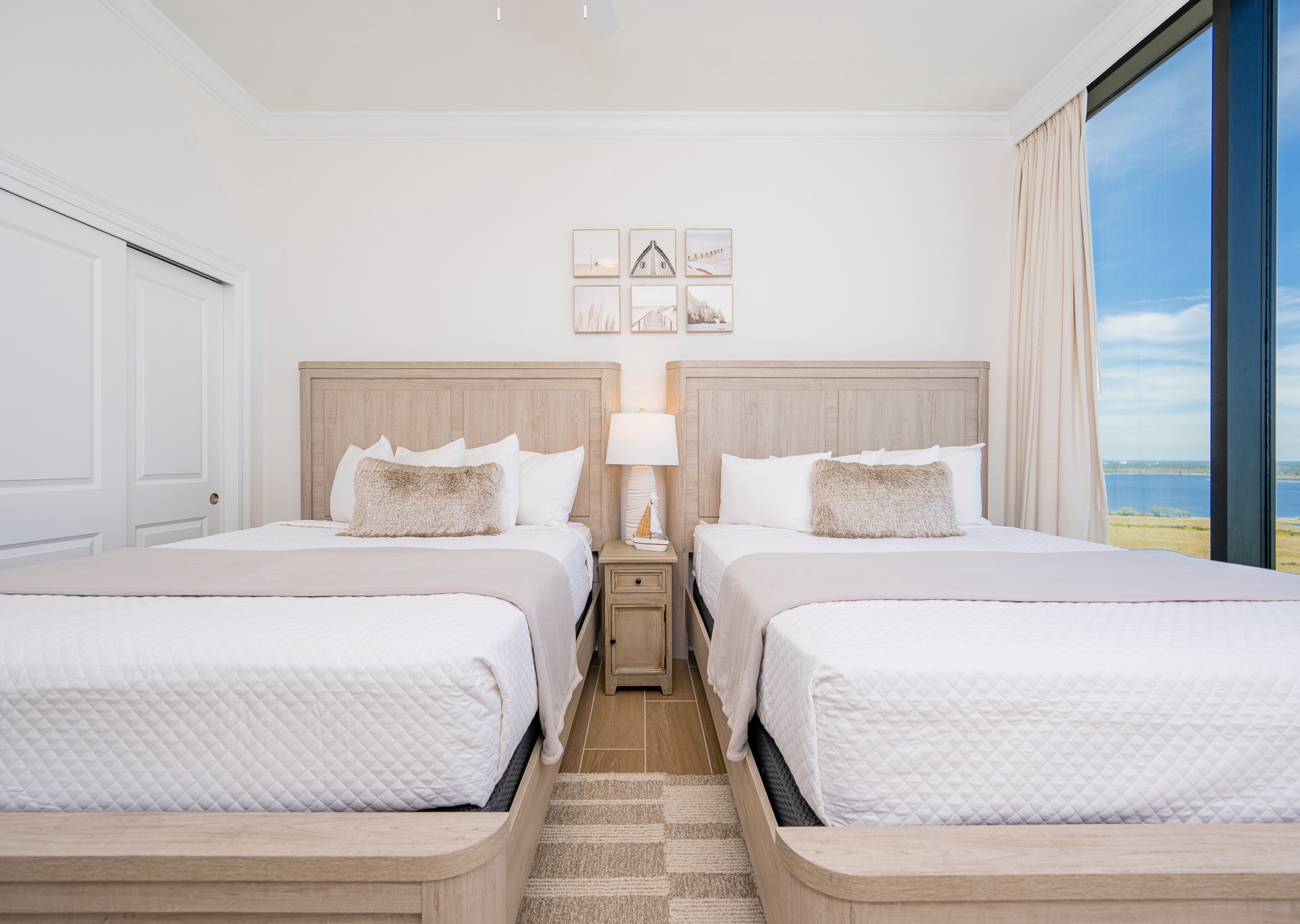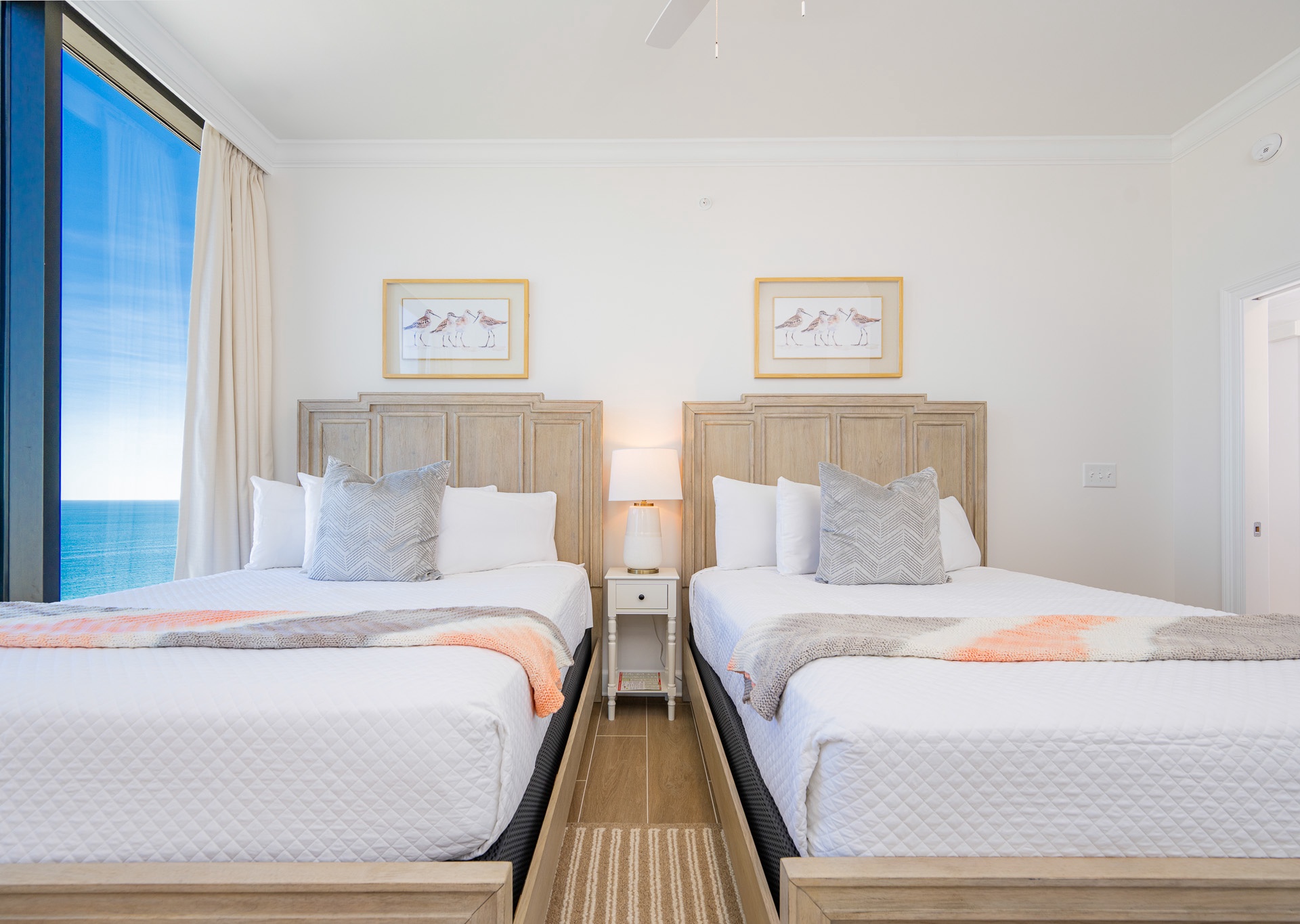 The second and third guest bedrooms each feature two queen beds, floor-to-ceiling windows with beautiful Gulf views, and private bathrooms with single vanities and glass walk-in showers. The fourth guest bedroom also offers two queen beds and has a bathroom accessible from both the bedroom and the hallway, complete with a single vanity and a glass walk-in shower—perfect for guests and convenience.