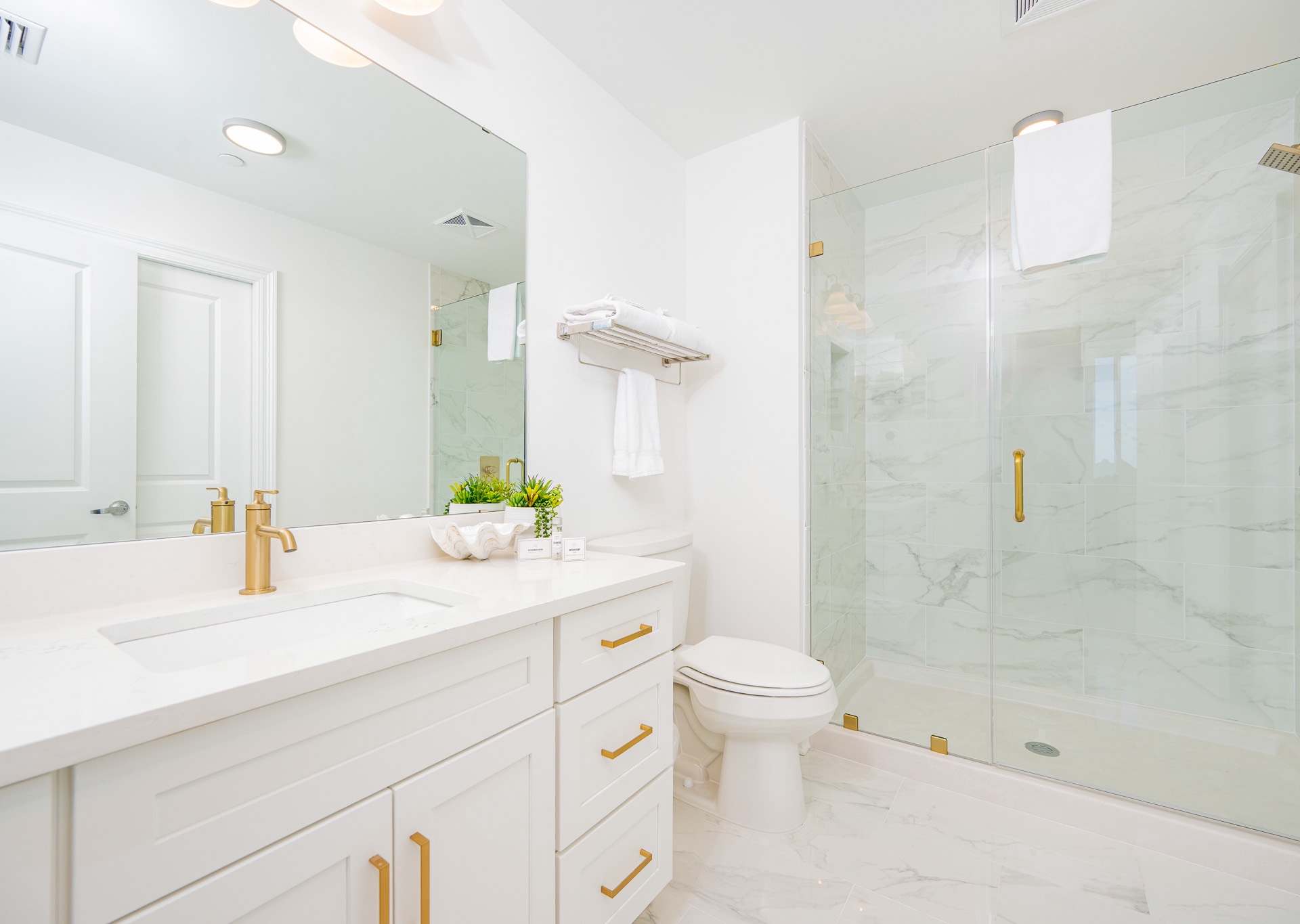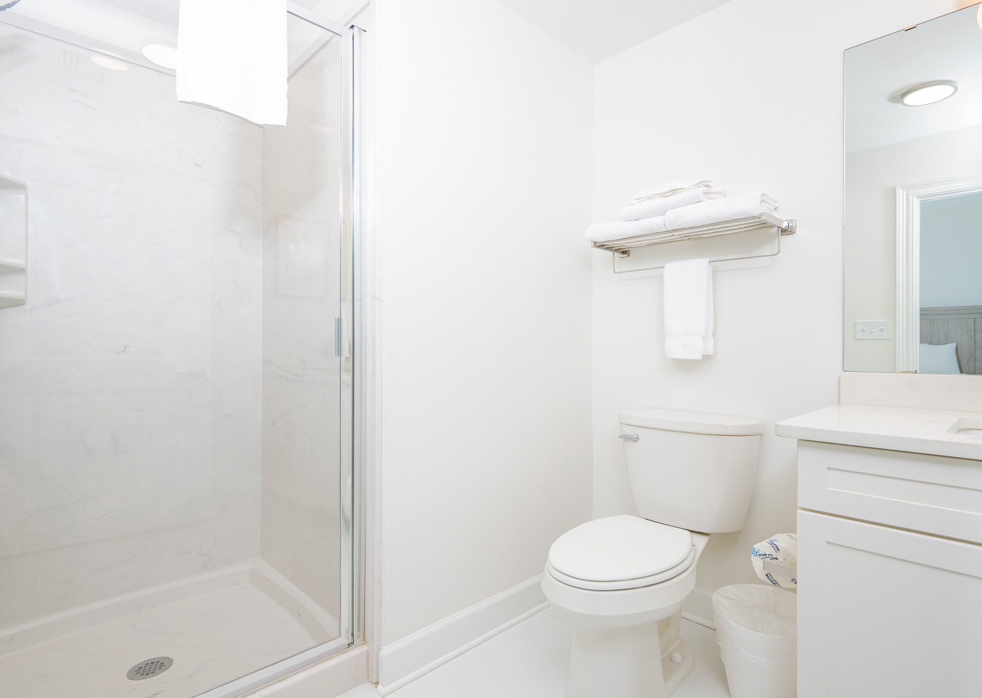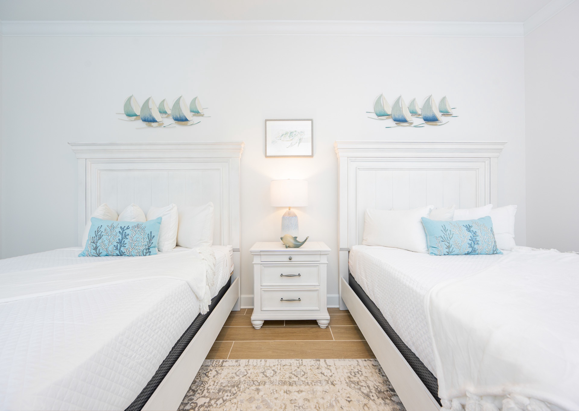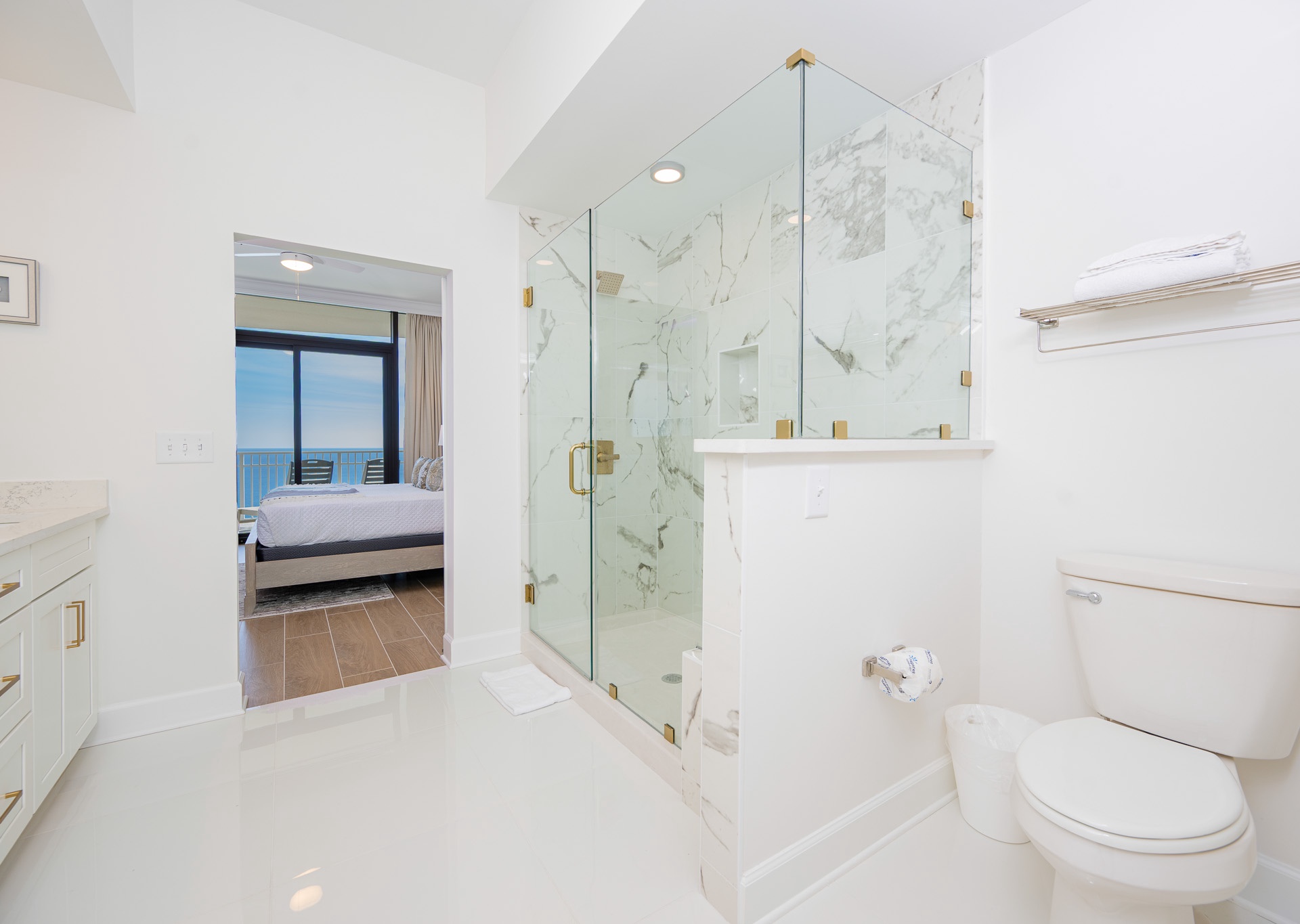 The second and third guest bedrooms each feature two queen beds, floor-to-ceiling windows with beautiful Gulf views, and private bathrooms with single vanities and glass walk-in showers. The fourth guest bedroom also offers two queen beds and has a bathroom accessible from both the bedroom and the hallway, complete with a single vanity and a glass walk-in shower—perfect for guests and convenience.