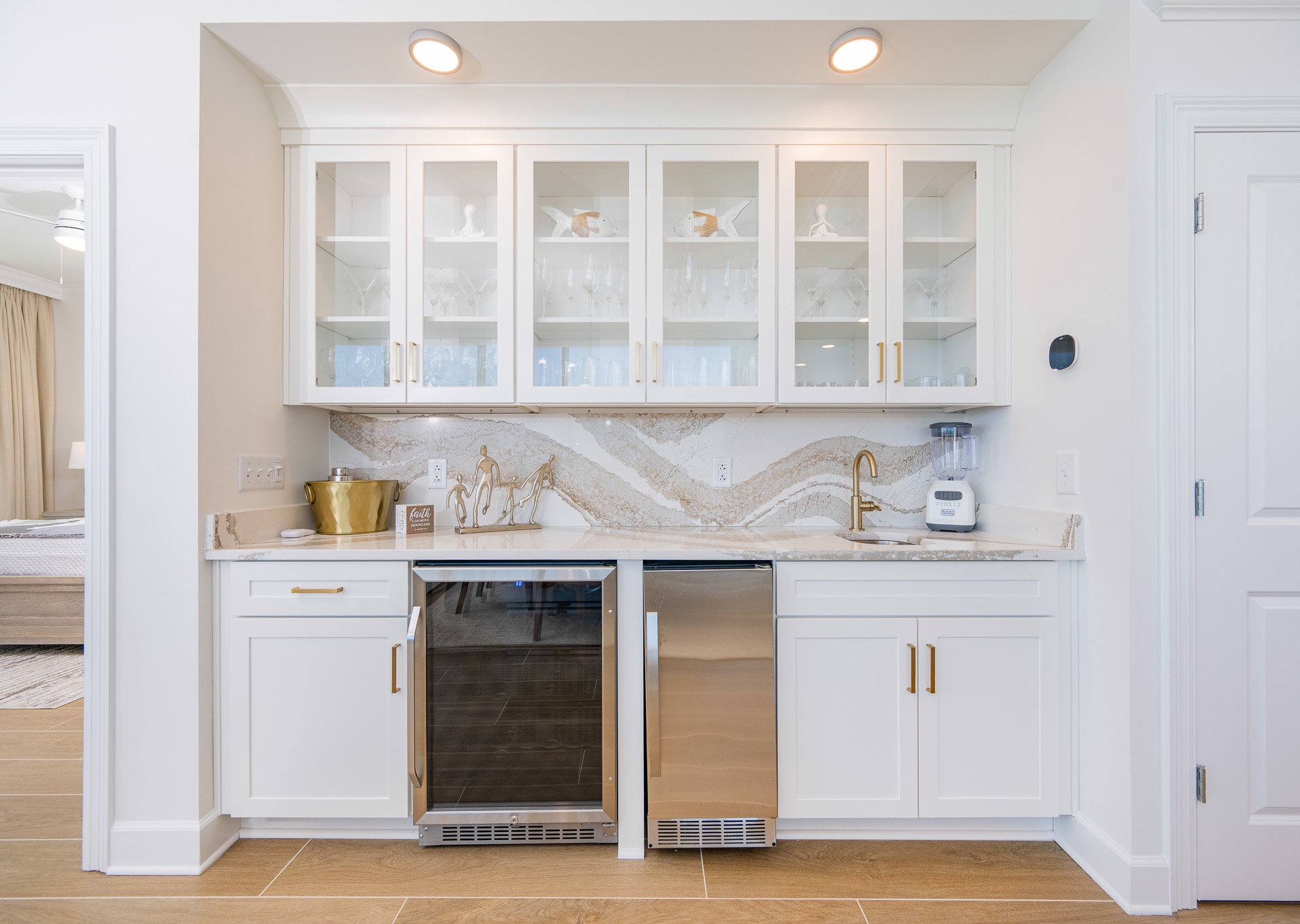 Just off the kitchen is an adjacent bar area designed for entertaining, complete with an ice maker, beverage refrigerator, separate sink, and ample stemware. Thoughtfully placed area rugs throughout the condo add warmth and comfort, enhancing the inviting atmosphere.