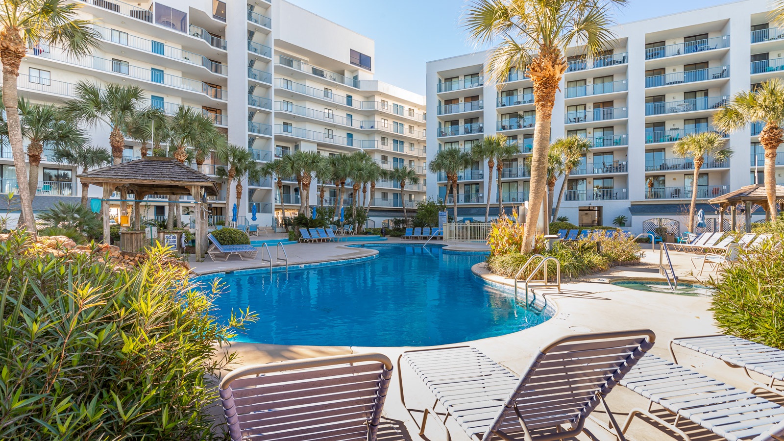 This tropical oasis has everything you need for a relaxing Gulf Shores vacation – and more. Perched on the edge of Little Lagoon, the views from the waterfront tennis, pickleball, and shuffleboard courts are what it’s all about. Lounge poolside by the lagoon-shaped outdoor pool and hot tub, surrounded by lush tropical landscaping that will have you living that island life right here in Gulf Shores.