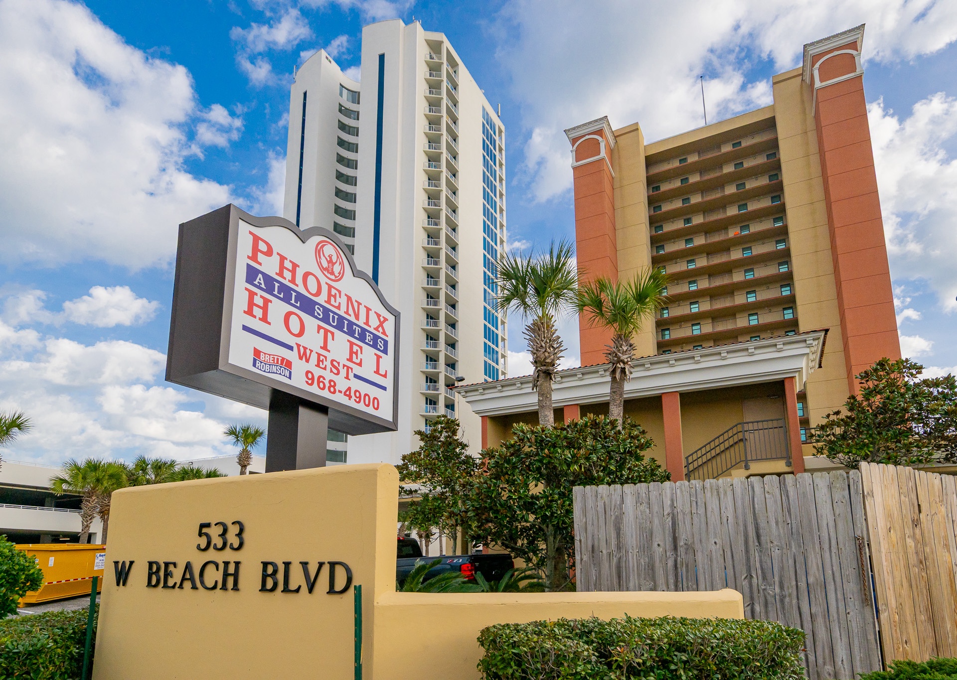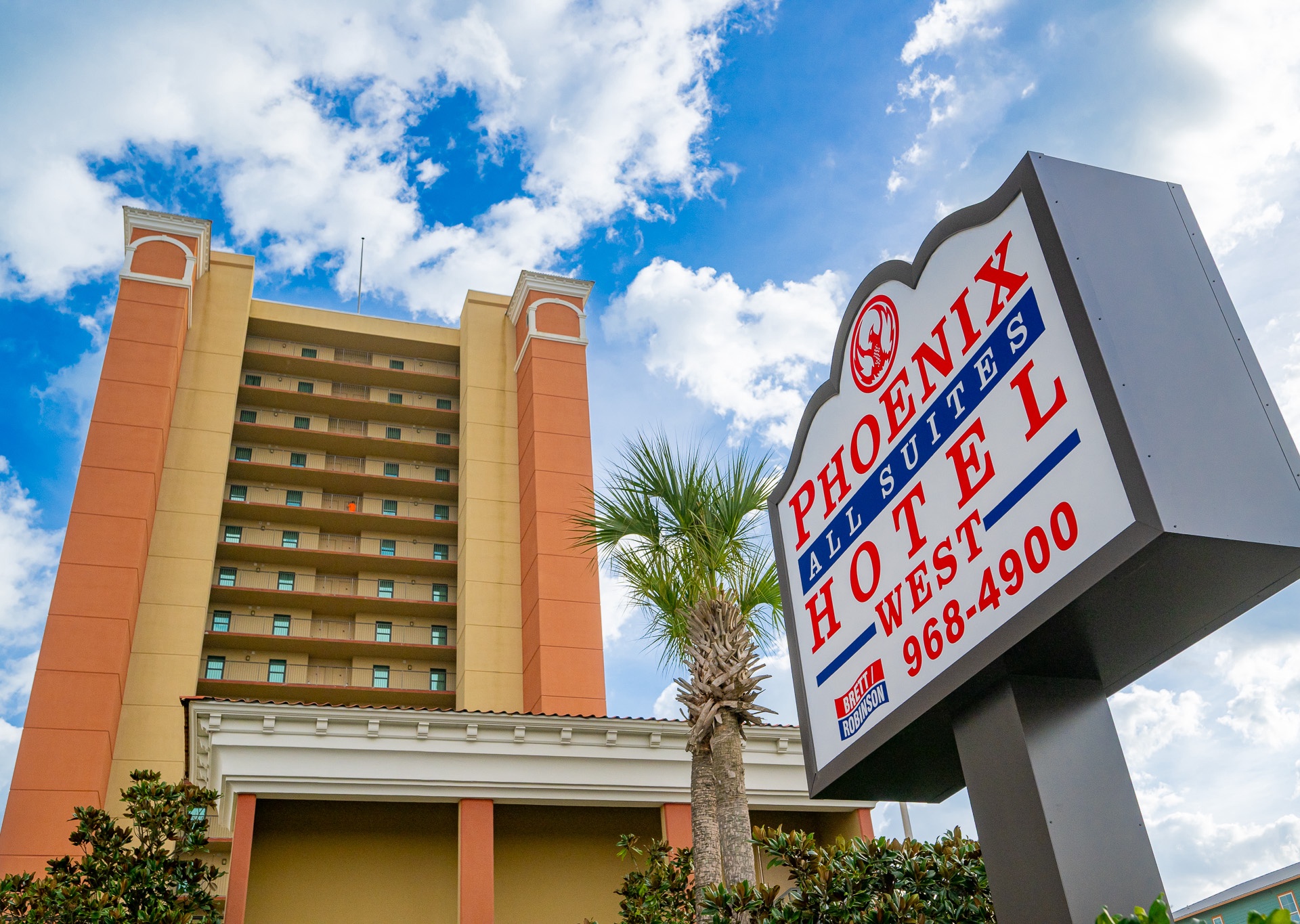 Phoenix All Suites West Hotel is a beachfront hotel located directly on the sand in Gulf Shores, Alabama. The property offers spacious one-bedroom hotel suites designed for family stays, each featuring a private balcony with views of the Gulf of Mexico and direct beach access.