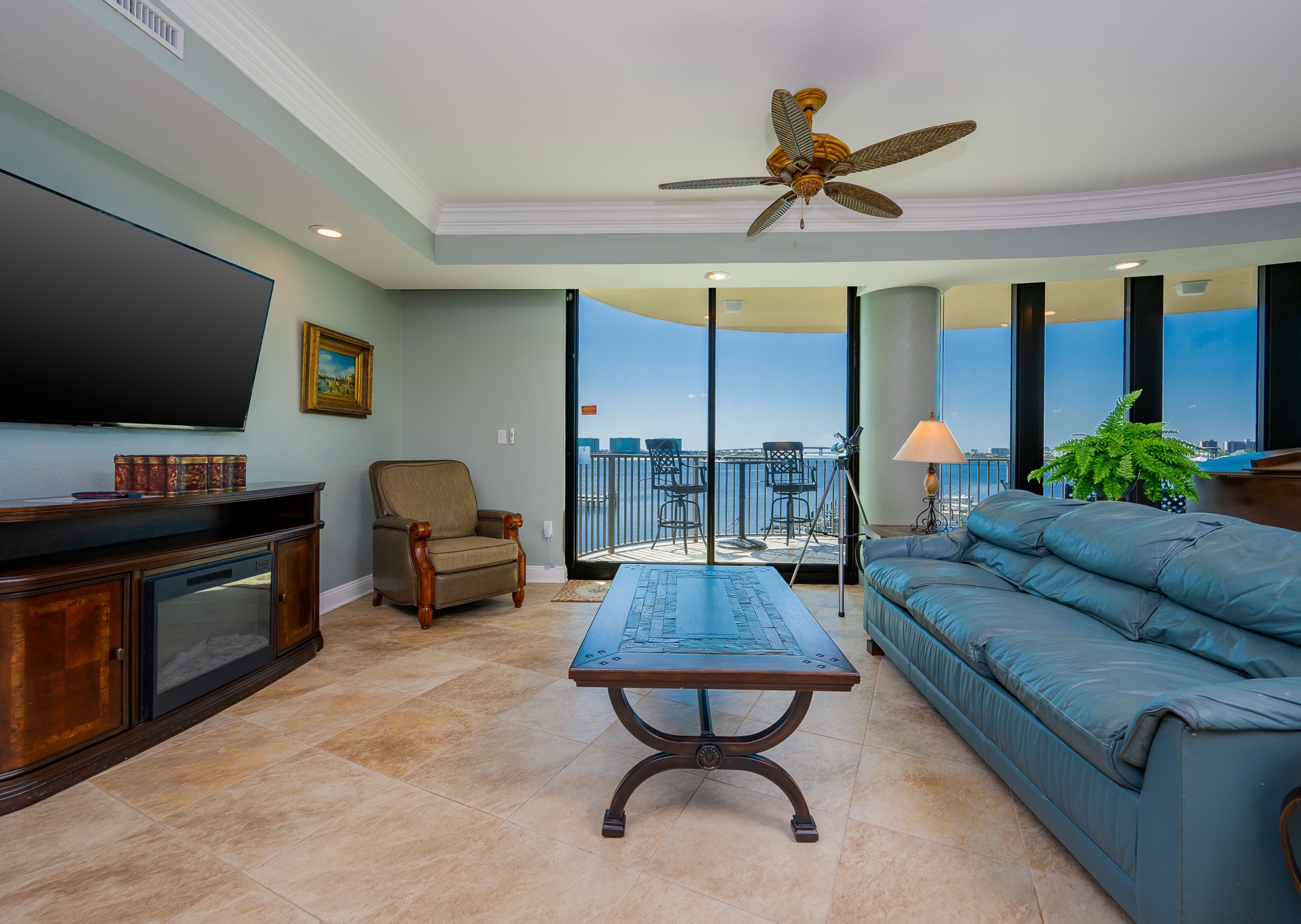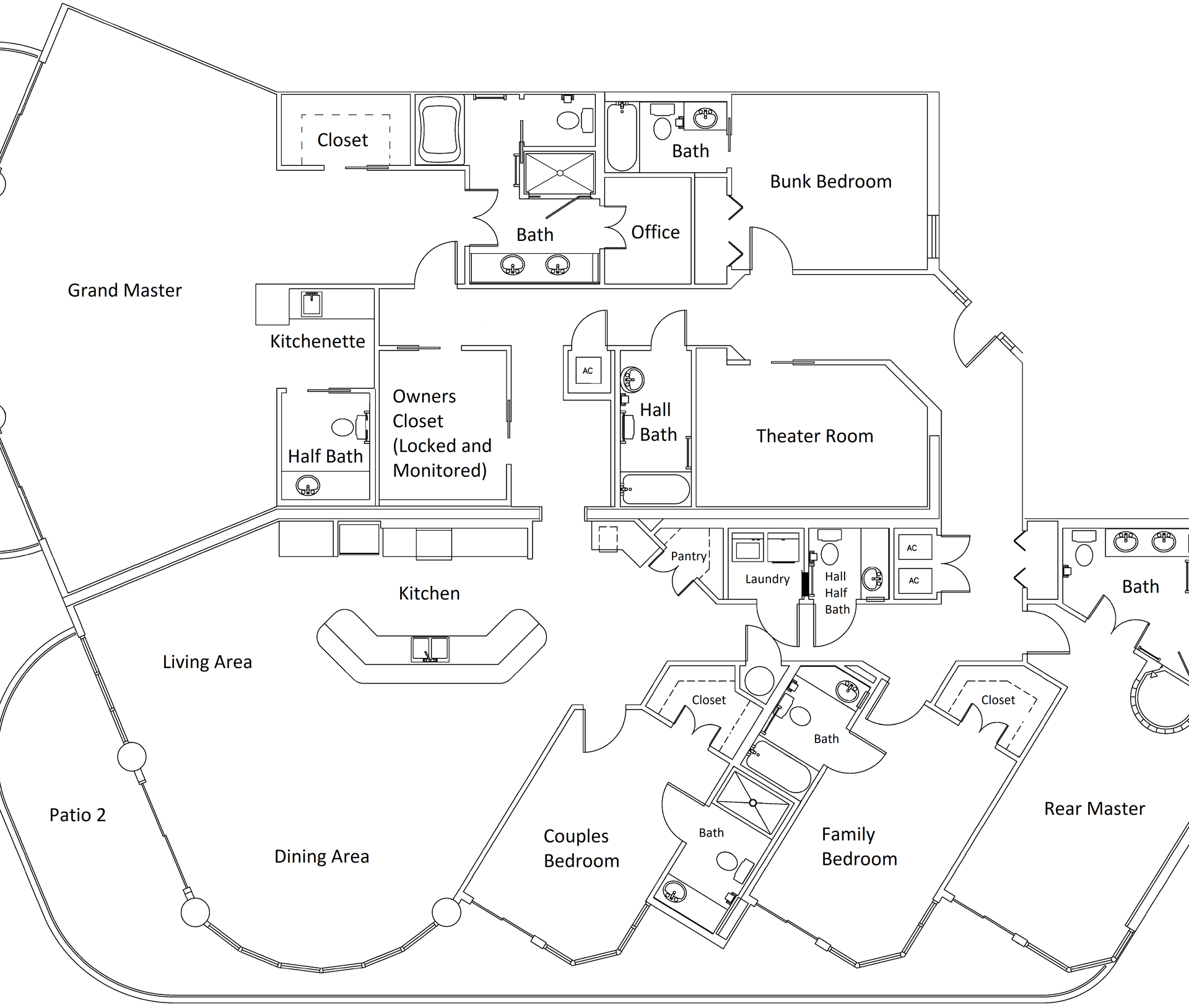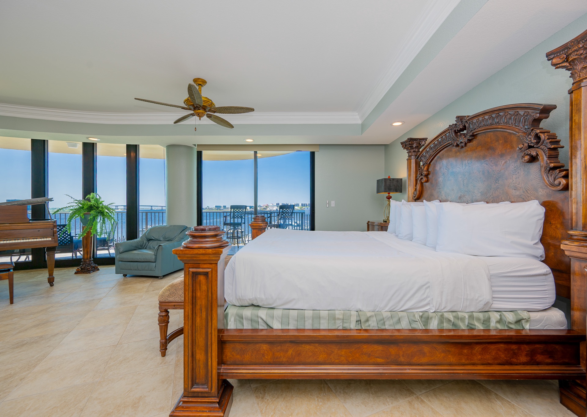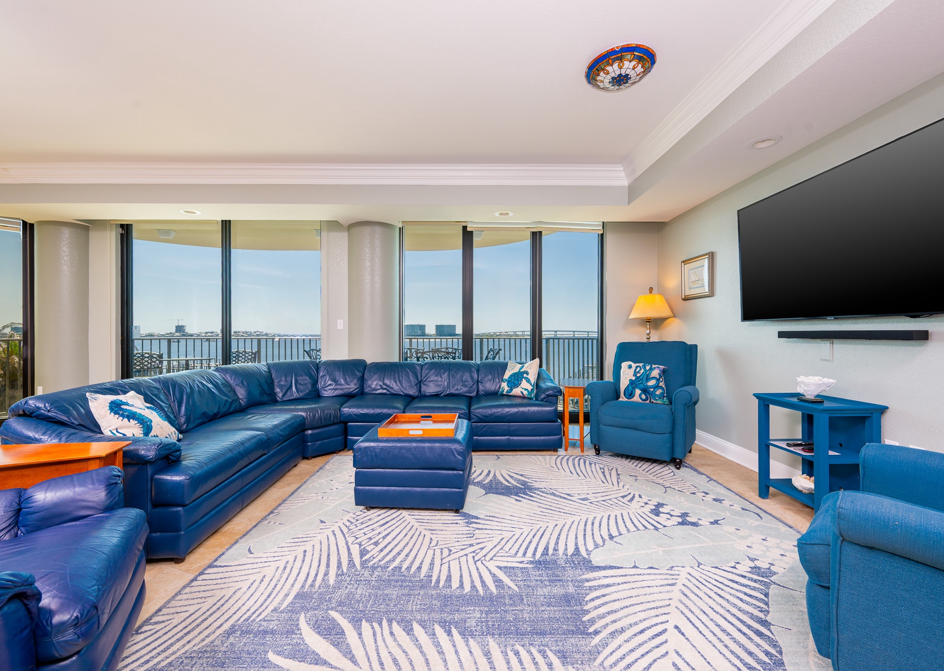All bedrooms have their own private full-sized bathroom attached. There are 2 master bedrooms, each with a walk-in shower, whirlpool tub, heated towel bars, and other amenities. The Grand Master has a separate living room space as its own private oasis away from the crowd, a baby grand piano, a large private waterfront balcony, a butler’s pantry area, and an additional half bathroom adjacent to the living room of the suite. Finally, also adjacent to the room, there is a small, secluded office space and writing desk for those needing to work while away. The rear master bedroom contains a nursery with space for those who wish to bring their own pack-and-play for their children. In addition to the two master bedrooms, there is a couple’s bedroom with a king-size bed, a family bedroom consisting of a queen-sized bed along with a twin/trundle bed, and a bunk room that contains a custom-built bunk bed containing four separate full-sized beds (two with private TV's and two with adjustable reading lamps). The bunkroom also has easy access to an additional full-sized bathroom, across the hall, besides the one adjoining the room. Enjoy the theater room with an 80-inch theater sized television, premium surround sound, and reclining leather theater couches. To complete the experience, the unit as adorned with artwork by various European and American masters, adding a touch of cultural richness throughout.