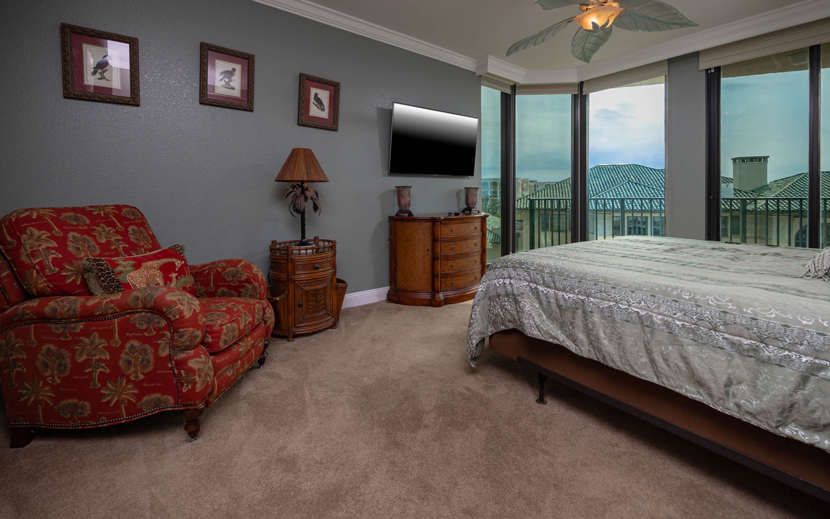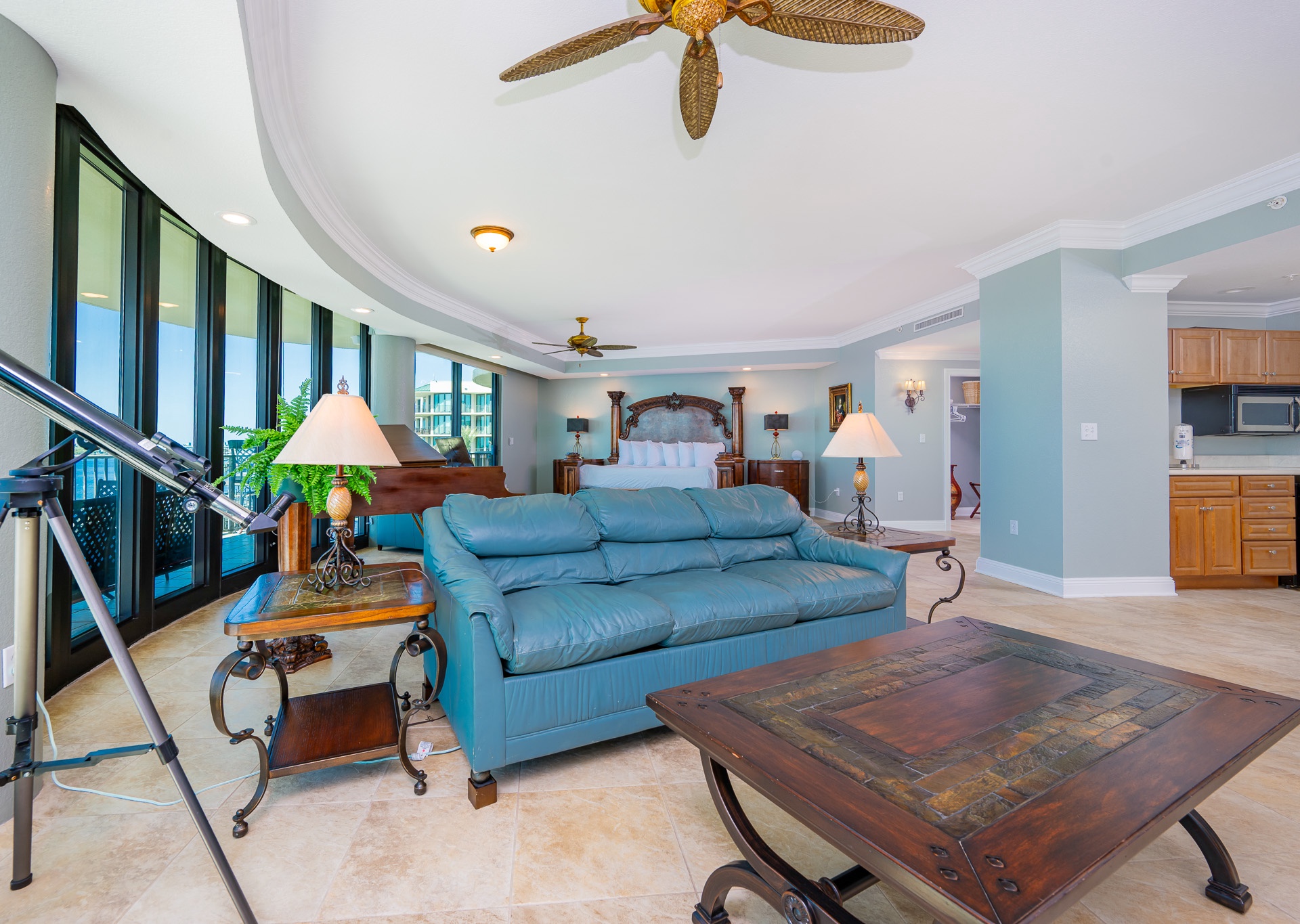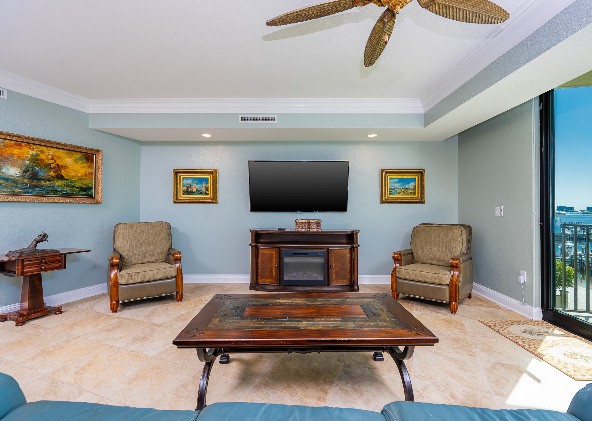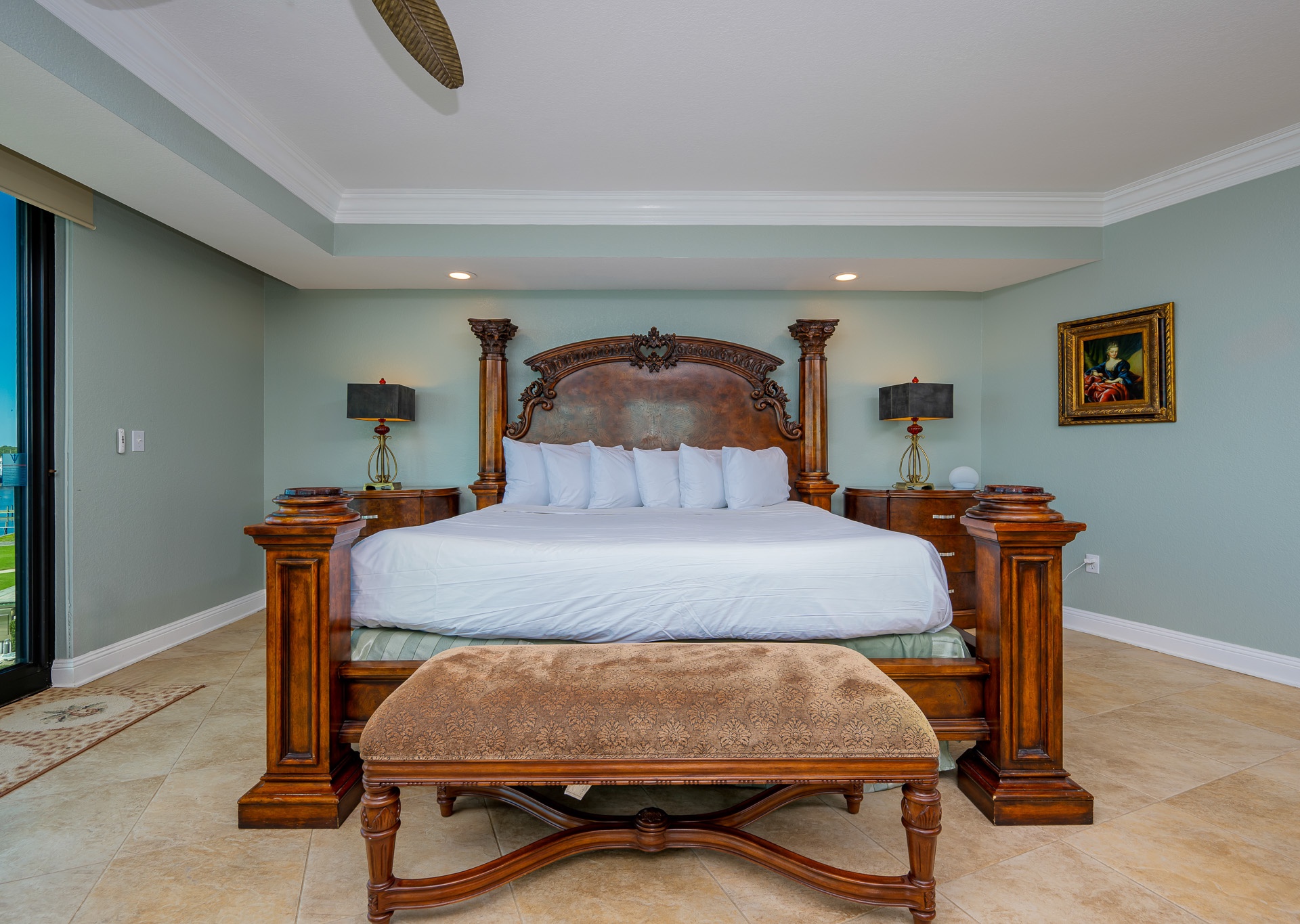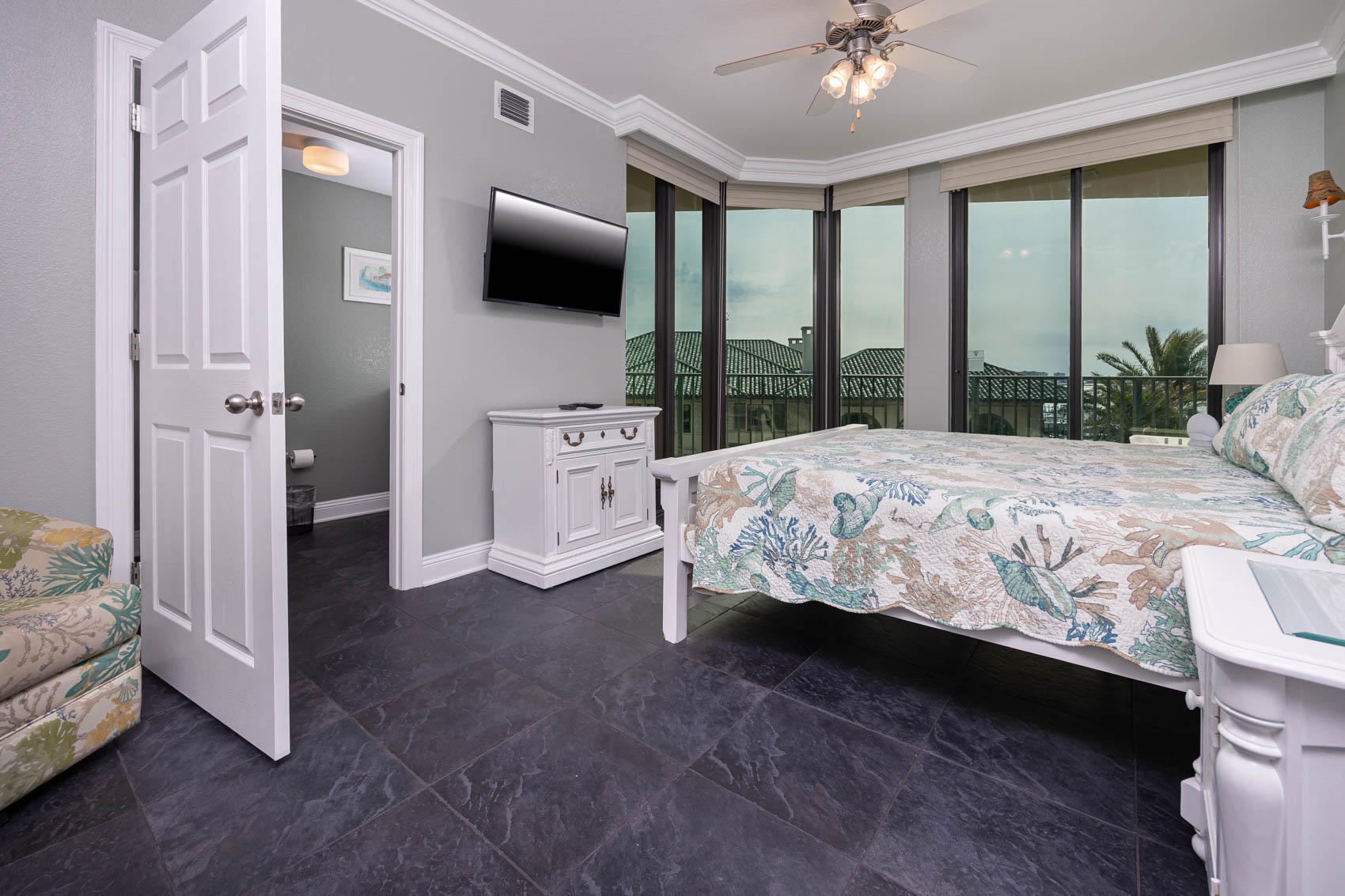 All bedrooms have their own private full-sized bathroom attached. There are 2 master bedrooms, each with a walk-in shower, whirlpool tub, heated towel bars, and other amenities. The Grand Master has a separate living room space as its own private oasis away from the crowd, a baby grand piano, a large private waterfront balcony, a butler’s pantry area, and an additional half bathroom adjacent to the living room of the suite. Finally, also adjacent to the room, there is a small, secluded office space and writing desk for those needing to work while away. The rear master bedroom contains a nursery with space for those who wish to bring their own pack-and-play for their children. In addition to the two master bedrooms, there is a couple’s bedroom with a king-size bed, a family bedroom consisting of a queen-sized bed along with a twin/trundle bed, and a bunk room that contains a custom-built bunk bed containing four separate full-sized beds (two with private TV's and two with adjustable reading lamps). The bunkroom also has easy access to an additional full-sized bathroom, across the hall, besides the one adjoining the room. Enjoy the theater room with an 80-inch theater sized television, premium surround sound, and reclining leather theater couches. To complete the experience, the unit as adorned with artwork by various European and American masters, adding a touch of cultural richness throughout.