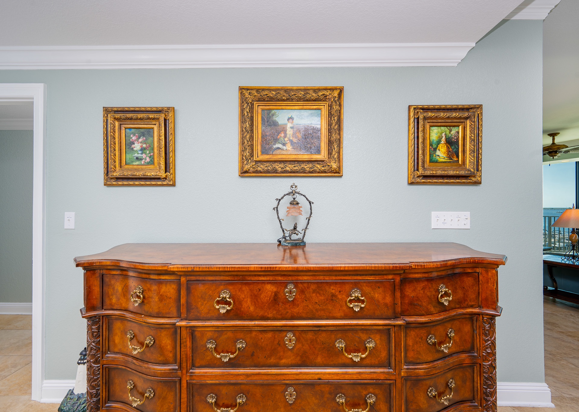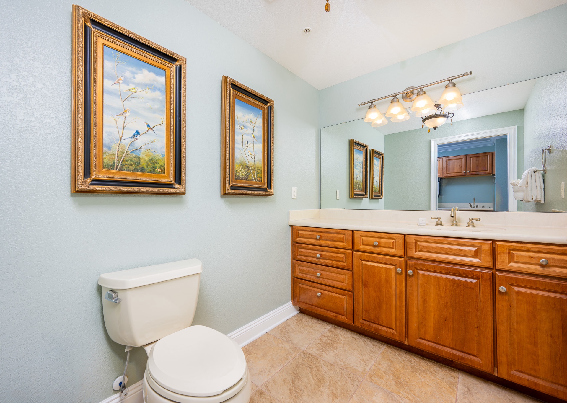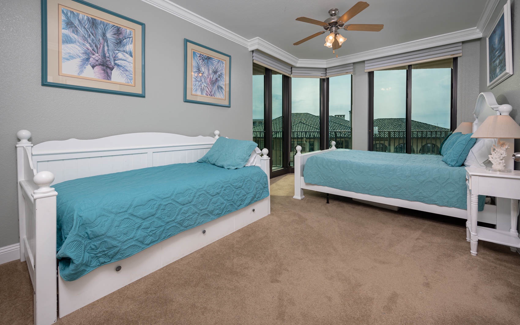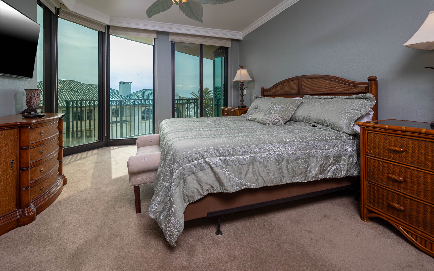 All bedrooms have their own private full-sized bathroom attached. There are 2 master bedrooms, each with a walk-in shower, whirlpool tub, heated towel bars, and other amenities. The Grand Master has a separate living room space as its own private oasis away from the crowd, a baby grand piano, a large private waterfront balcony, a butler’s pantry area, and an additional half bathroom adjacent to the living room of the suite. Finally, also adjacent to the room, there is a small, secluded office space and writing desk for those needing to work while away. The rear master bedroom contains a nursery with space for those who wish to bring their own pack-and-play for their children. In addition to the two master bedrooms, there is a couple’s bedroom with a king-size bed, a family bedroom consisting of a queen-sized bed along with a twin/trundle bed, and a bunk room that contains a custom-built bunk bed containing four separate full-sized beds (two with private TV's and two with adjustable reading lamps). The bunkroom also has easy access to an additional full-sized bathroom, across the hall, besides the one adjoining the room. Enjoy the theater room with an 80-inch theater sized television, premium surround sound, and reclining leather theater couches. To complete the experience, the unit as adorned with artwork by various European and American masters, adding a touch of cultural richness throughout.