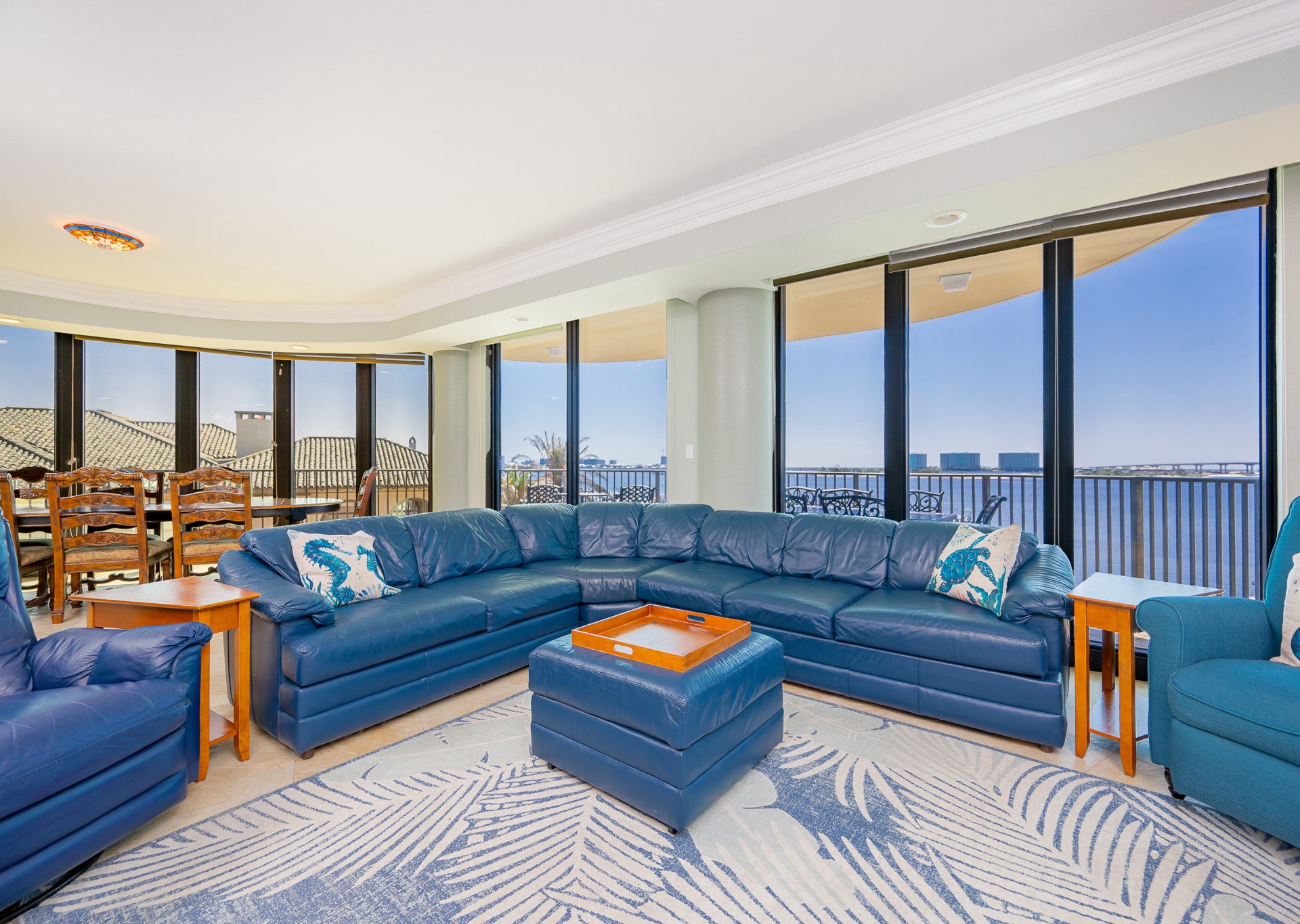 The Poseidon House, unit 1333, is a custom penthouse unit of nearly 4500 square feet, within the Phoenix on The Bay resort complex. This condo comfortably sleeps up to 22 guests to accommodate your entire family needs. The Poseidon House boasts five spacious bedrooms, 6 full bathrooms, 2 half bathrooms, a theater room, 2 large wrap-around balconies, and a large combined living room, kitchen, and dining area with bar top seating and a dining table for 8. There is an additional 40-foot boat slip available to rent for those who wish to bring their own boat. Experience unparalleled views of the bay and the outlet into the Gulf of America. Here you can witness both the breathtaking sunrise over the bay and a mesmerizing sunset, all from one incredible vantage point.