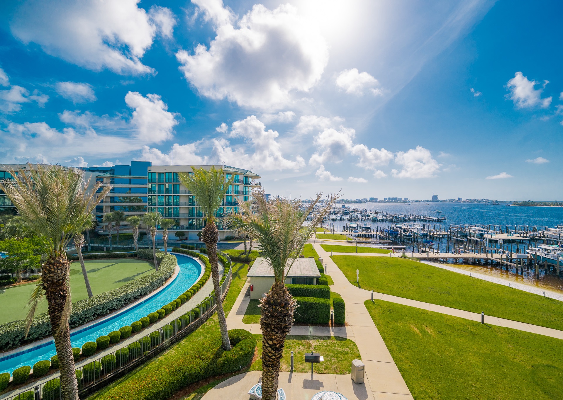 Phoenix on the Bay features several luxury amenities including: indoor and outdoor pools, kiddie pool, lazy river, slide, marina, boat slips, boat launch, sauna, steam room, hot tubs, fitness center, putting green, tennis court, pickleball court, basketball, covered parking, and barbeque grills.
