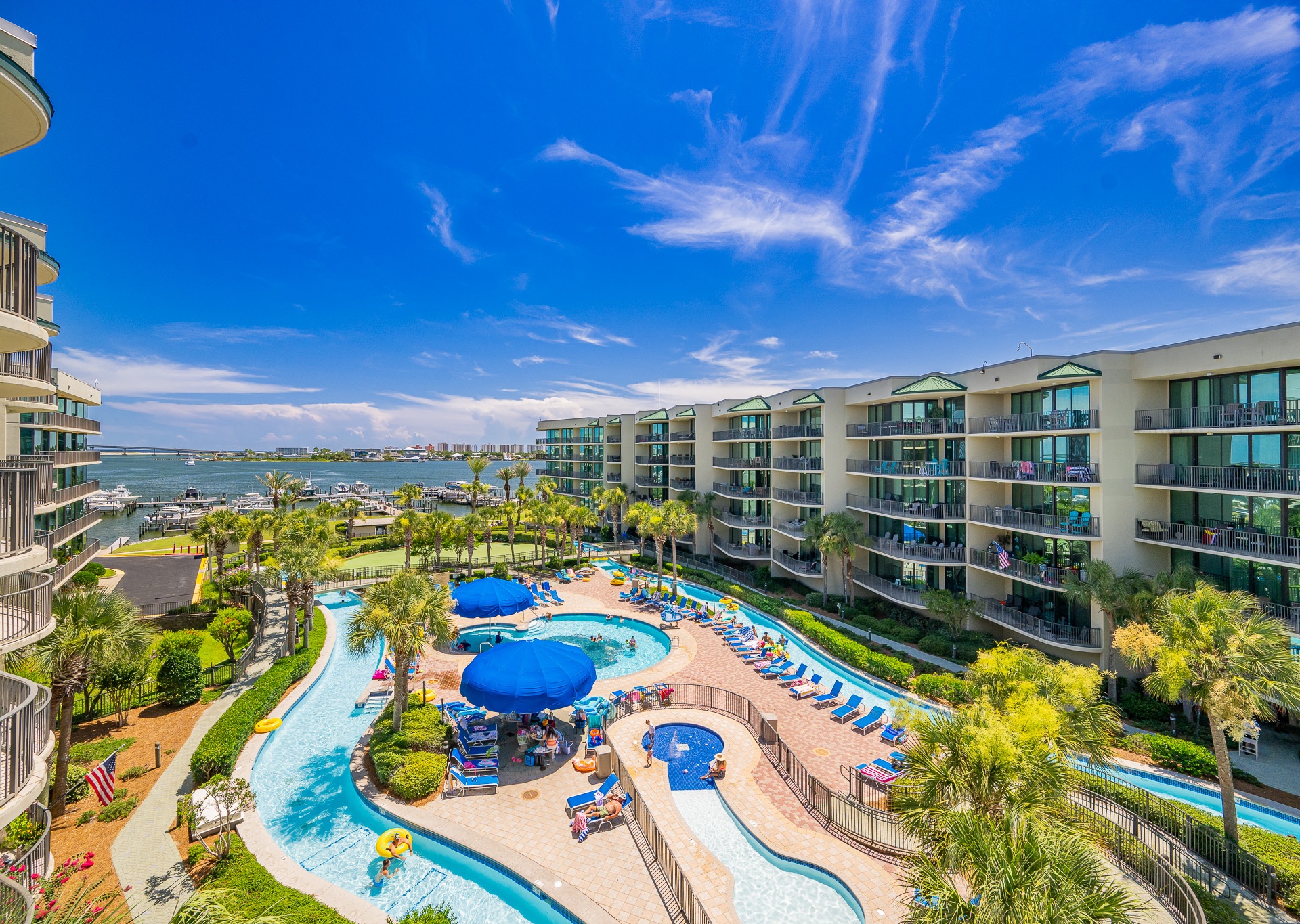 Phoenix on the Bay features several luxury amenities including: indoor and outdoor pools, kiddie pool, lazy river, slide, marina, boat slips, boat launch, sauna, steam room, hot tubs, fitness center, putting green, tennis court, pickleball court, basketball, covered parking, and barbeque grills.