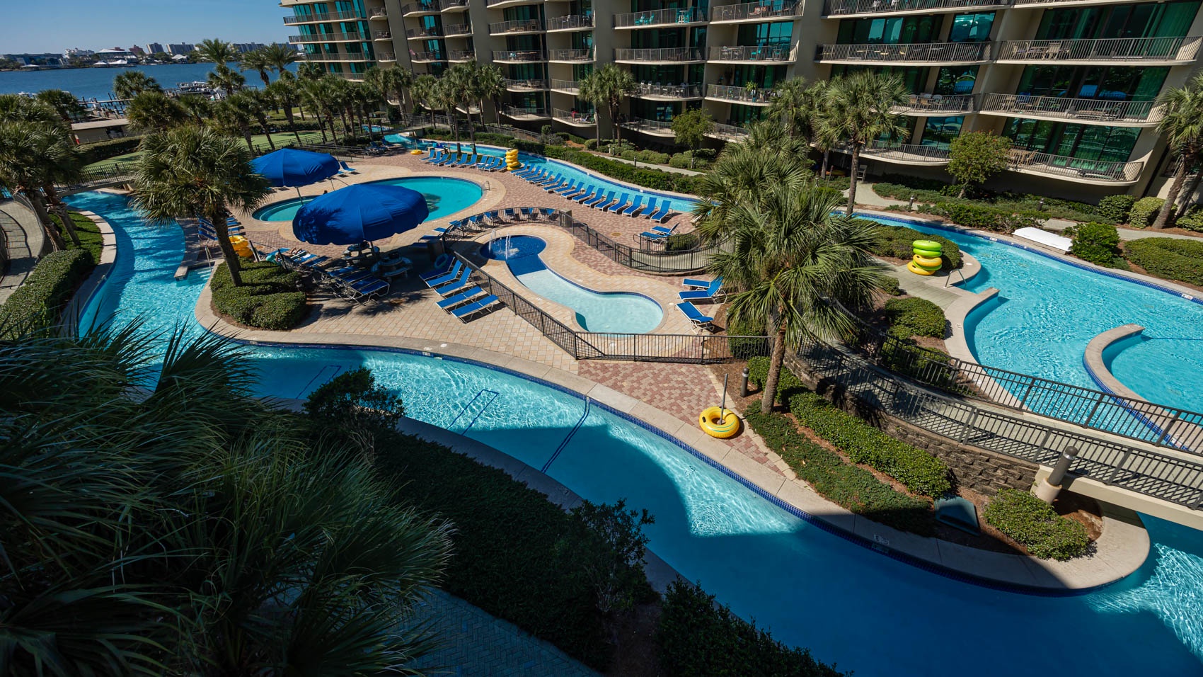 Phoenix on the Bay features several luxury amenities including: indoor and outdoor pools, kiddie pool, lazy river, slide, marina, boat slips, boat launch, sauna, steam room, hot tubs, fitness center, putting green, tennis court, pickleball court, basketball, covered parking, and barbeque grills.