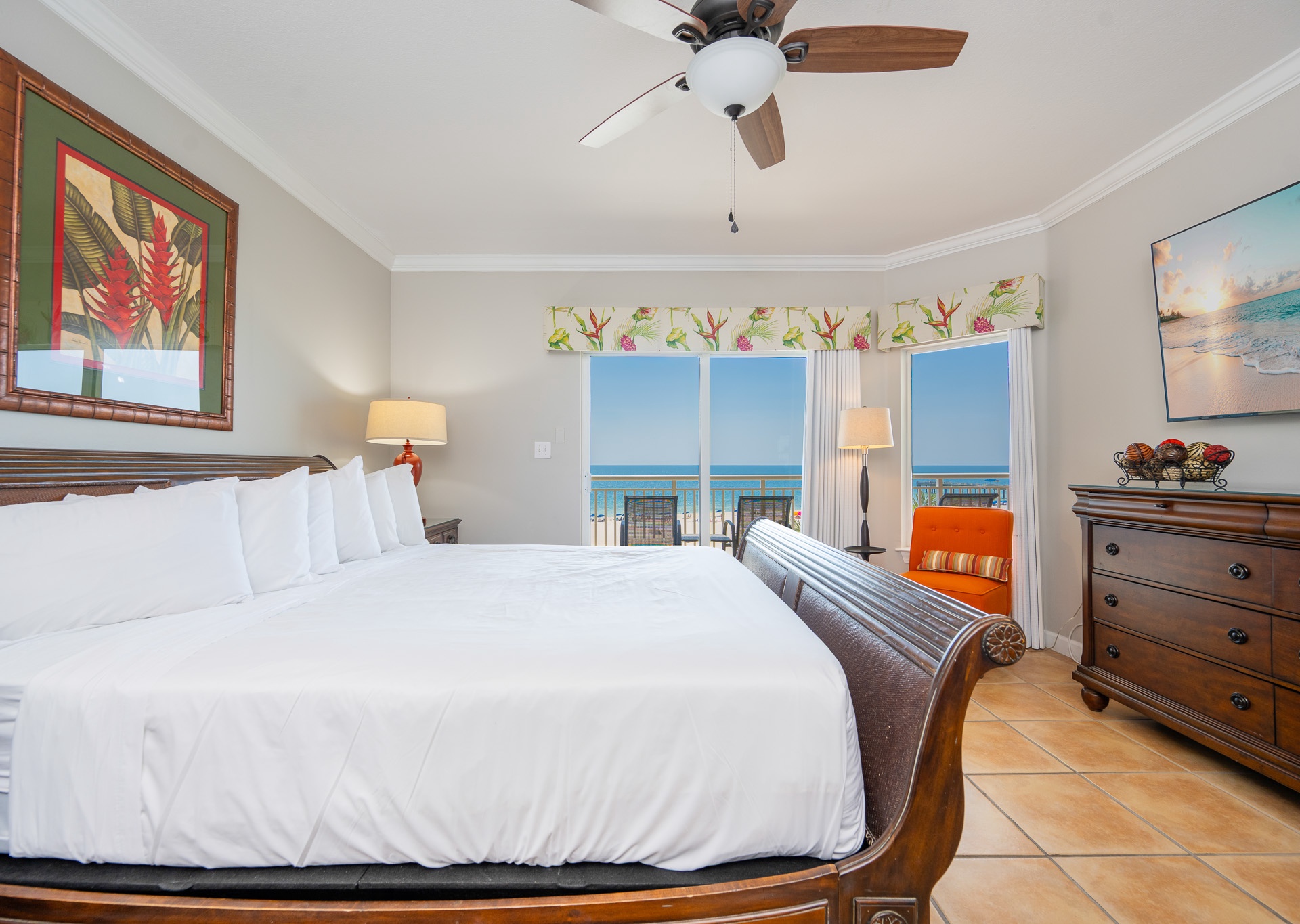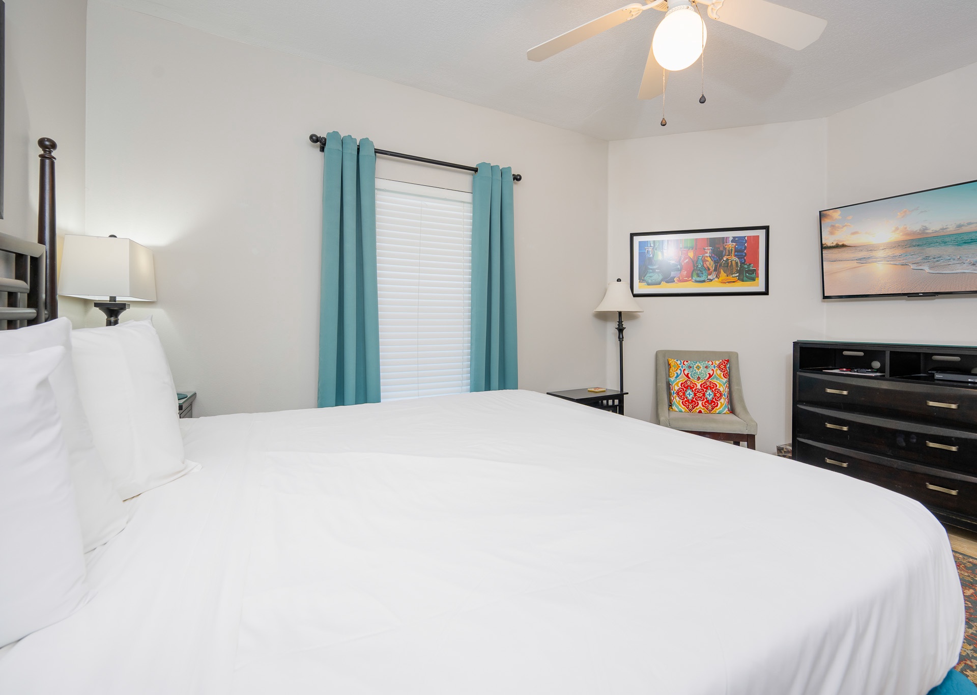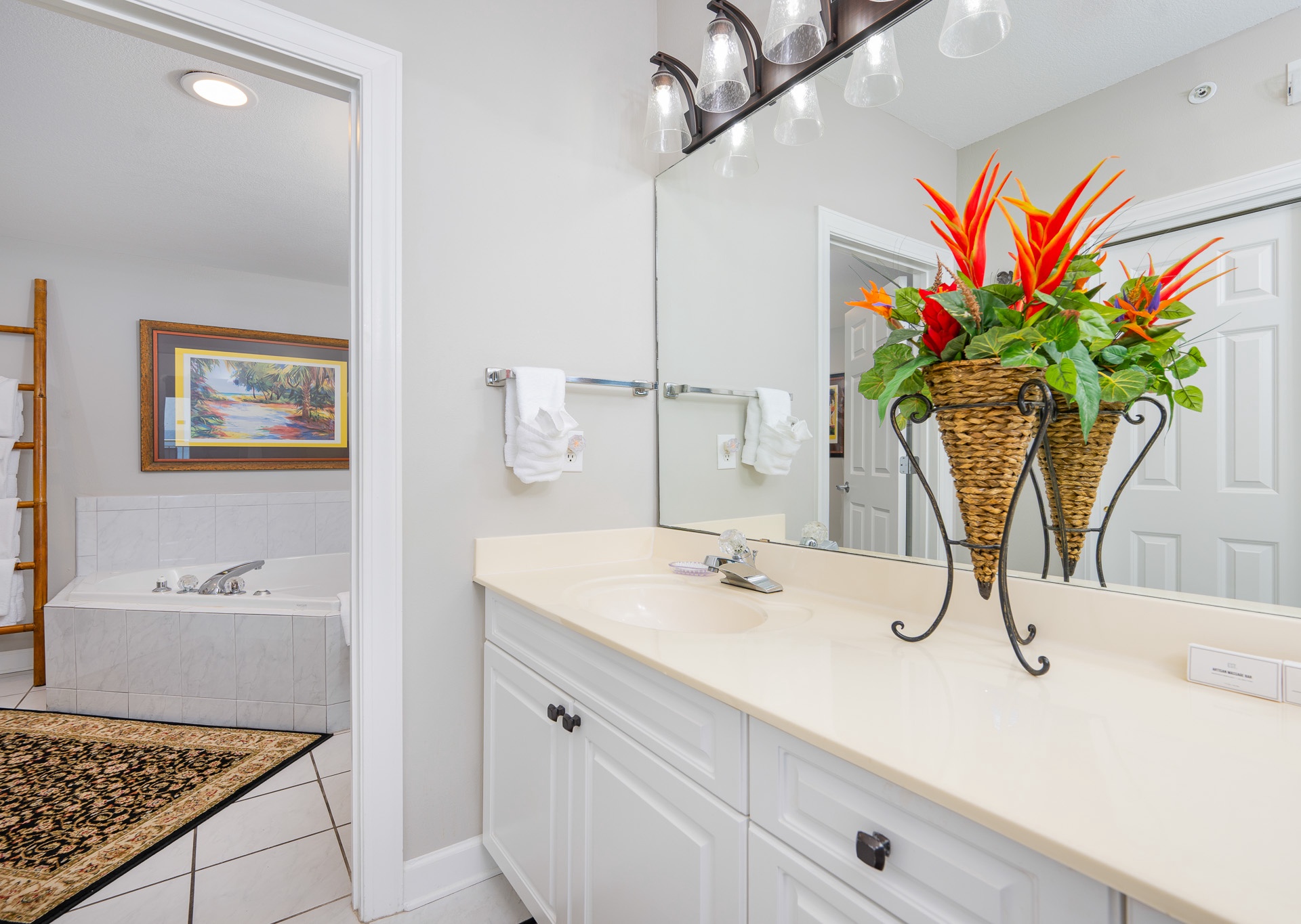 • 2nd Bedroom: King bed, flat-screen TV, private bath with single vanity and tub/shower combo with private water closet