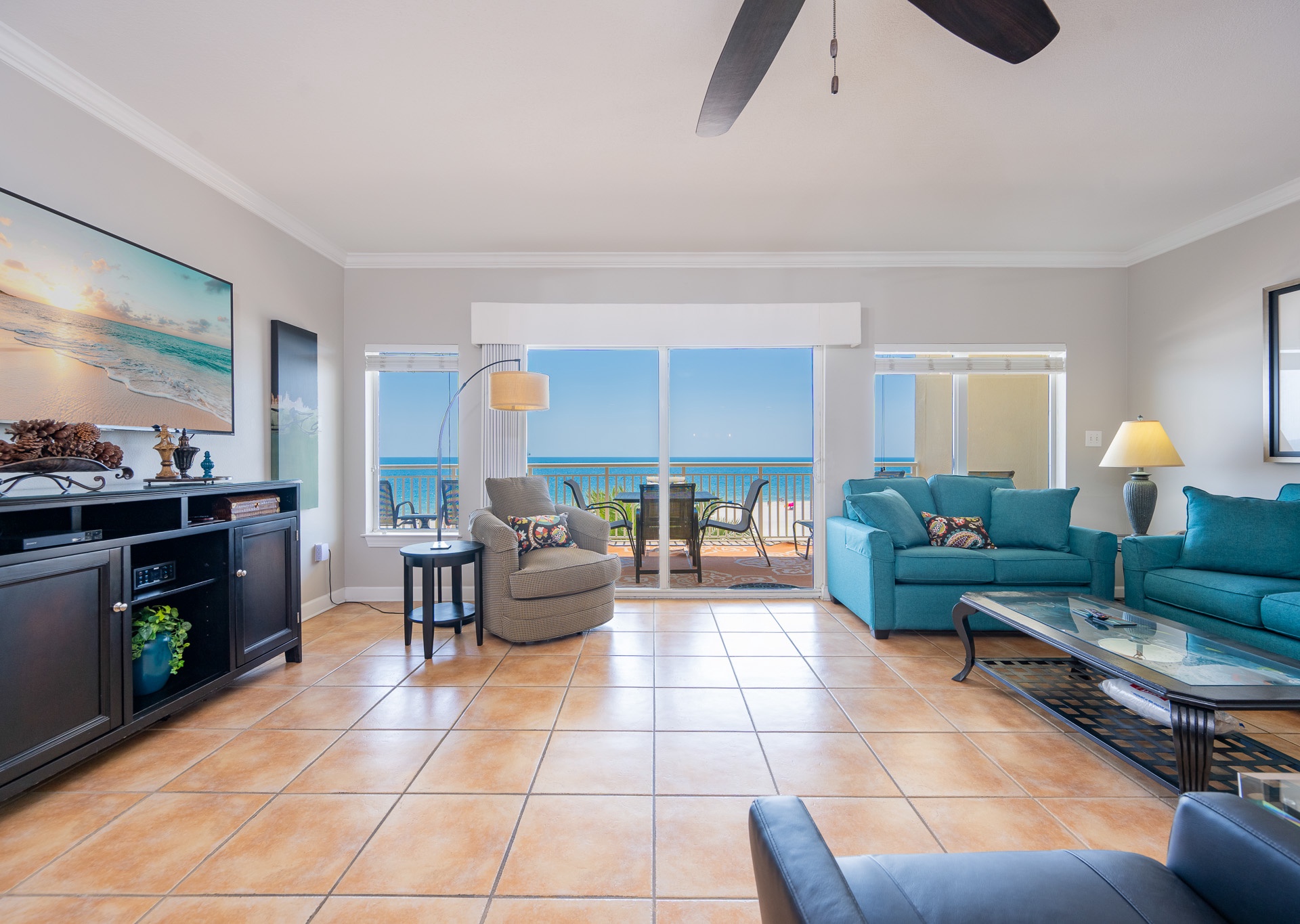 The open living area features comfortable furnishings and leads directly to a spacious Gulf-front balcony—perfect for enjoying the sea breeze and sunsets. The balcony includes plenty of seating, a dining table, and a chaise lounge for relaxing outdoors.