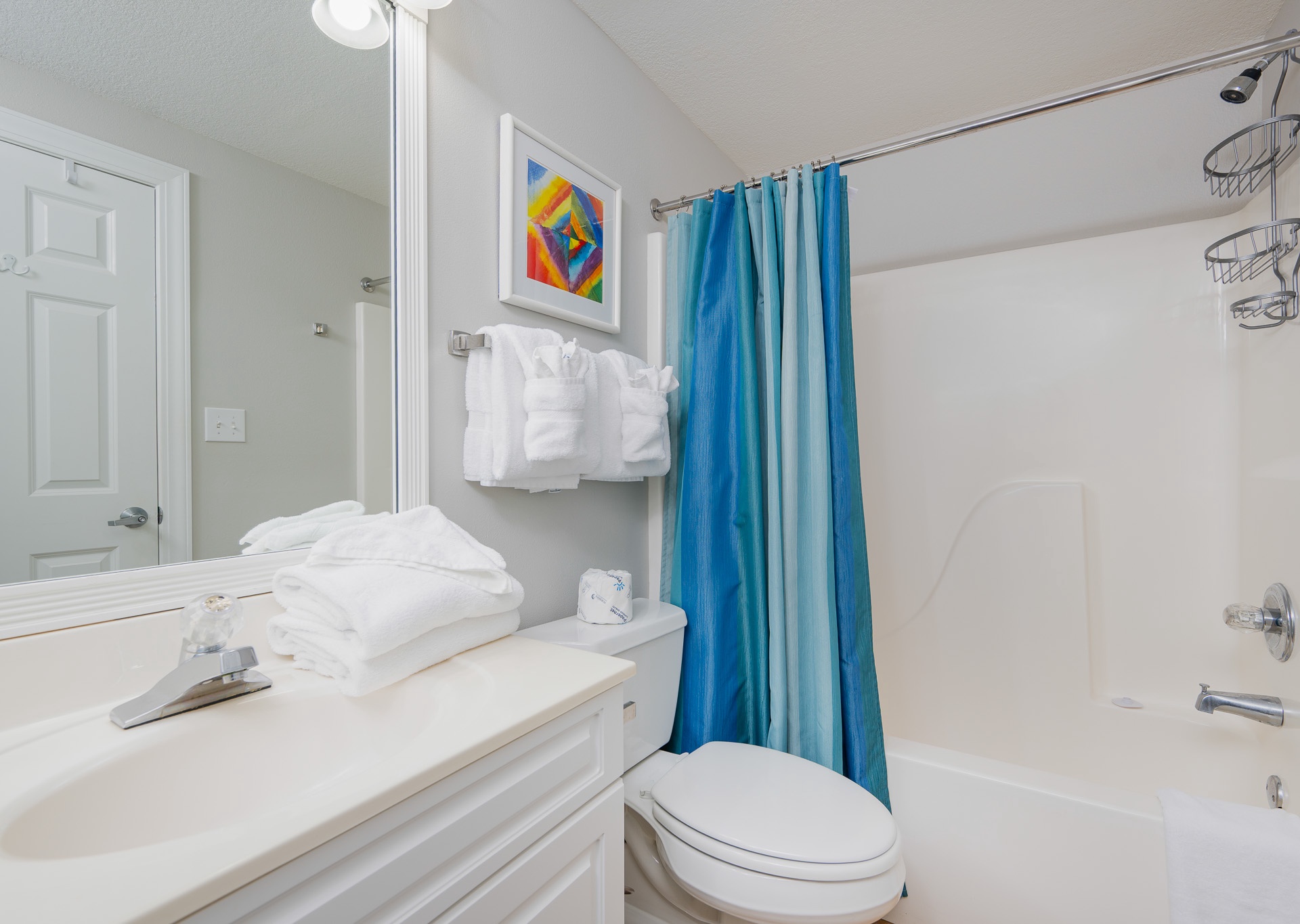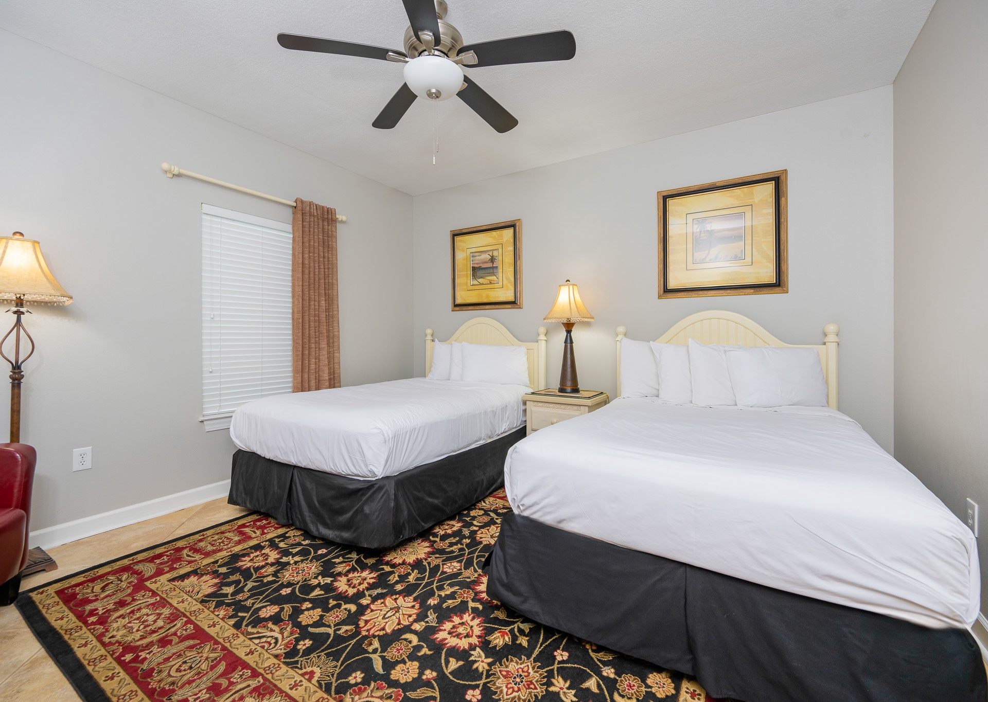 • 3rd Bedroom: Two full-size beds, flat-screen TV, access to third bathroom with single vanity and tub/shower combo