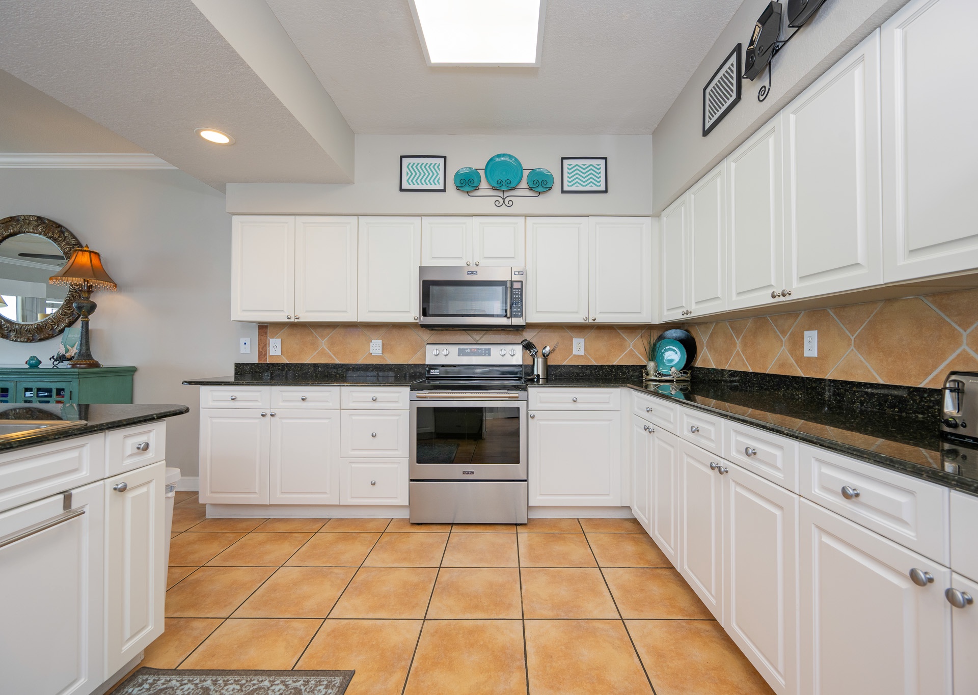 • Kitchen: White cabinetry, black granite countertops, stainless steel appliances, and fully equipped for all your culinary needs