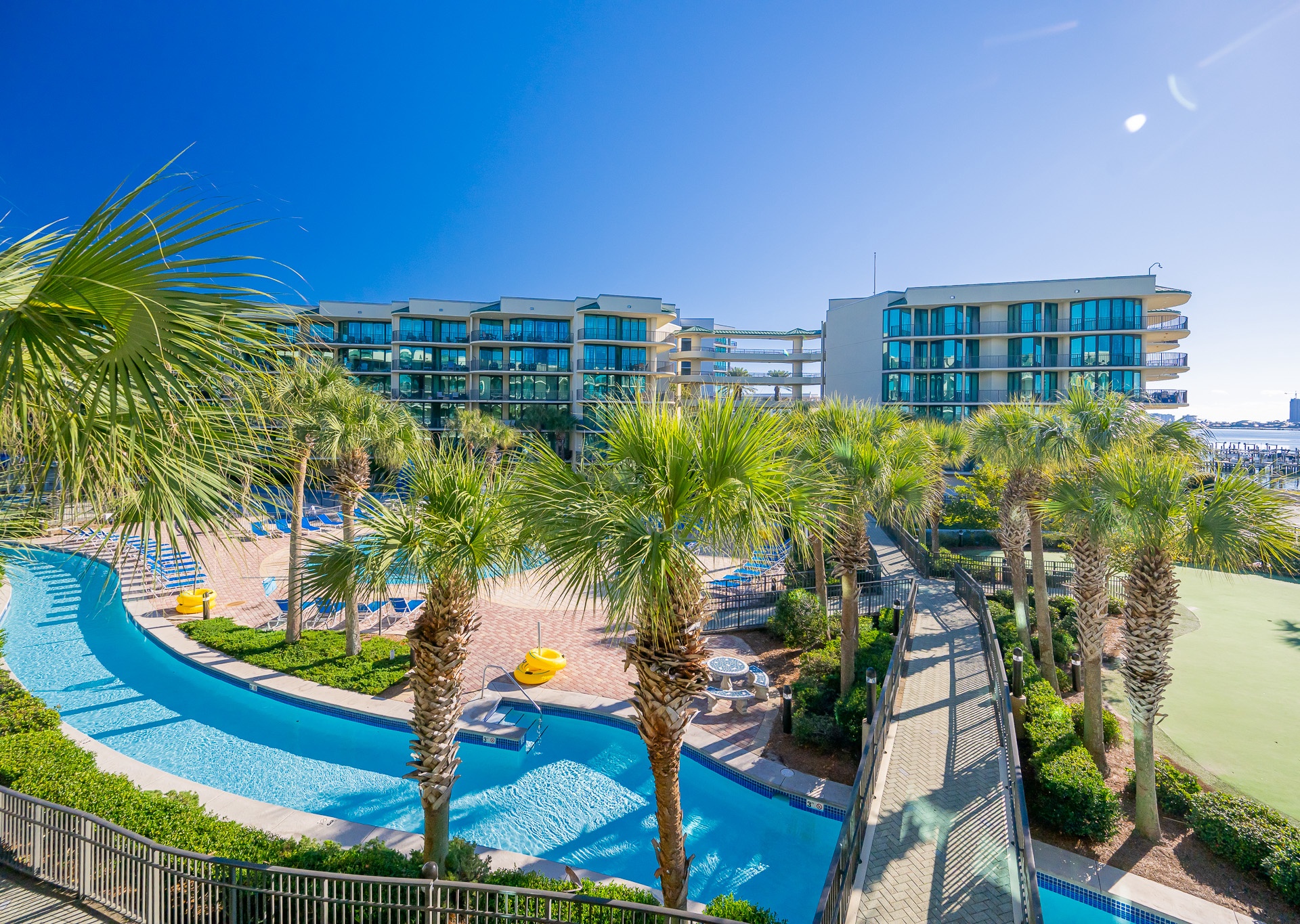 Phoenix on the Bay features several luxury amenities including: indoor and outdoor pools, kiddie pool, lazy river, slide, marina, boat slips, boat launch, sauna, steam room, hot tubs, fitness center, putting green, tennis court, pickleball court, basketball, covered parking, and barbeque grills.