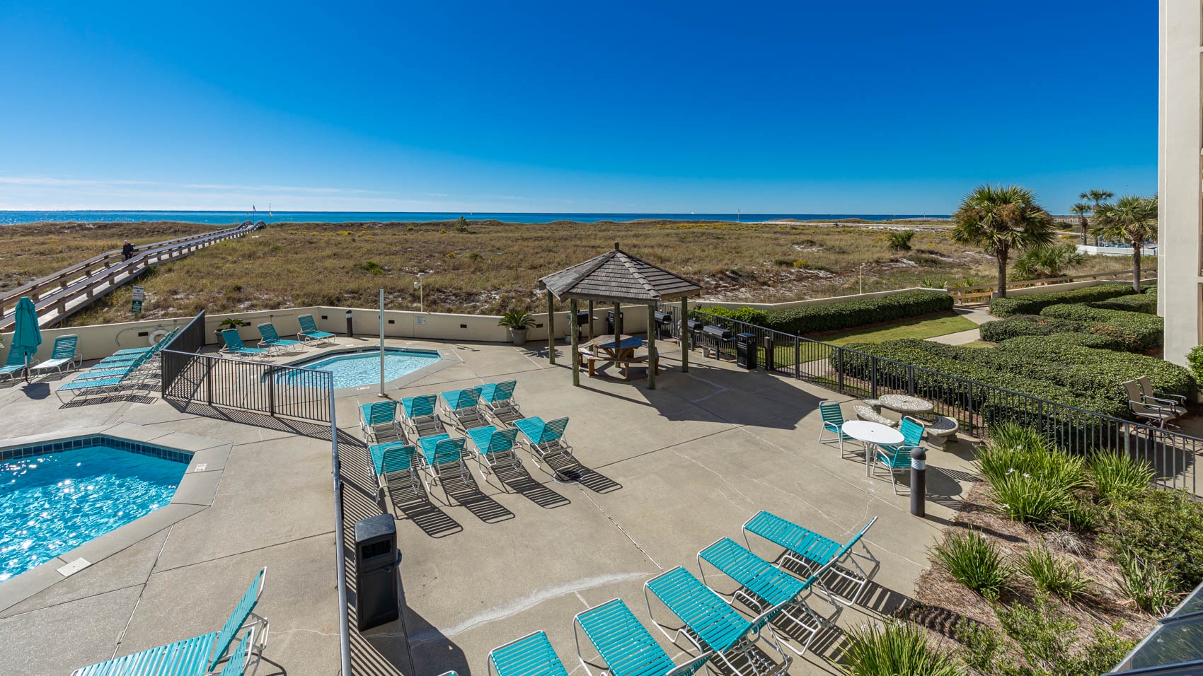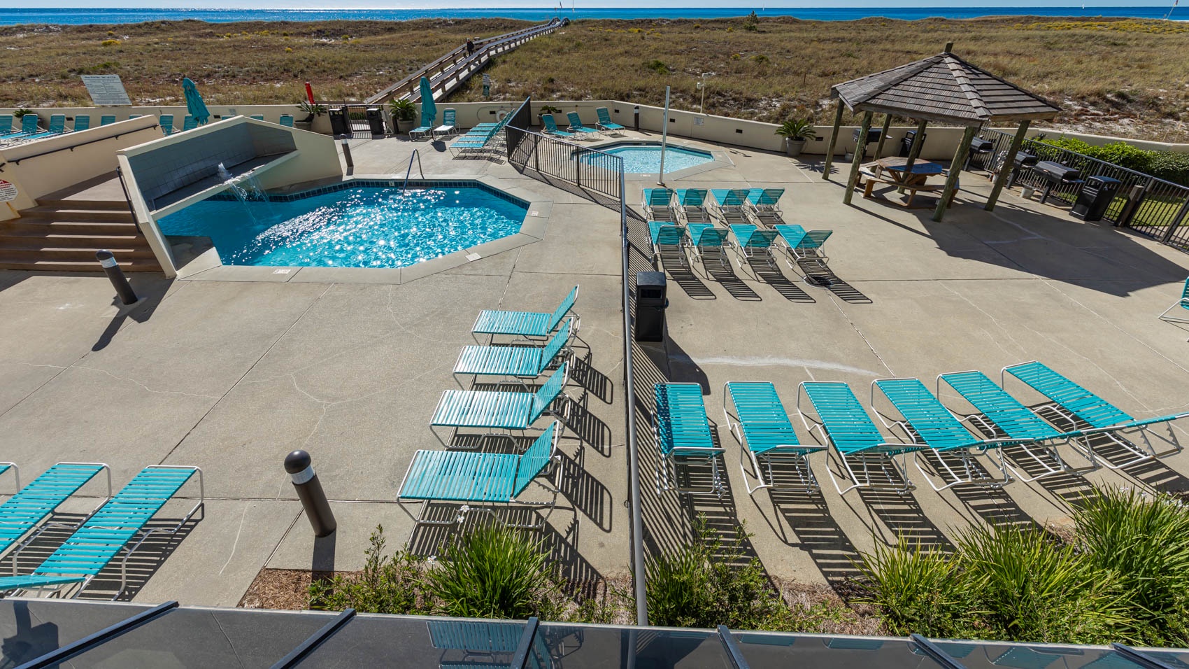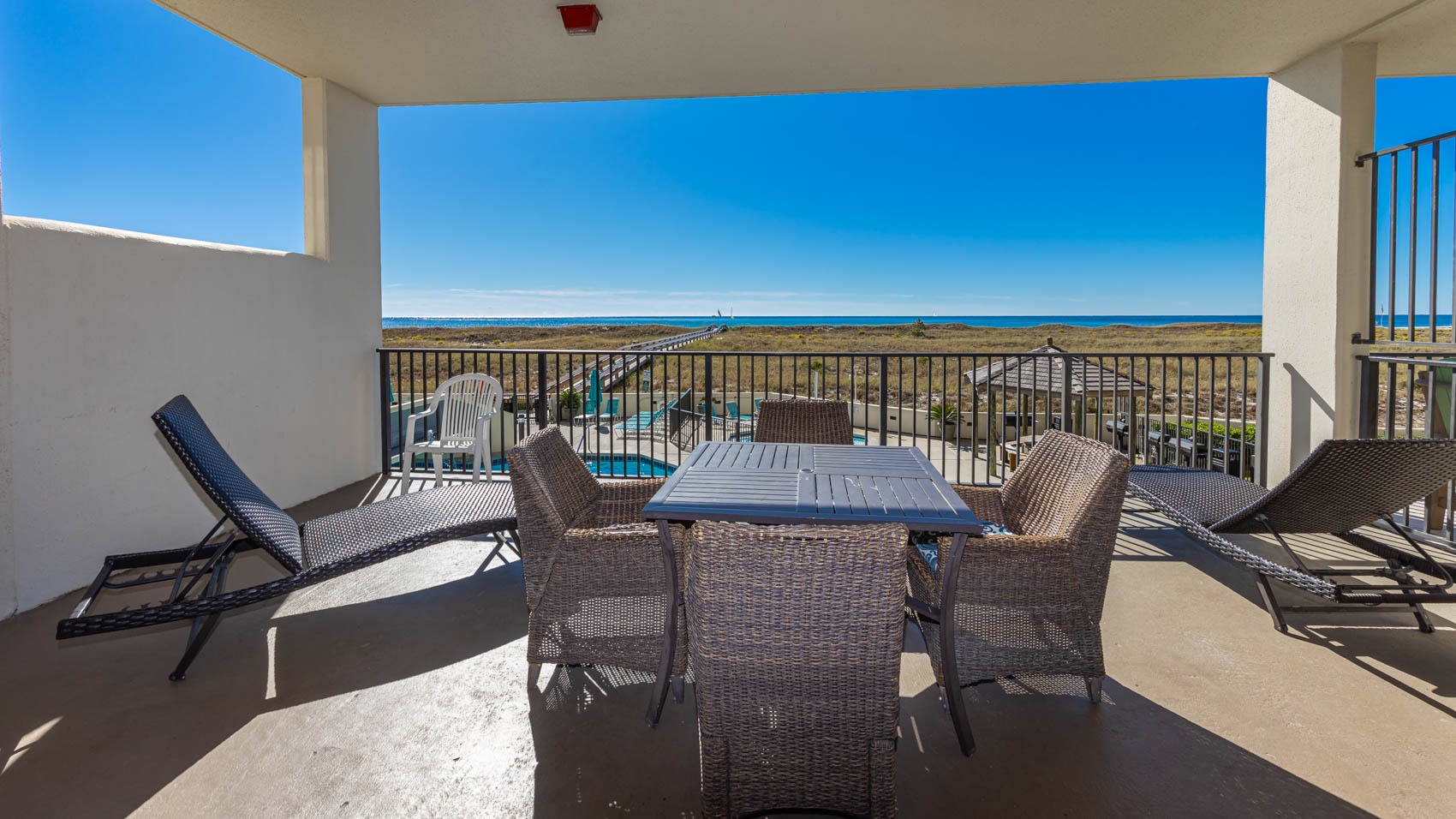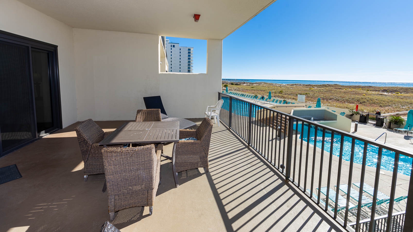 Step outside onto the large Gulf front balcony and prepare to be mesmerized by the stunning views. Overlooking the pool area and offering a glimpse of the Gulf, this outdoor oasis is the perfect spot for sipping morning coffee or enjoying evening cocktails with friends. Gather around the table and chairs for four, where you can dine al fresco while basking in the warm Gulf breeze.