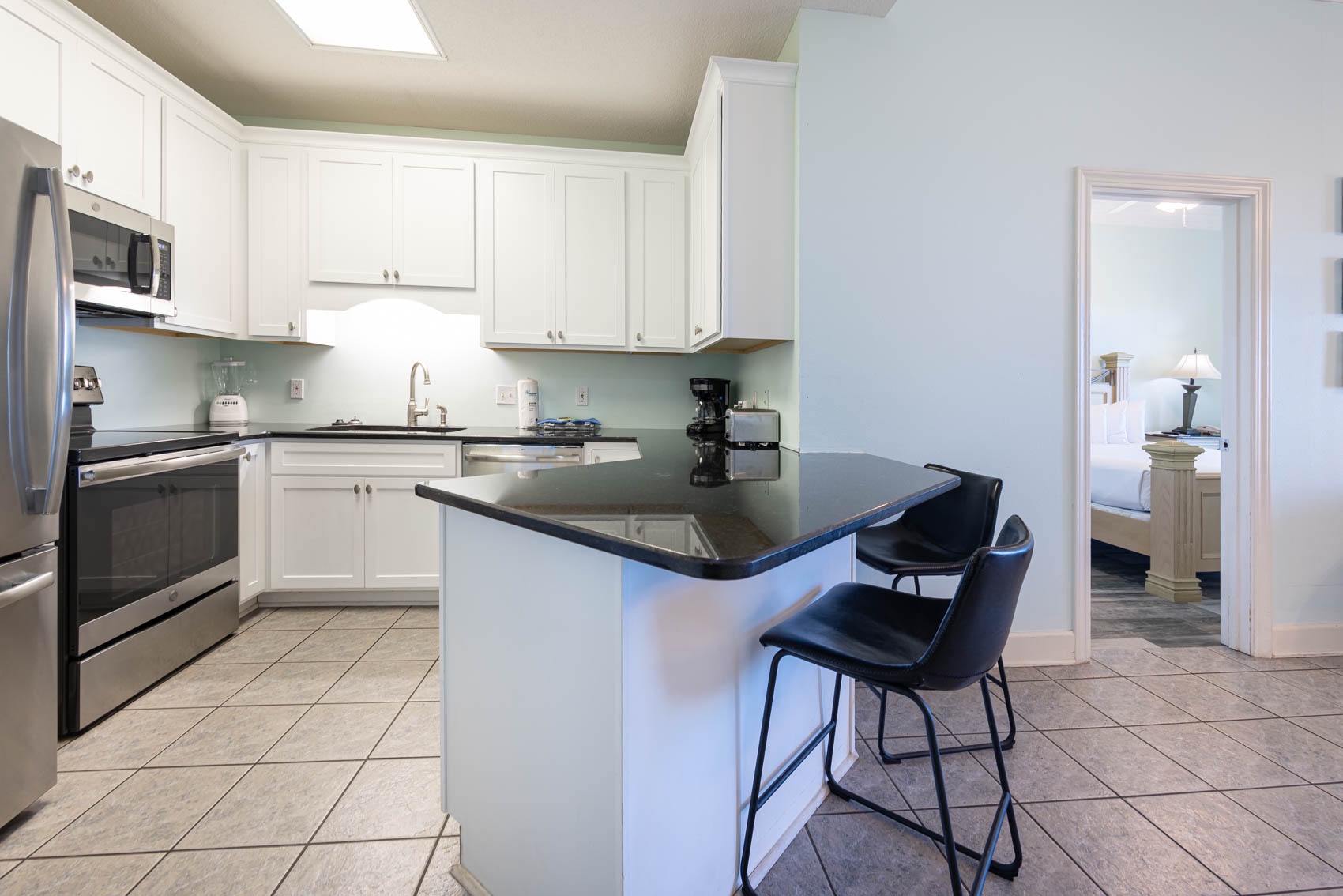 Kitchen: Prepare culinary delights in the fully equipped kitchen, featuring stainless steel appliances and granite countertops. The dining area offers a cozy setting for meals, with a table for four and two additional seats at the bar, providing ample space for entertaining guests or enjoying intimate dinners with loved ones.