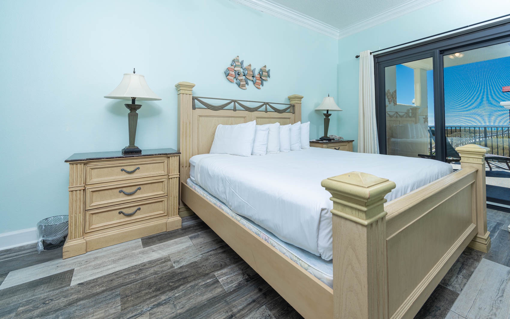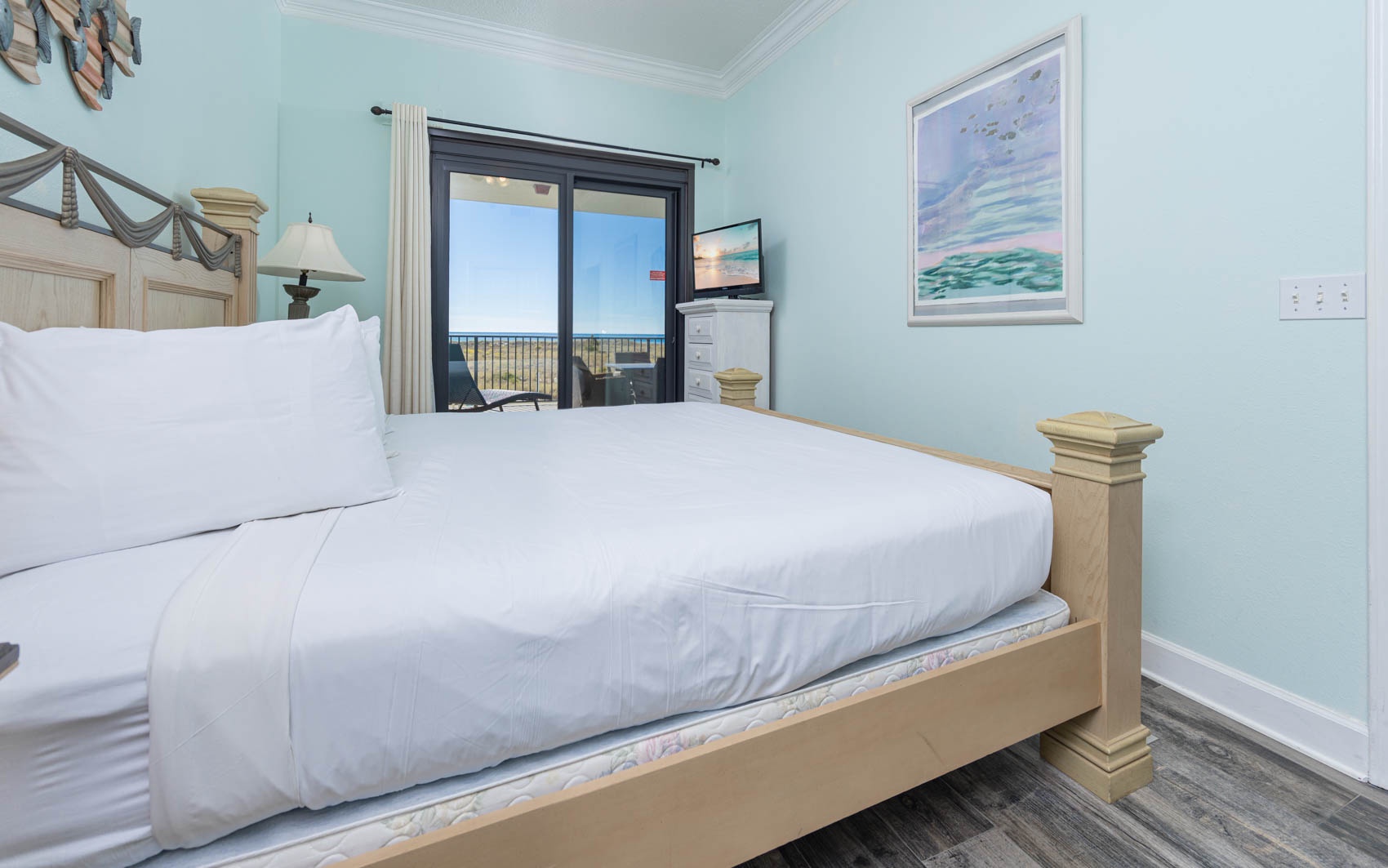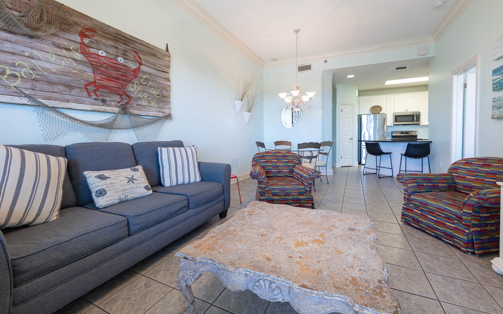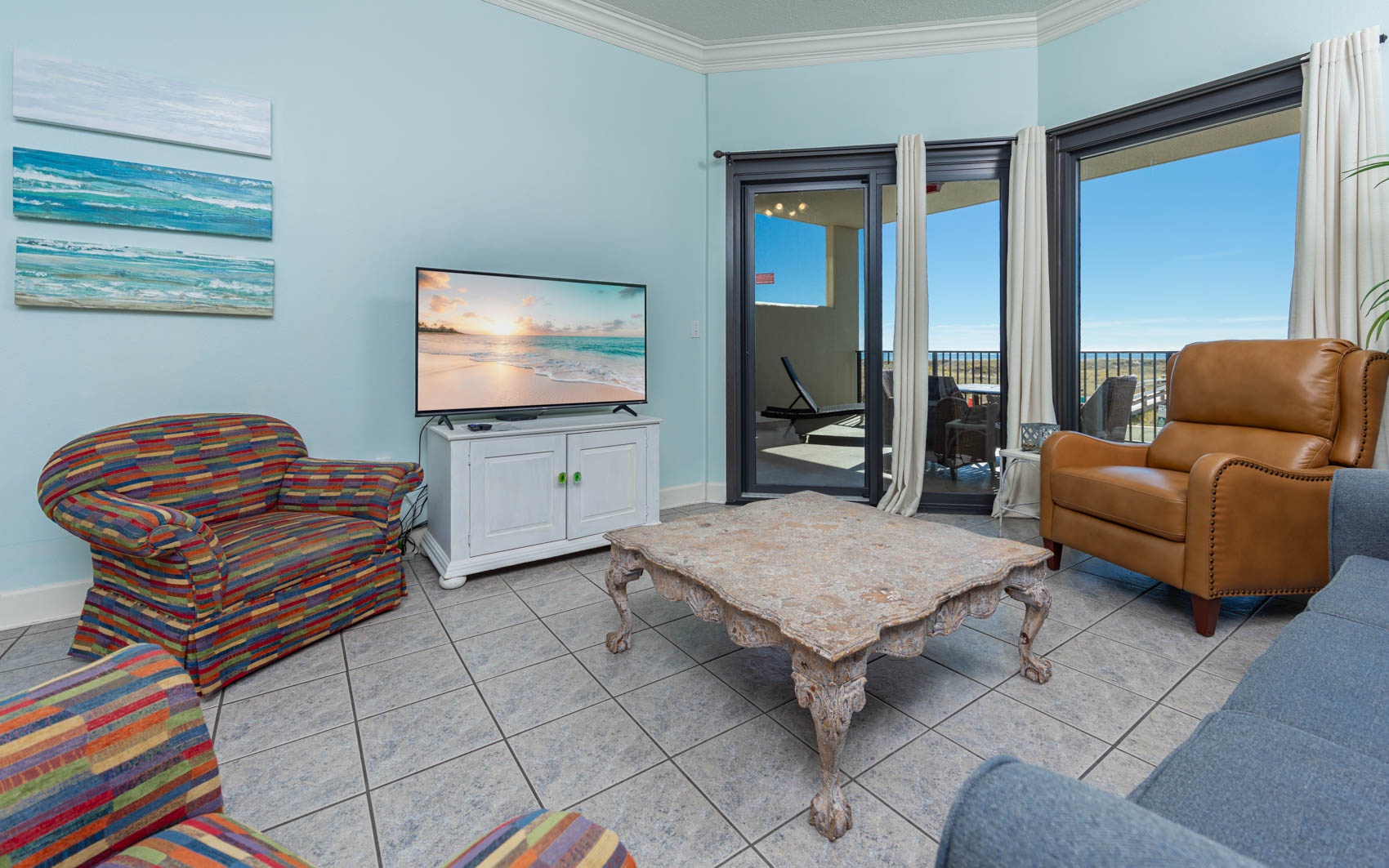 Interior: Step inside to discover a living area adorned with lively hues and playful accents, perfectly complementing the coastal charm of the surroundings. Sink into the queen-size sleeper sofa or one of the two colorful chairs and recliner, where you can unwind and soak in the coastal atmosphere. With tile flooring throughout, the space exudes both elegance and ease. Retreat to the master bedroom, where a plush king-size bed awaits. With wood-style flooring and direct entry onto the balcony, you can wake up to breathtaking views each morning and fall asleep to the soothing sound of the waves. The ensuite bathroom boasts a separate vanity area, adding a touch of luxury to your daily routine. The second bedroom is a vibrant haven, featuring two colorful full-size beds and convenient access to the common bathroom, making it ideal for families or groups traveling together.