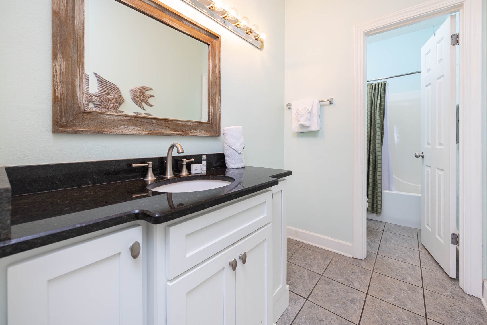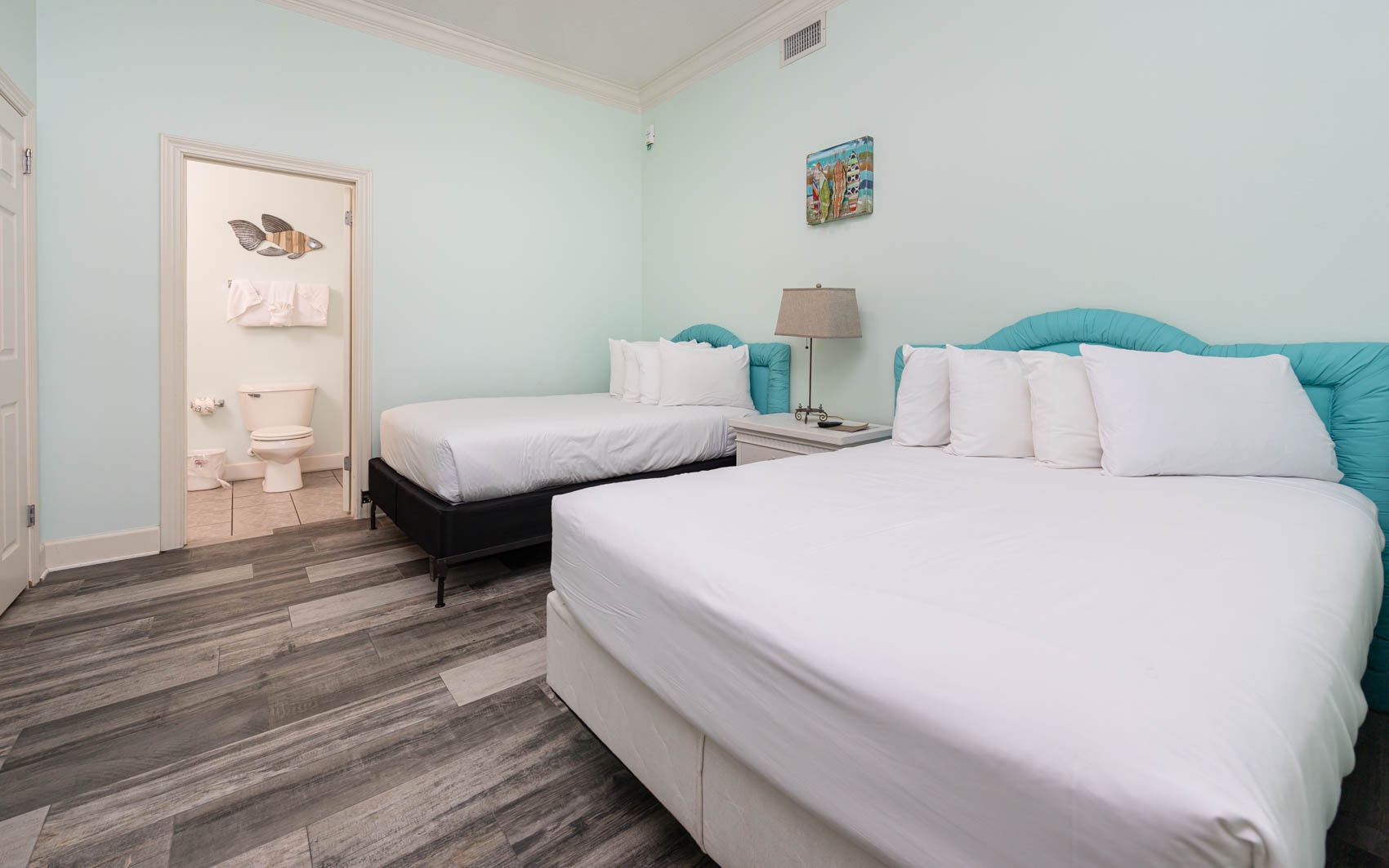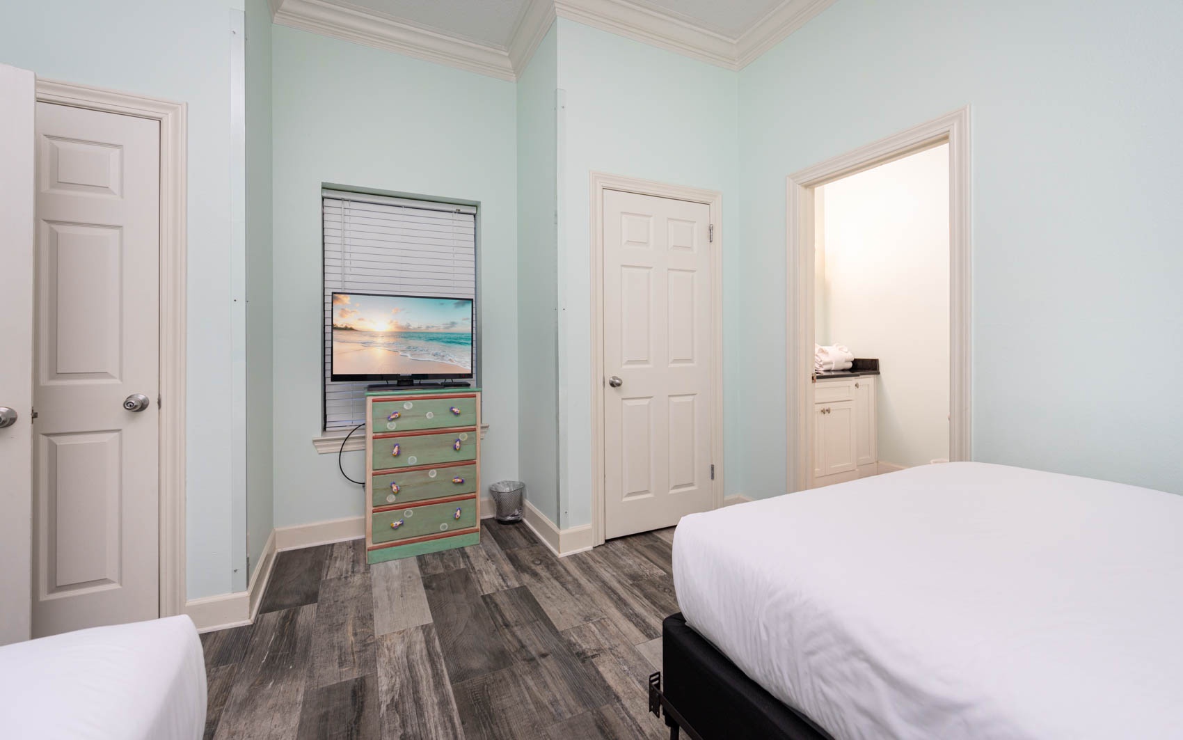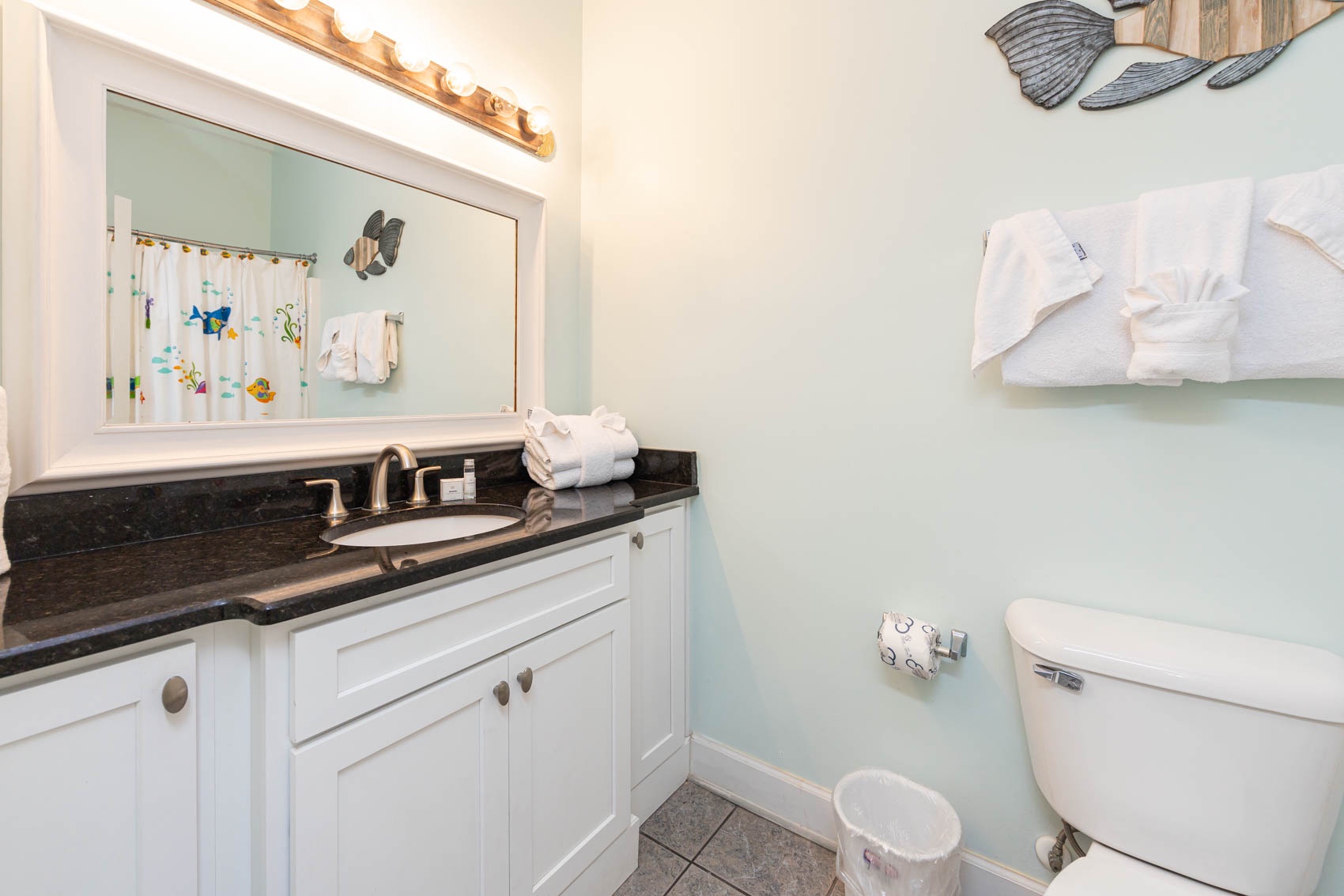 Interior: Step inside to discover a living area adorned with lively hues and playful accents, perfectly complementing the coastal charm of the surroundings. Sink into the queen-size sleeper sofa or one of the two colorful chairs and recliner, where you can unwind and soak in the coastal atmosphere. With tile flooring throughout, the space exudes both elegance and ease. Retreat to the master bedroom, where a plush king-size bed awaits. With wood-style flooring and direct entry onto the balcony, you can wake up to breathtaking views each morning and fall asleep to the soothing sound of the waves. The ensuite bathroom boasts a separate vanity area, adding a touch of luxury to your daily routine. The second bedroom is a vibrant haven, featuring two colorful full-size beds and convenient access to the common bathroom, making it ideal for families or groups traveling together.